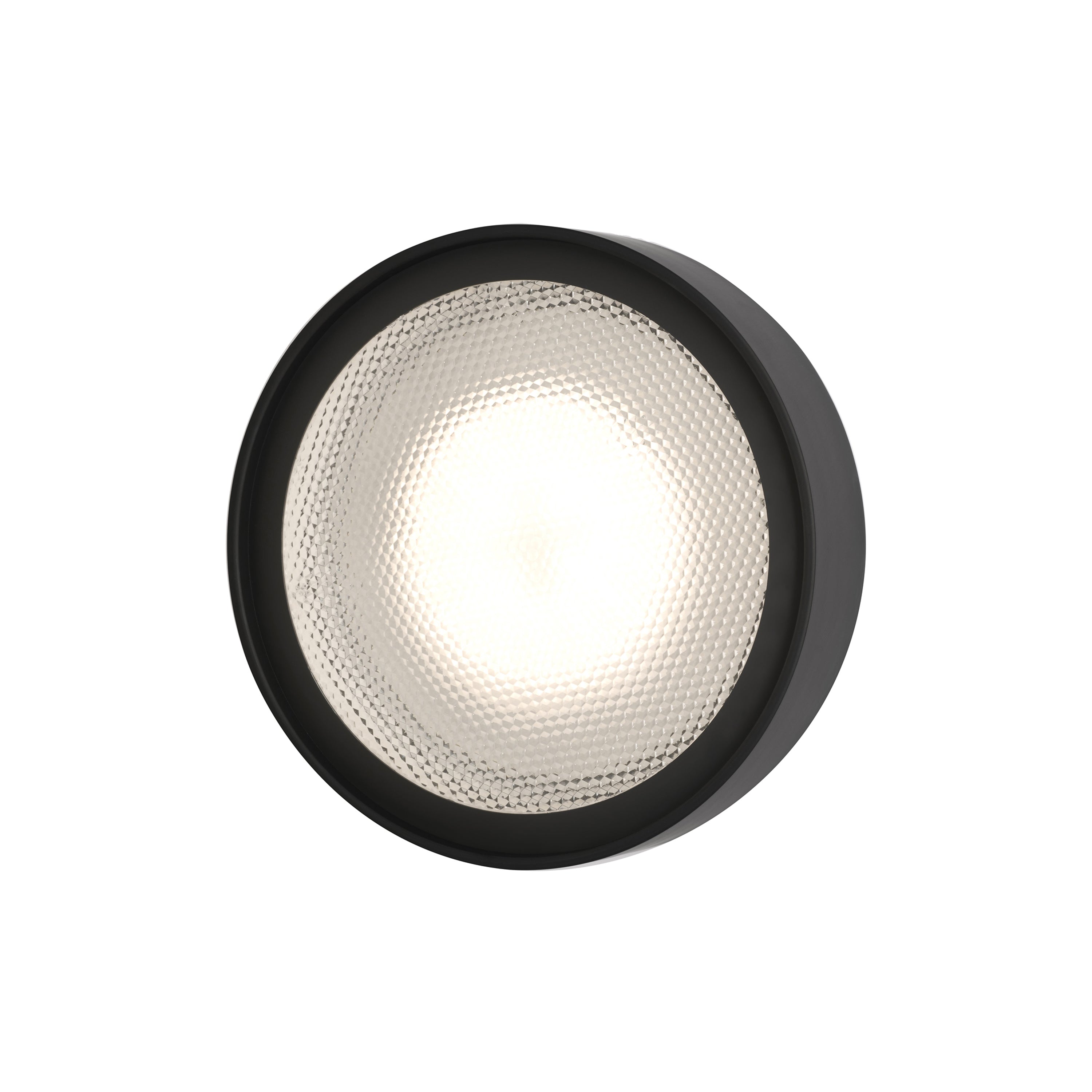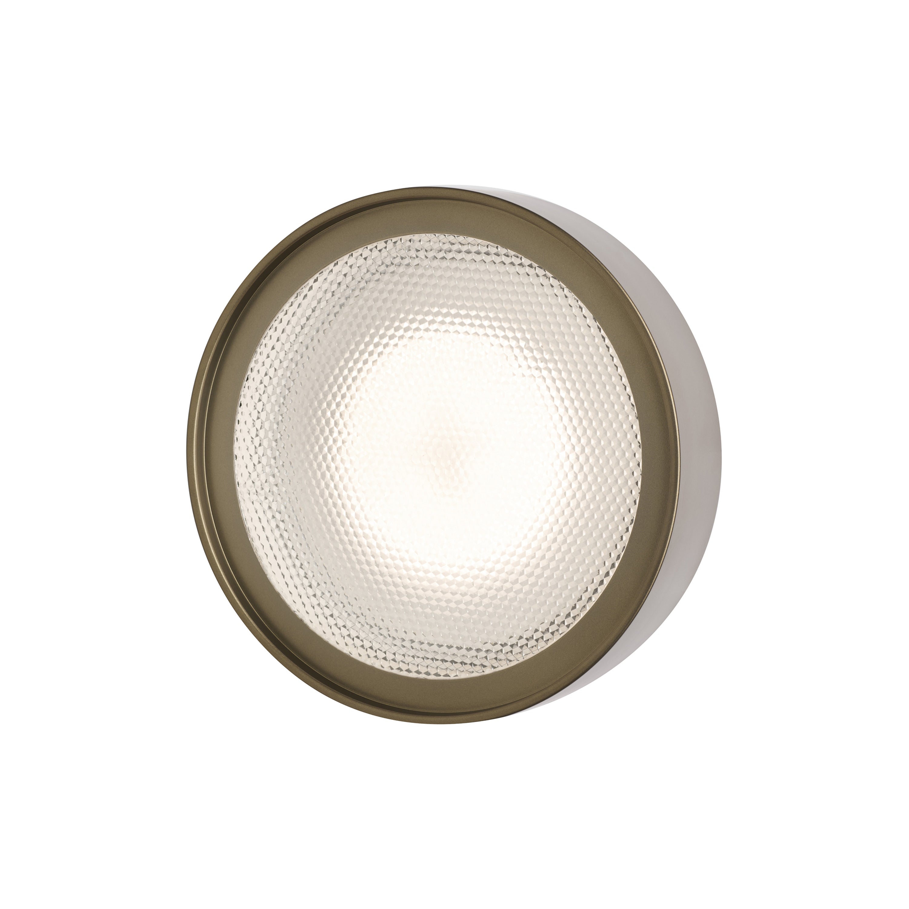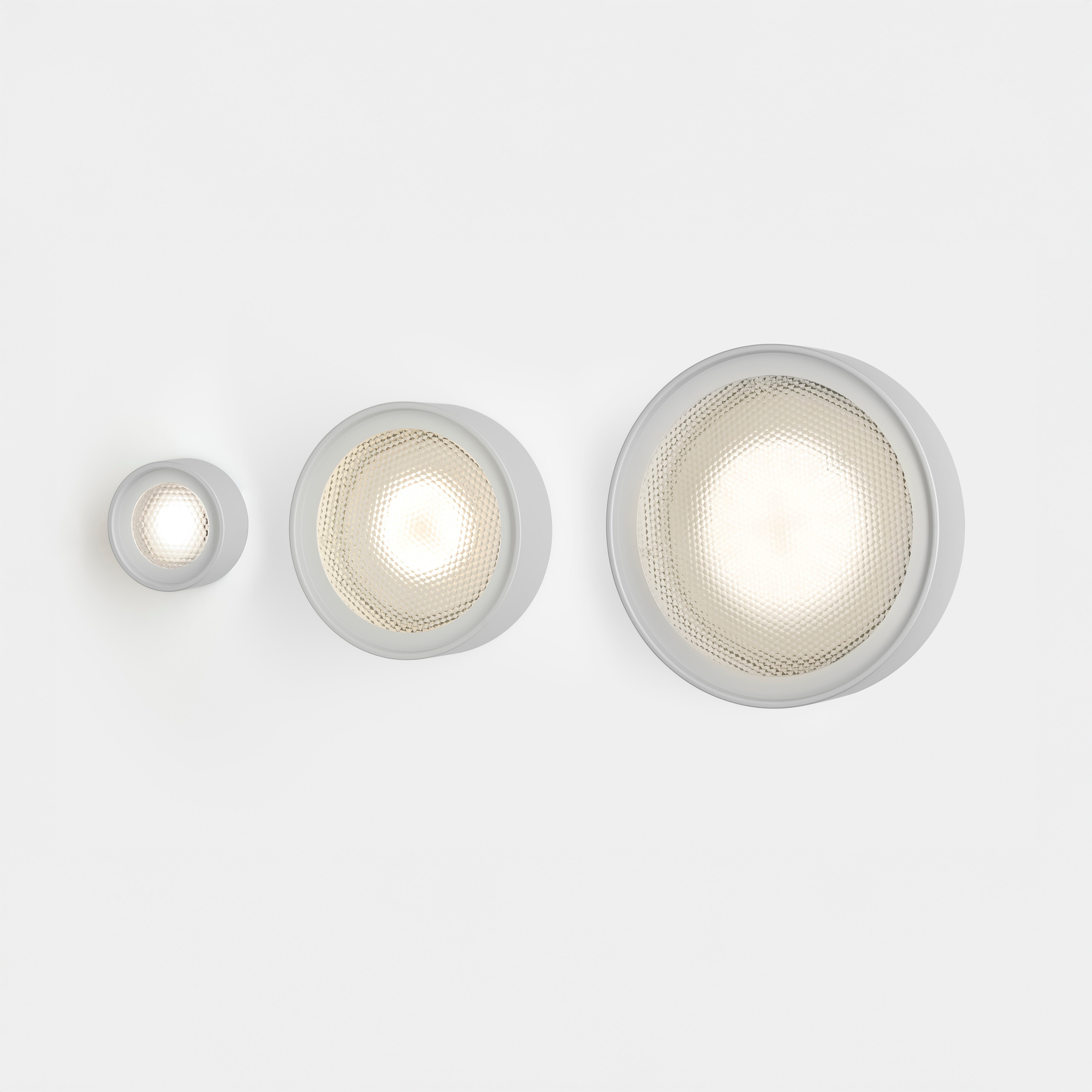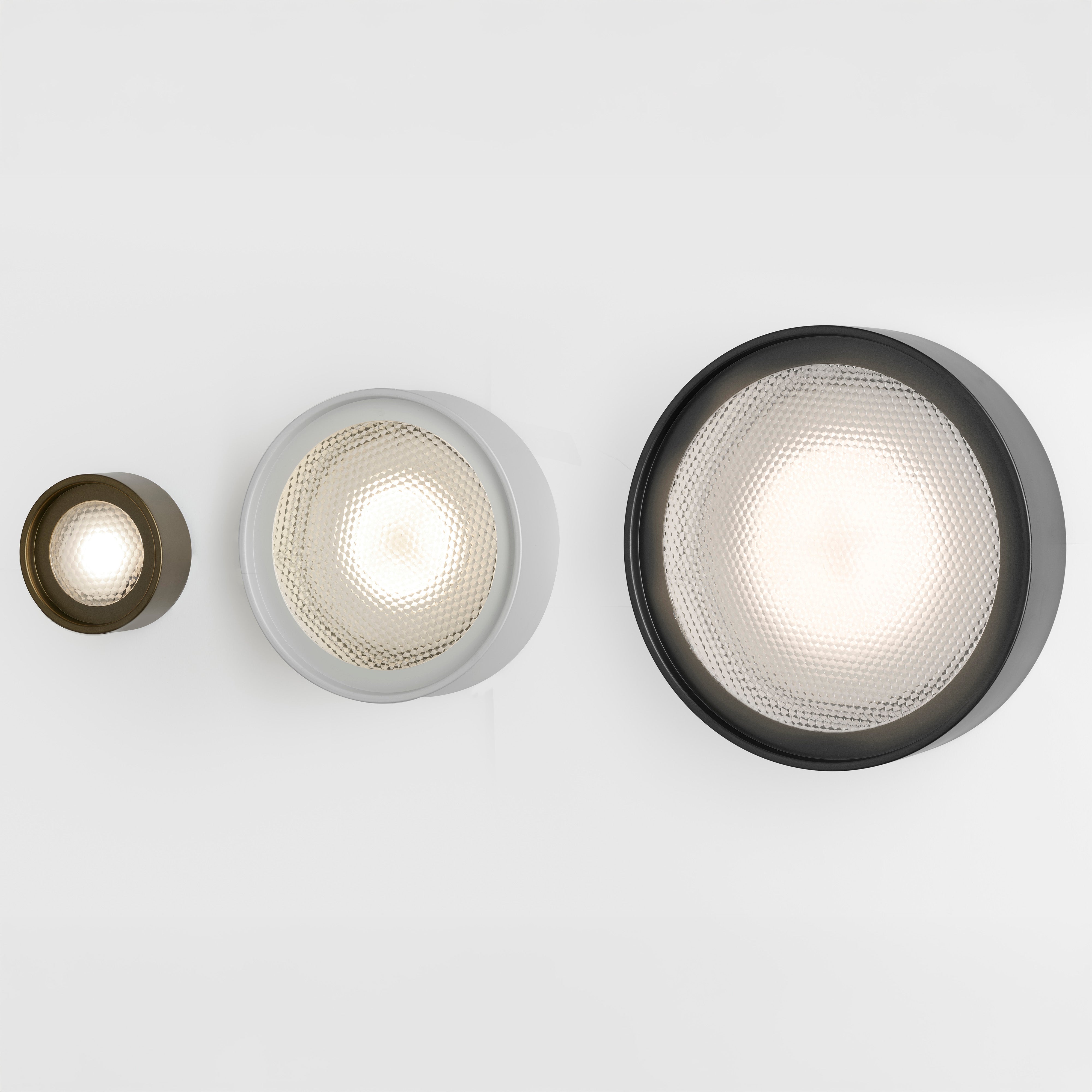 A slim metal ring encases a honeycomb-textured acrylic disc engineered to withstand humidity, making it well-suited for bathroom or outdoor use. Available in 3 sizes and finishes.