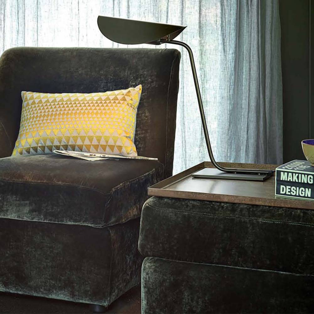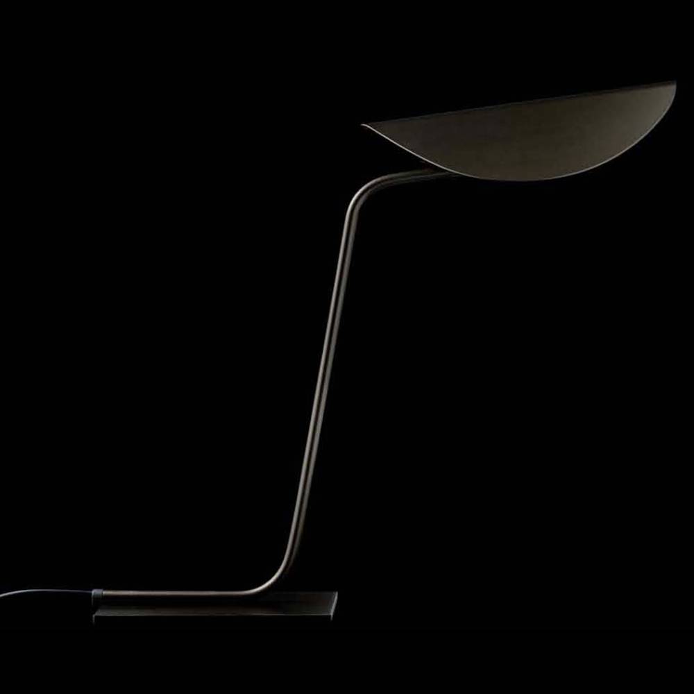 The Plume Table Lamp features a slender, curved metal structure supporting a thin, centrally folded metal shade that evokes the form of a feather. Its anodic bronze finish adds a refined touch to the design. The Plume provides direct lighting, making it suitable for desks or bedside tables.