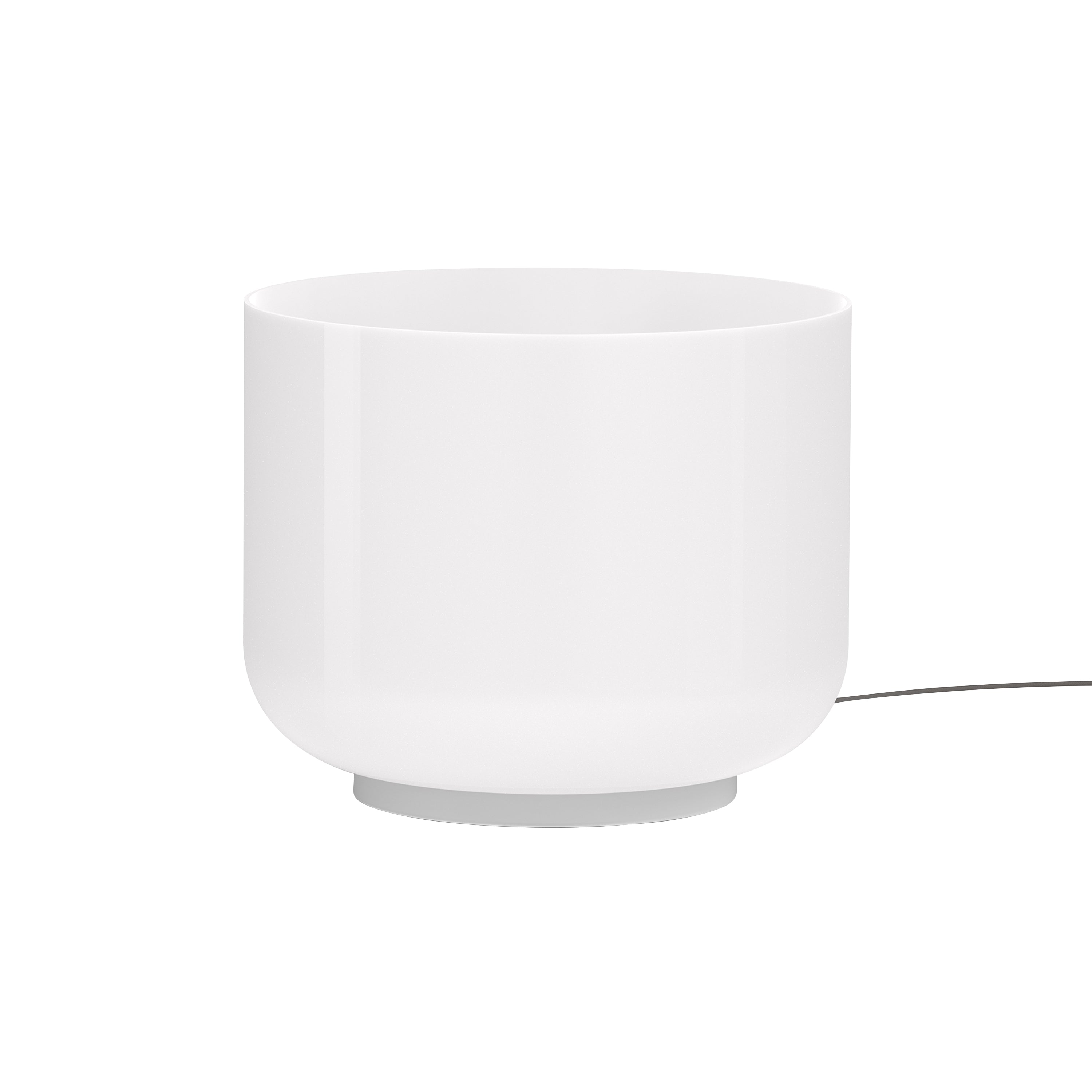 The Totem Table Lamp Single features exquisitely blown opal glass shades. The lamp provides both uplight and downlight through its geometric, modular design, creating a soft, ambient glow. It features dimmable LED technology allowing for a warm, adjustable light (2700K-2200K). This lamp also includes a fabric-sleeved cord and an in-line rotary dimmer. Available in 2 sizes.