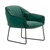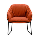 This armchair features a supportive seat set on a sturdy steel sled base with a black epoxy-coated finish. The fixed upholstery is available in a curated range of fabrics.