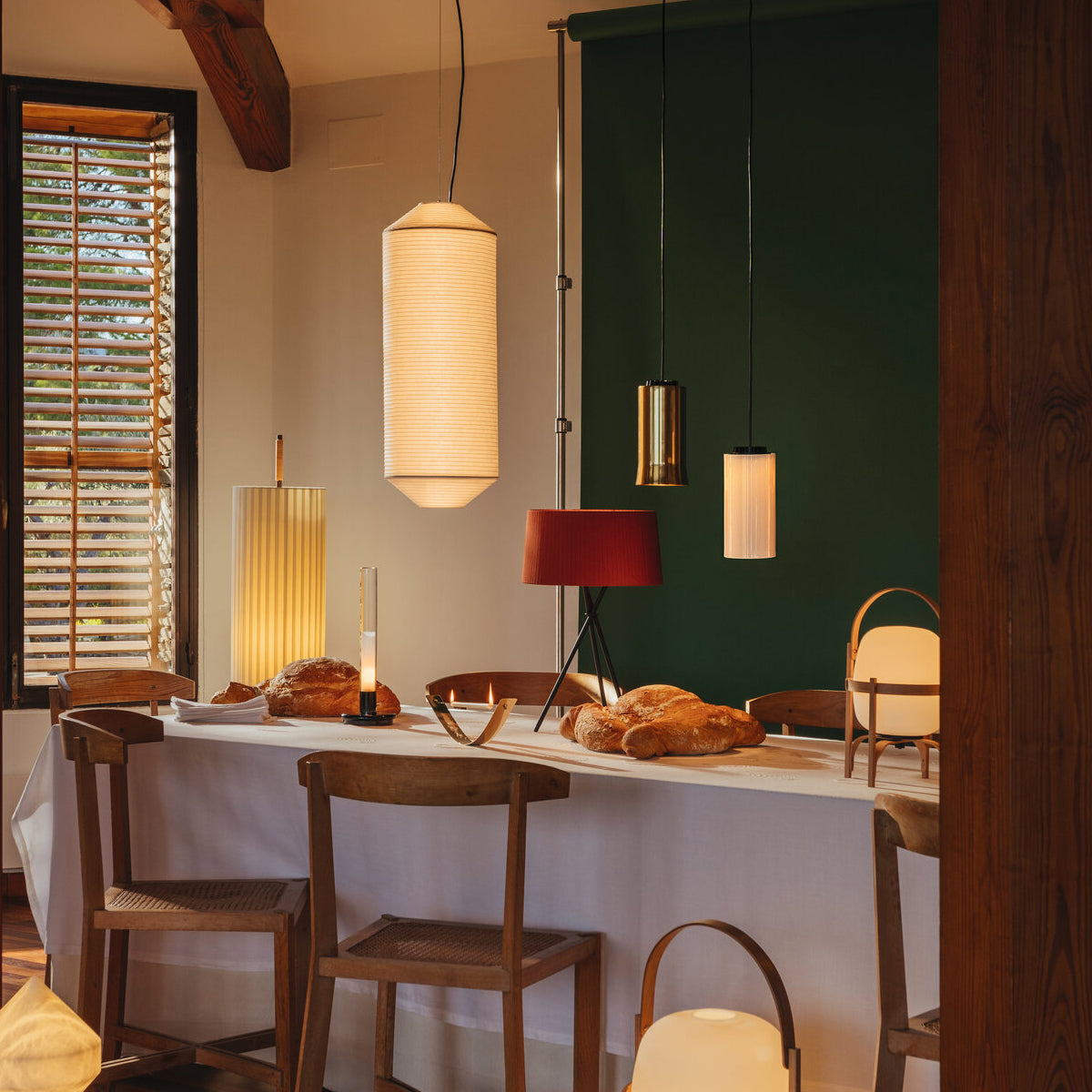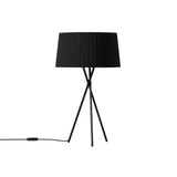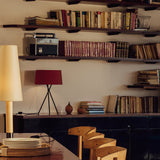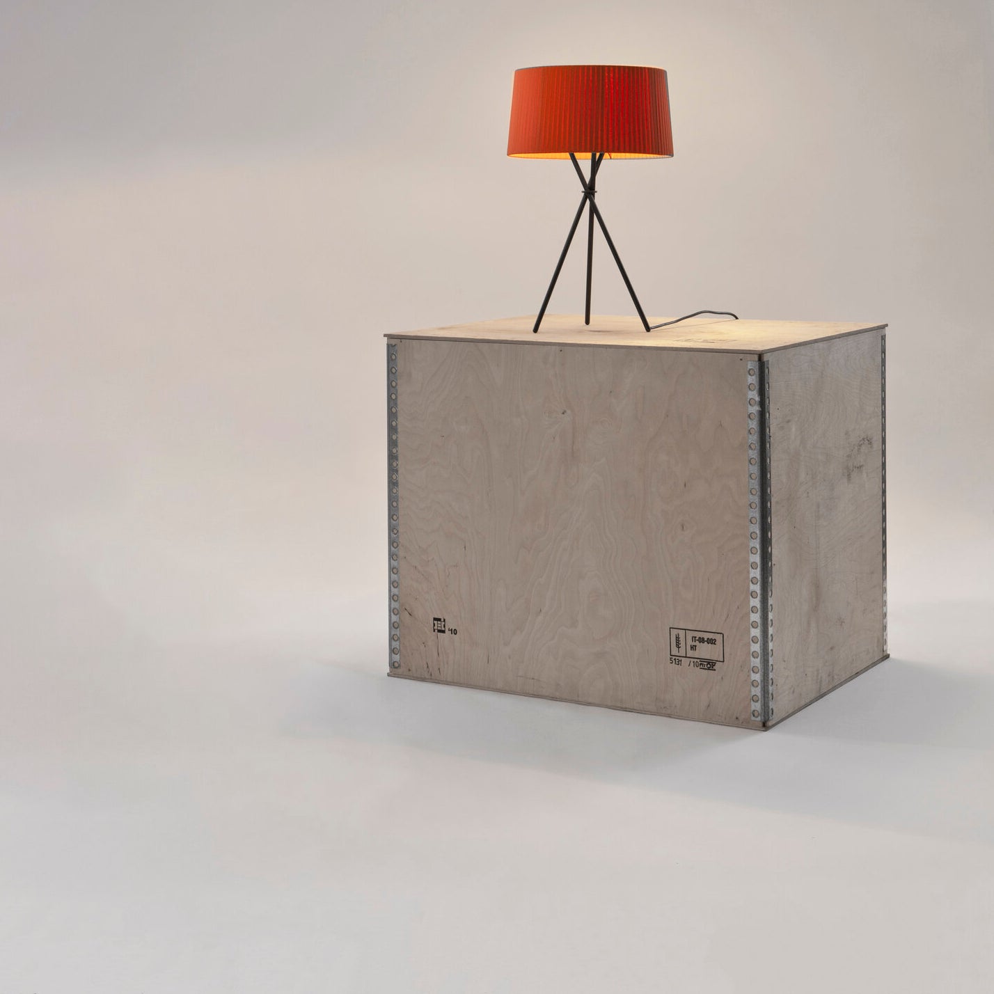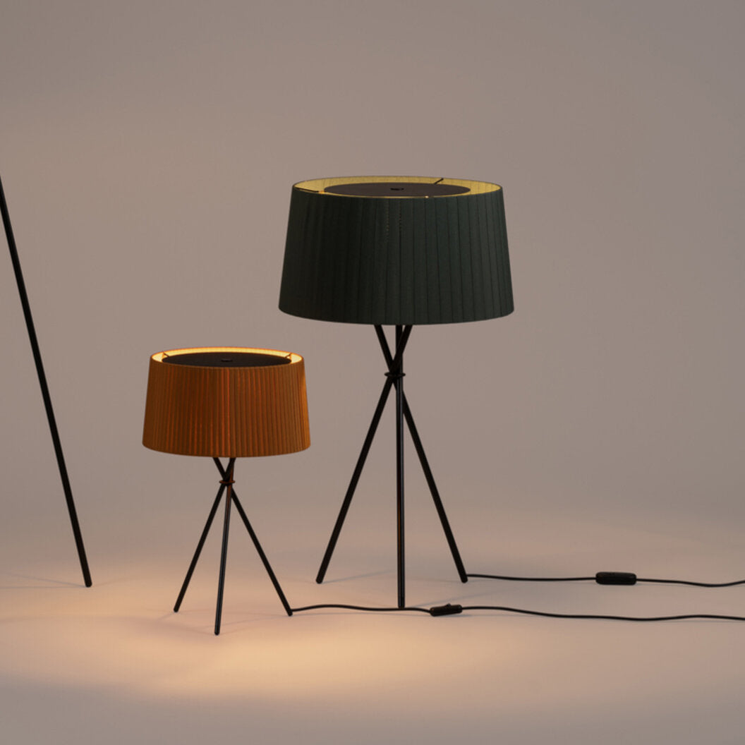 Santa & Cole scales down its sleek Trípode in an arresting table lamp version with the characteristic black metal 3-legged base and hand-fashioned ribbon shade. Available in 2 sizes, it emits a fully nuanced, warm illumination when turned on and serves as a sculptural statement piece when turned off. Each shade is handmade in neutral natural or black or a range of distinctive colors including terracotta, mustard yellow and forest green in a collaboration with Dutch studio Raw Color.