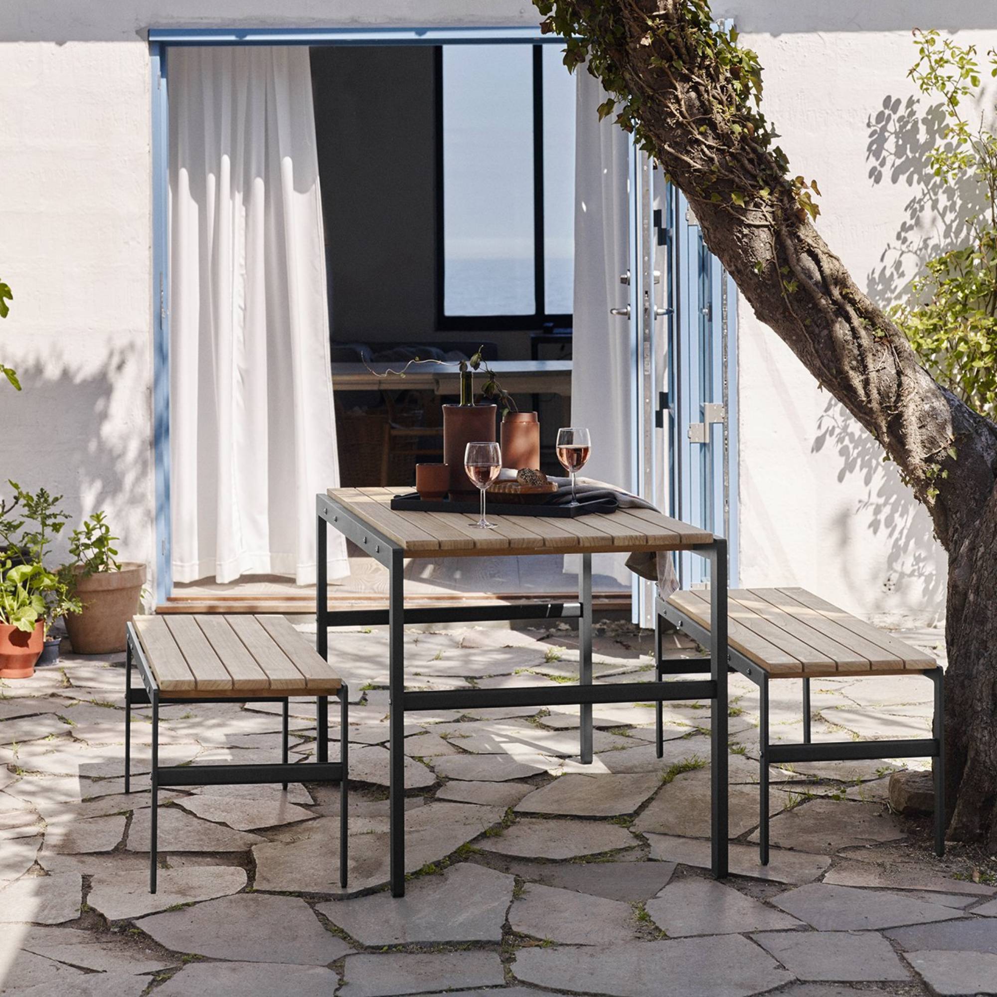 Industrial and natural design elements come together in the Reform series by Swedish designer Louise Hederström for Skagerak, a stout table and bench duo that combines powder-coated aluminum framework with, in this case, untreated teak. Polished fittings lend a contemporary finish.