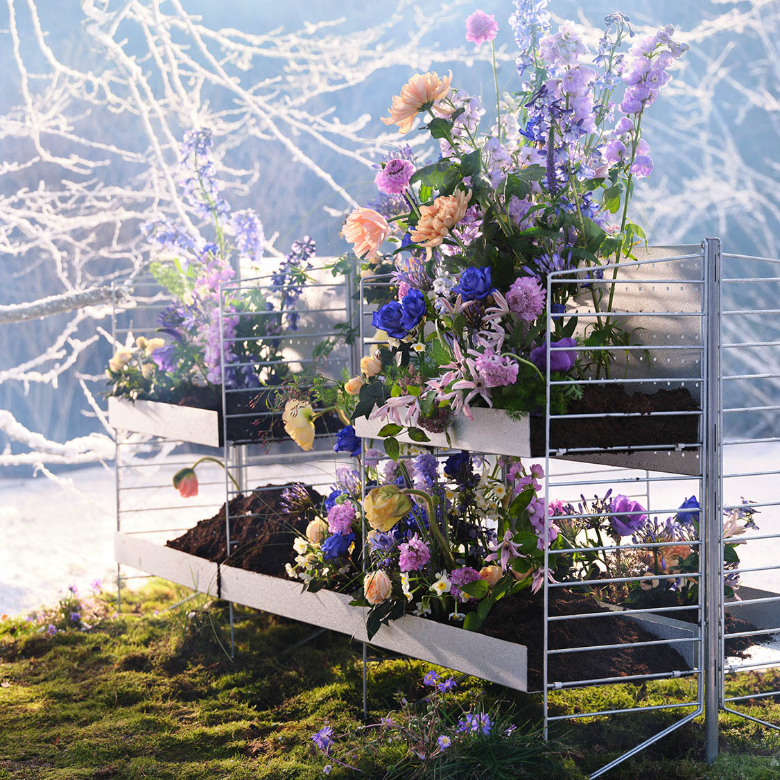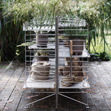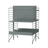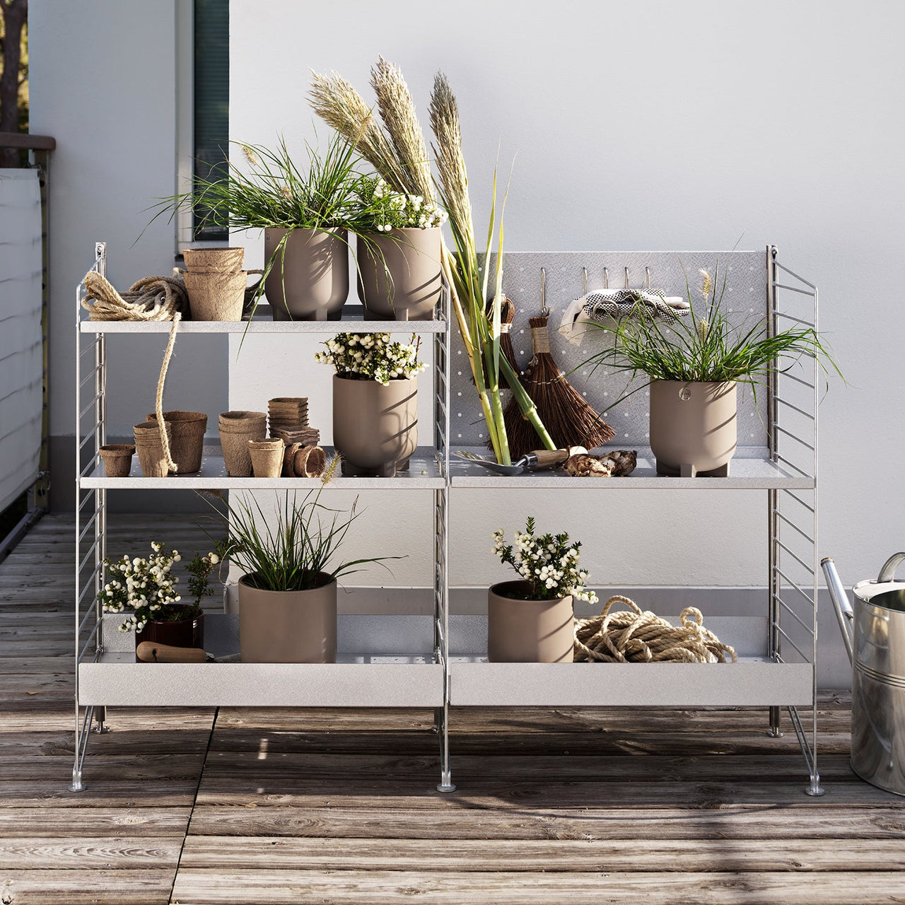 A freestanding preconfigured outdoor storage unit, this smaller one-section combination is optimized with its bottom shelf sectioned in half to aid in organization and provide access from both sides. A mix of metal shelves with a high and low edge further enhance the storage possibilities while a back panel accommodates hooks for hanging items. The galvanized surface acquires a fine patina over time and the unit is also completely expandable with other String outdoor pieces.