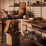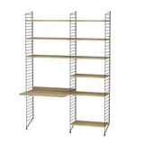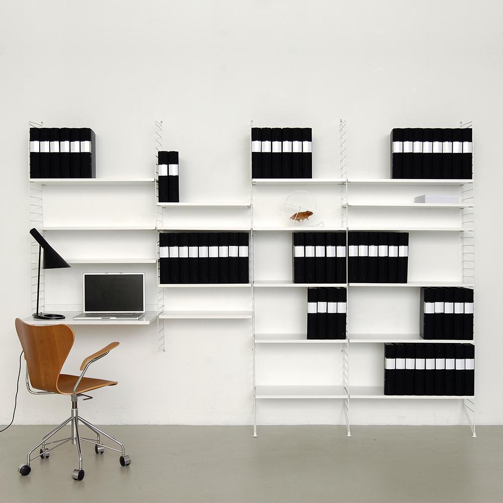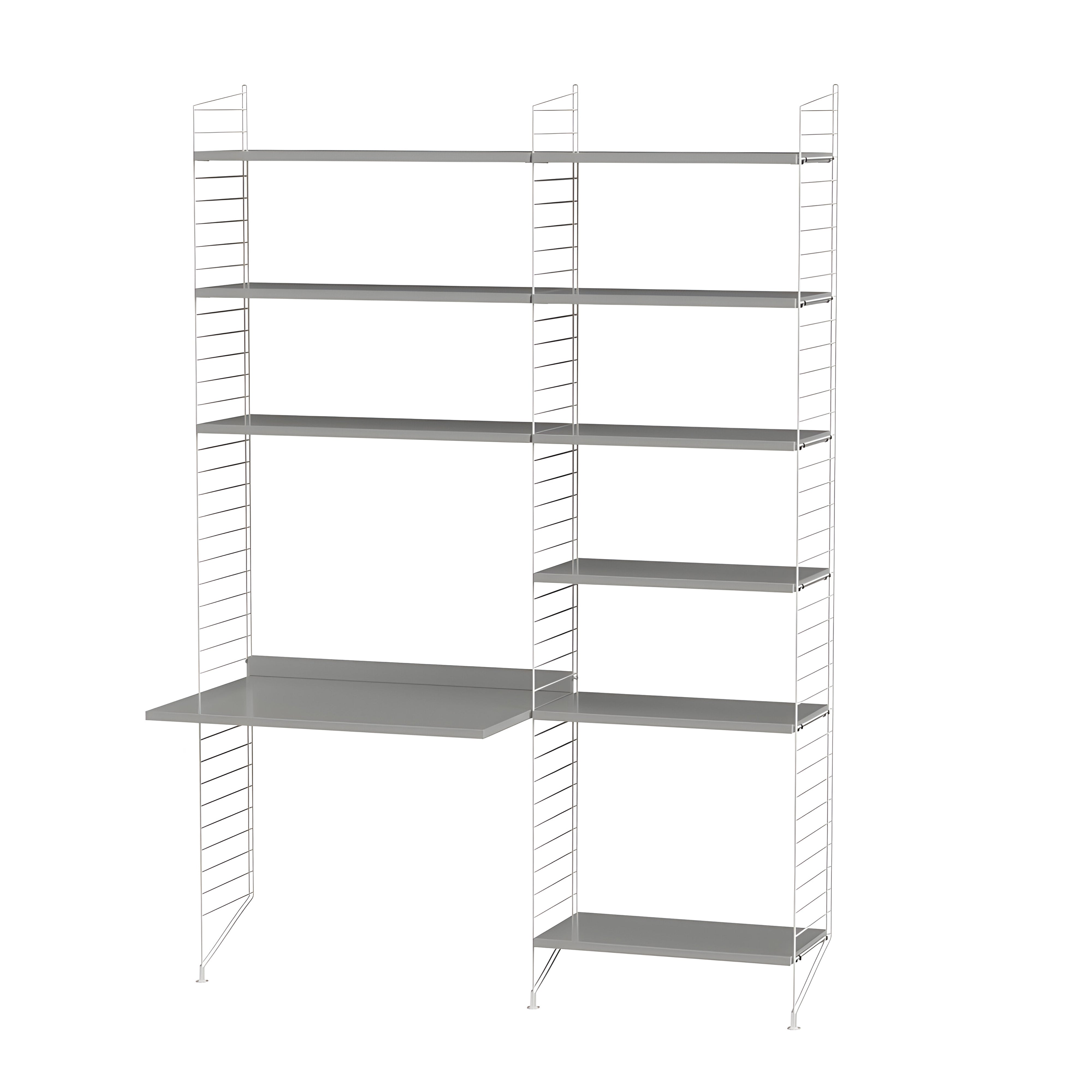 String doubles up in 2 floor-mounted bays with multiple shelves and an expanded desktop in this pre-selected composition for a home or office workspace. With storage for books or other record-keeping above, it also provides additional shelves within easy reach of the desktop. Available in woodgrain veneer or painted finishes with the signature coated-wire frame, String's bundles are also infinitely expandable for future needs, as generations of devotees have discovered since the 1949 debut of Nisse Strinning's innovative system.
