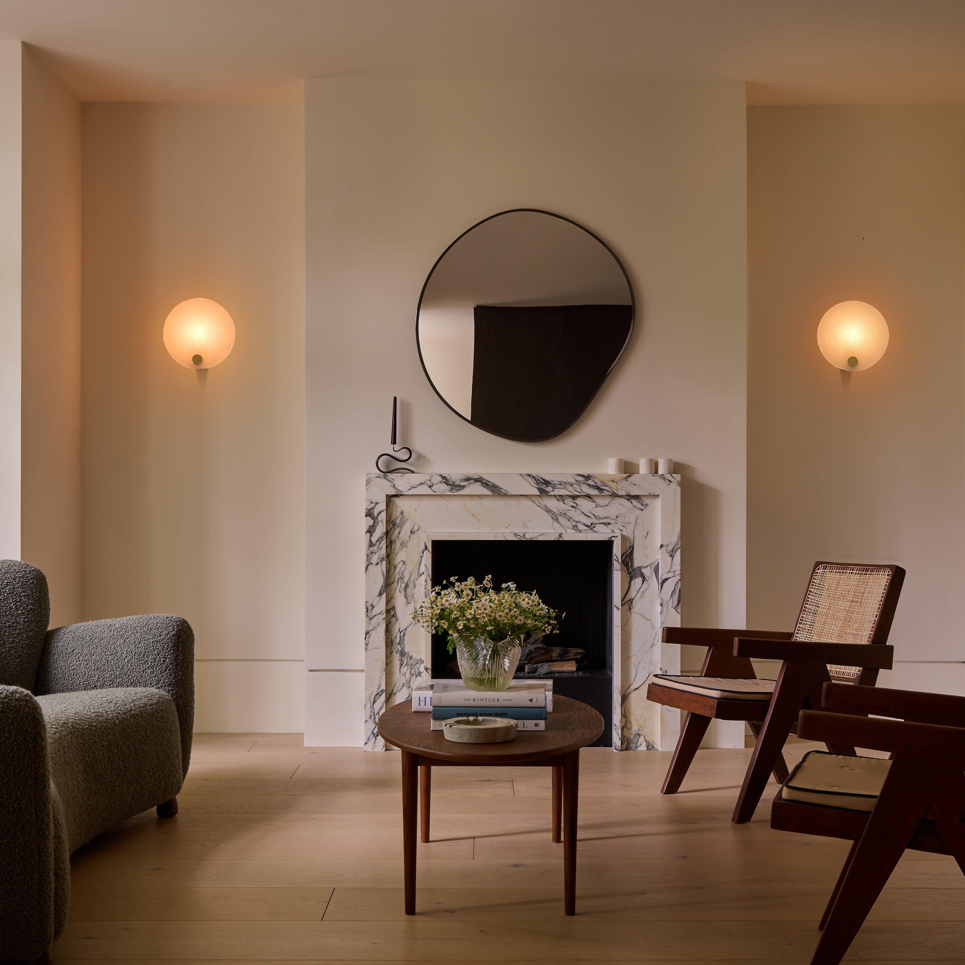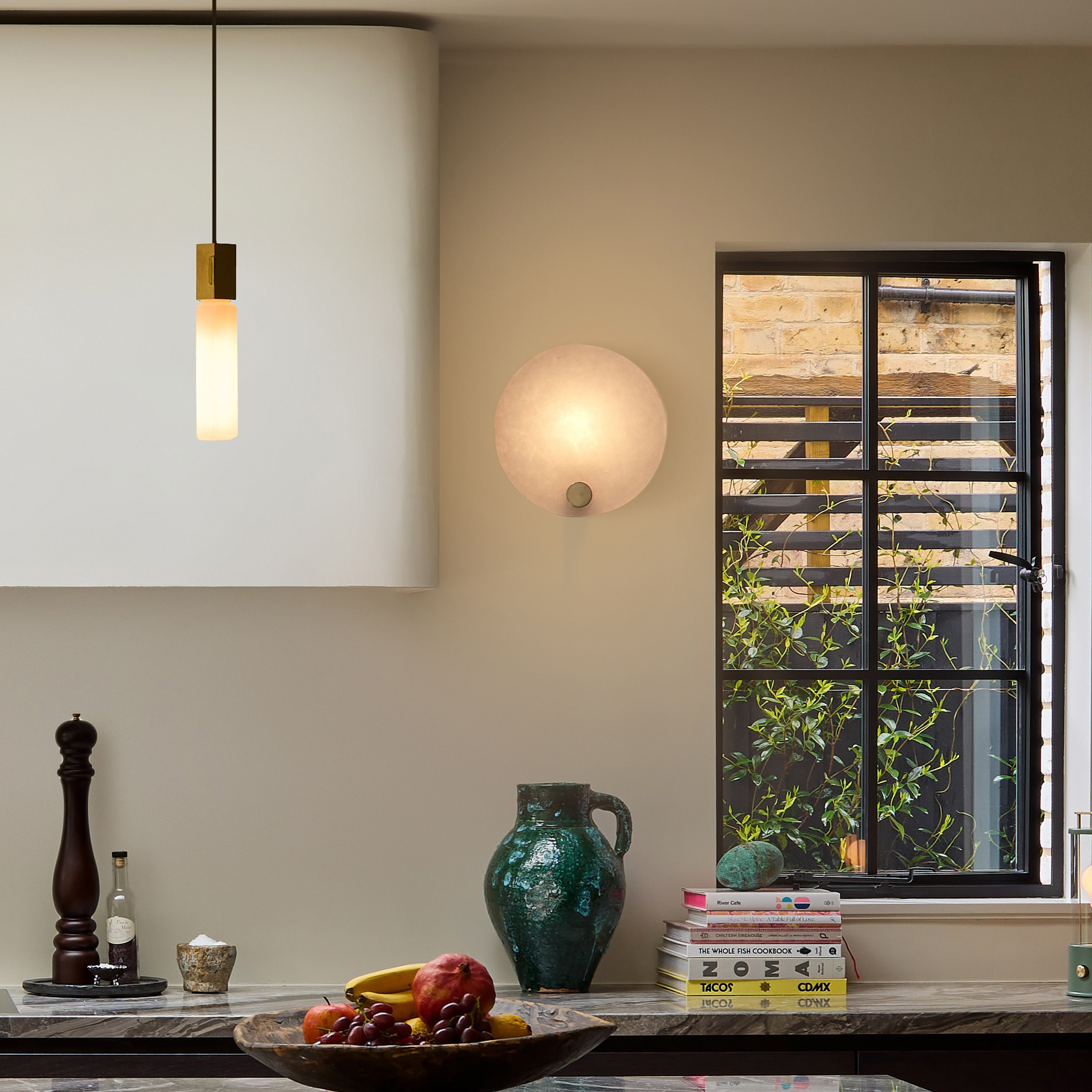 The Magma Wall Light by Tala features a decorative glass disc diffuser made from upcycled solar panels, providing a gentle diffusion of light. Its solid brass frame adds a refined touch to the design. The fixture includes a matte white G22 bulb and projects from the wall, making it suitable for various interior settings.