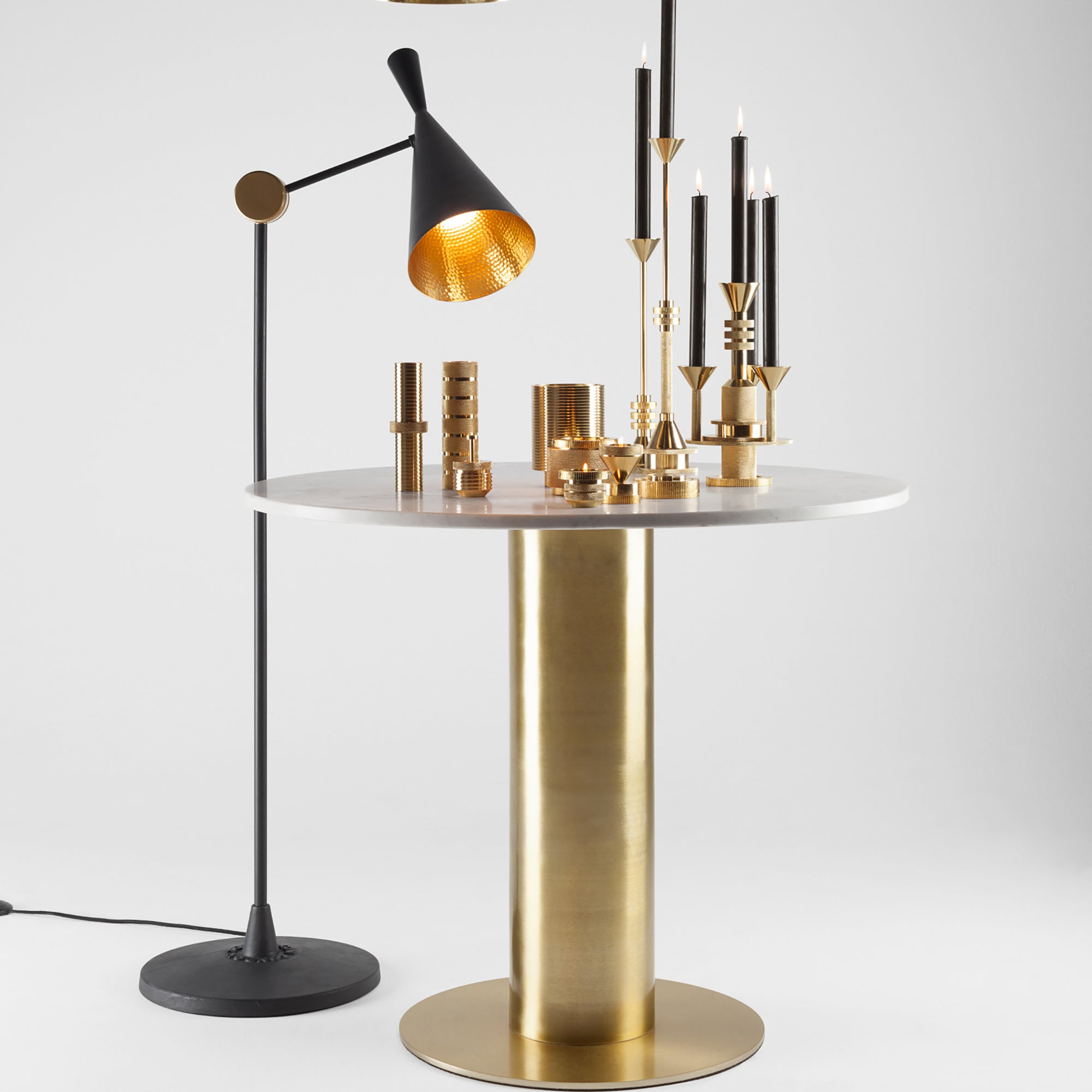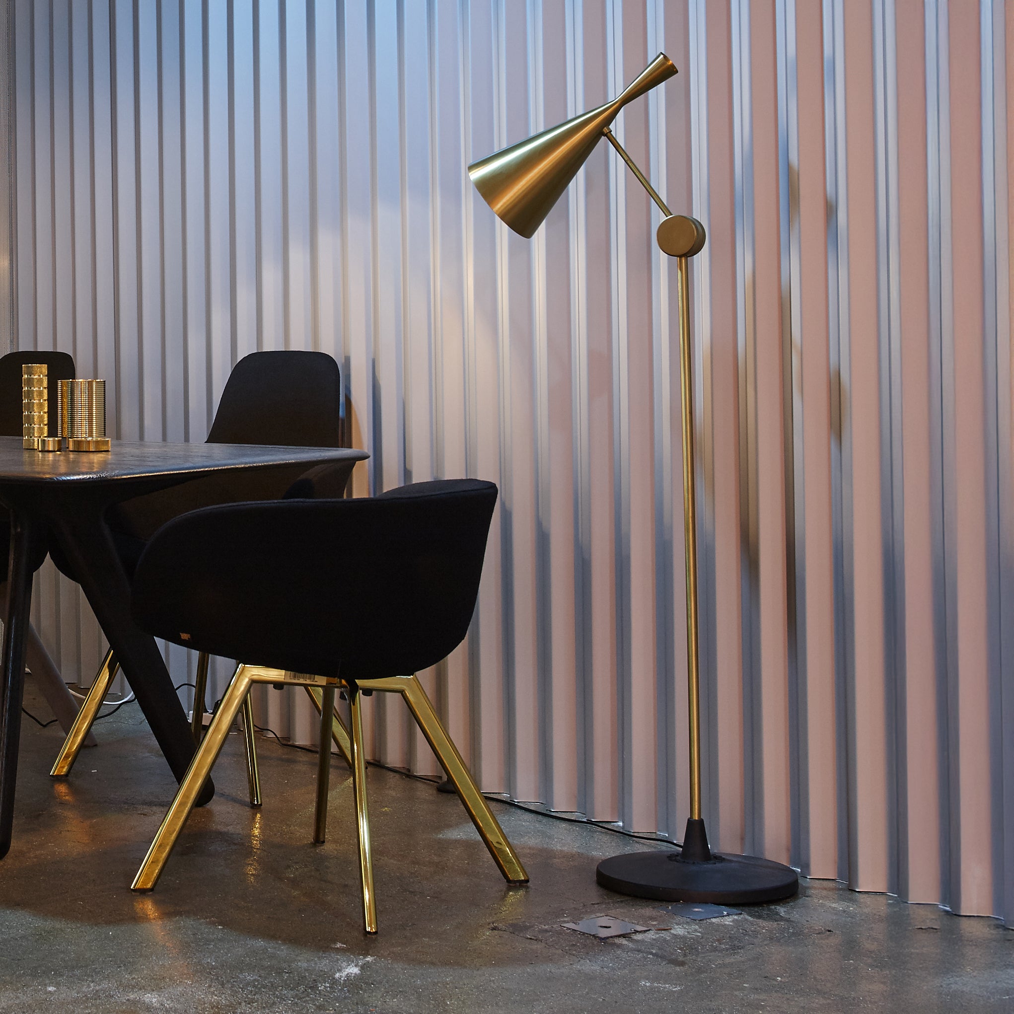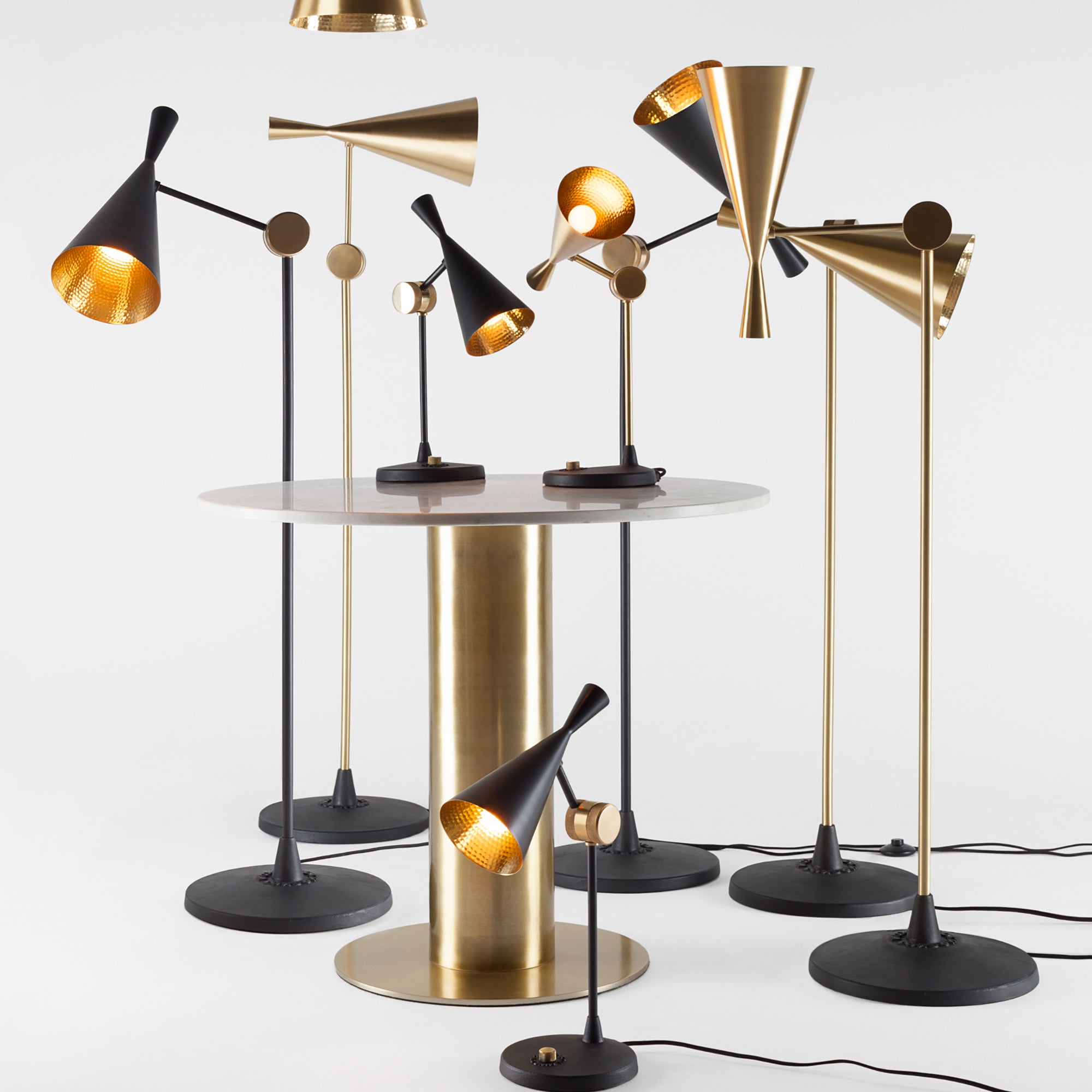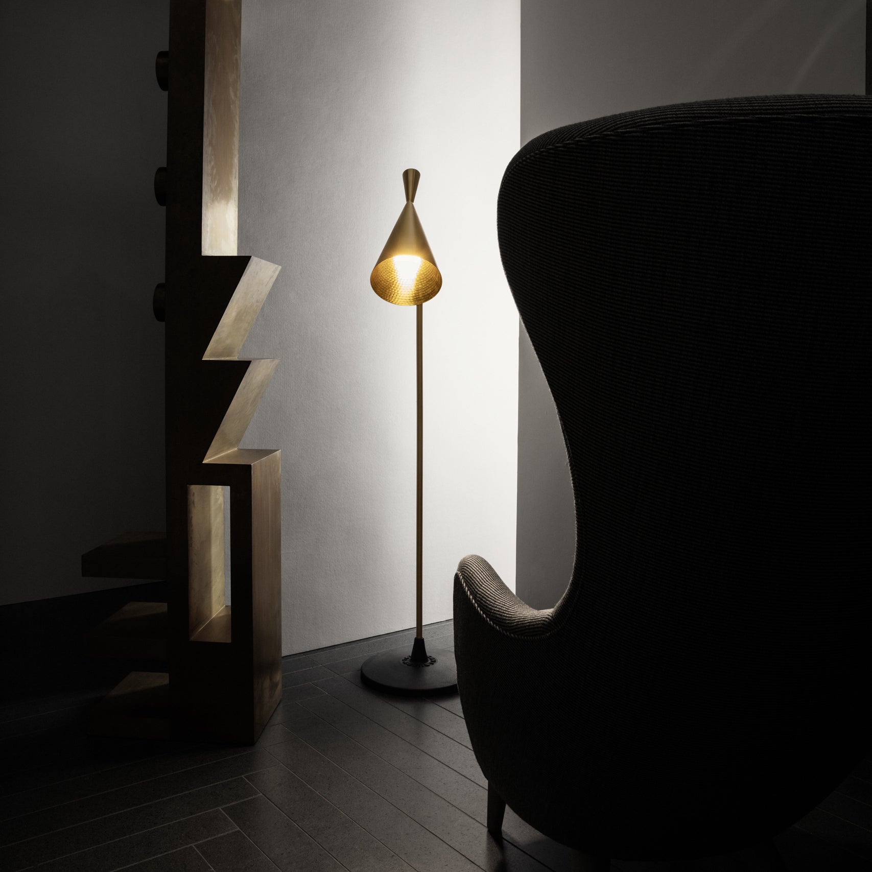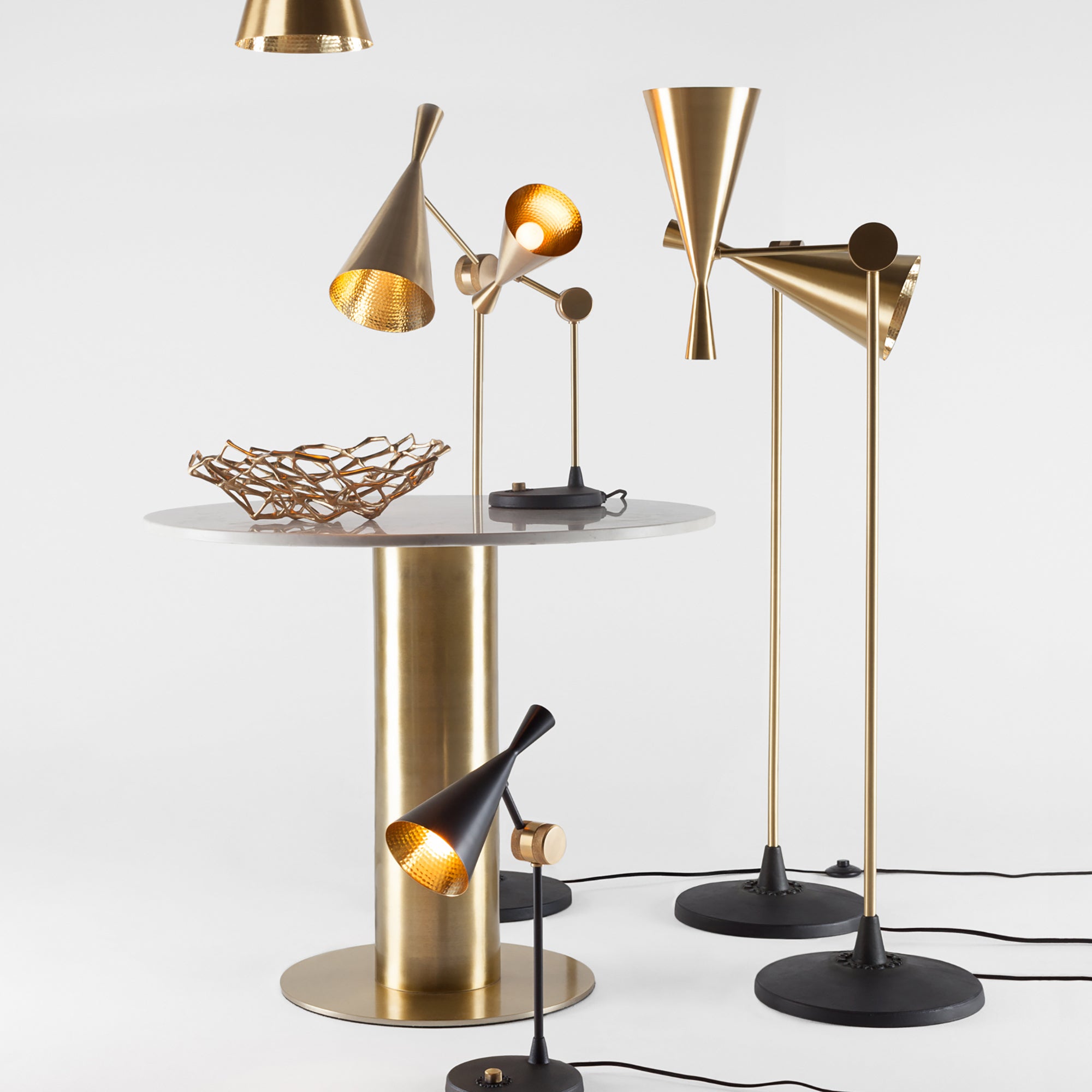 This splendid floor lamp is adapted from Tom Dixon's modern-classic Beat lighting collection. Inspired by the sculptural simplicity of traditional water vessels, the series is distinguished by its beaten and brushed brass shade, perpetuating the skills of artisan craftsmen in Northern India. Yet the designer bespeaks today with his stylishly functional silhouette for the refraction of golden light.