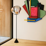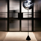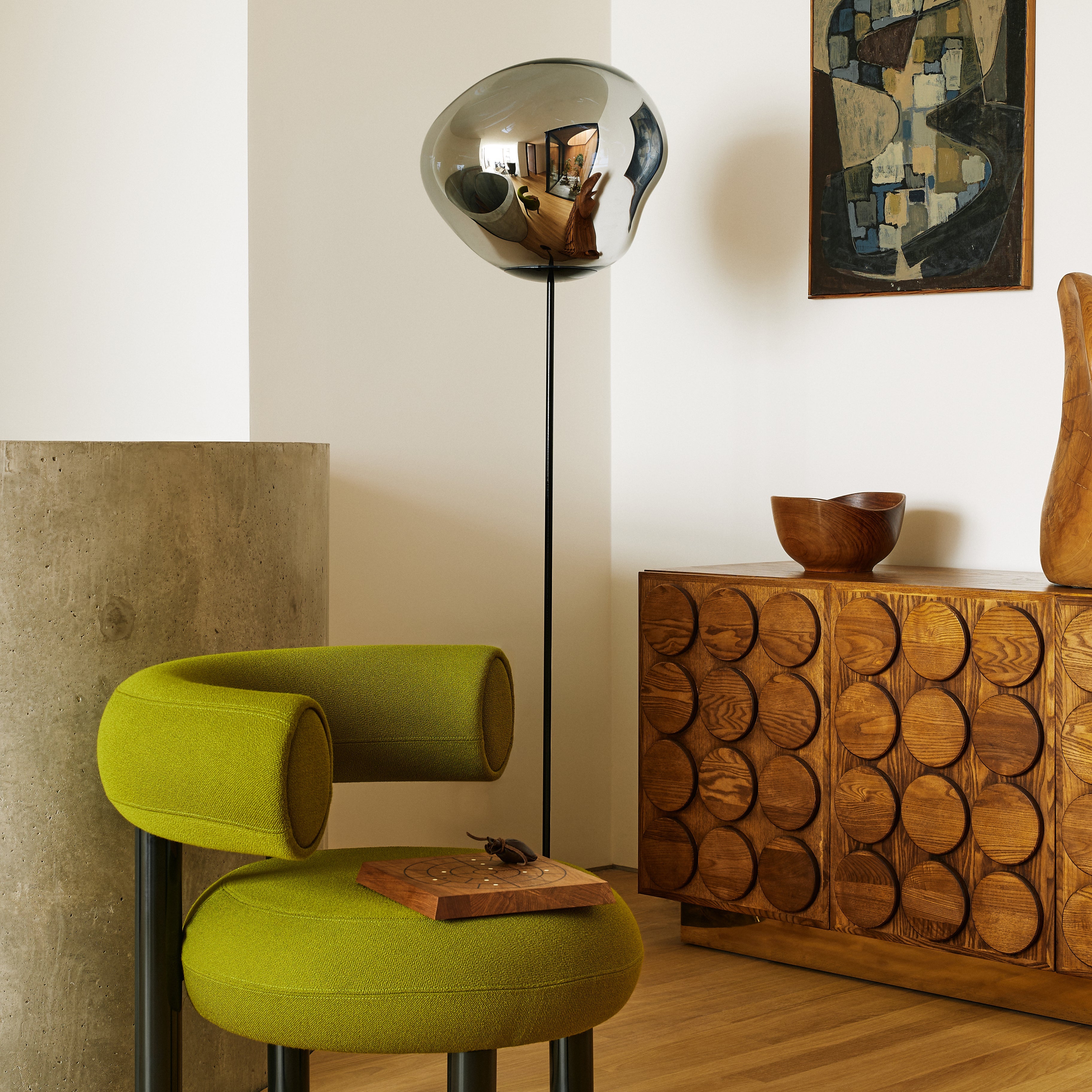 Brit Tom Dixon literally broke the mold with Melt, his vacuum-formed lighting design. His metallic "blob" shines as a floor lamp, a monumental mirrored orb perched on a reedy stand with a gloss-black finish. cone base. The distorted sphere shade comes in a choice of gold, copper, silver, or smoke finish to cast its softened glow with the designer's requisite offbeat style.