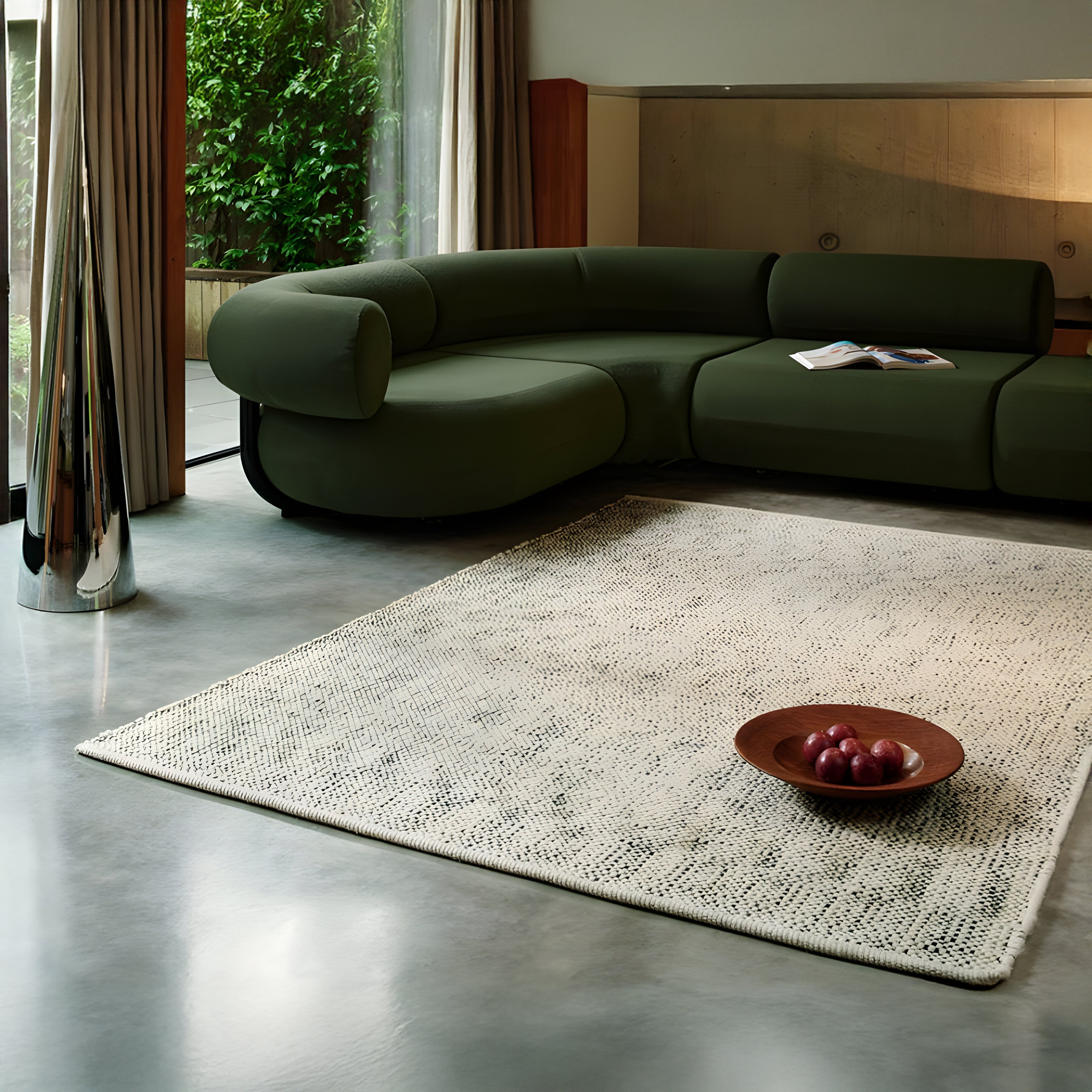 The Tweed Rug features a mix of green flecks formed by intertwining three different yarn colors, giving it a unique and textured look. Varying yarn thicknesses and a low-twist weave create a soft feel underfoot. Handmade by artisans in Northern India, it’s offered in two sizes and showcases an irregular pattern that adds depth and character to the space.