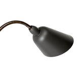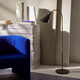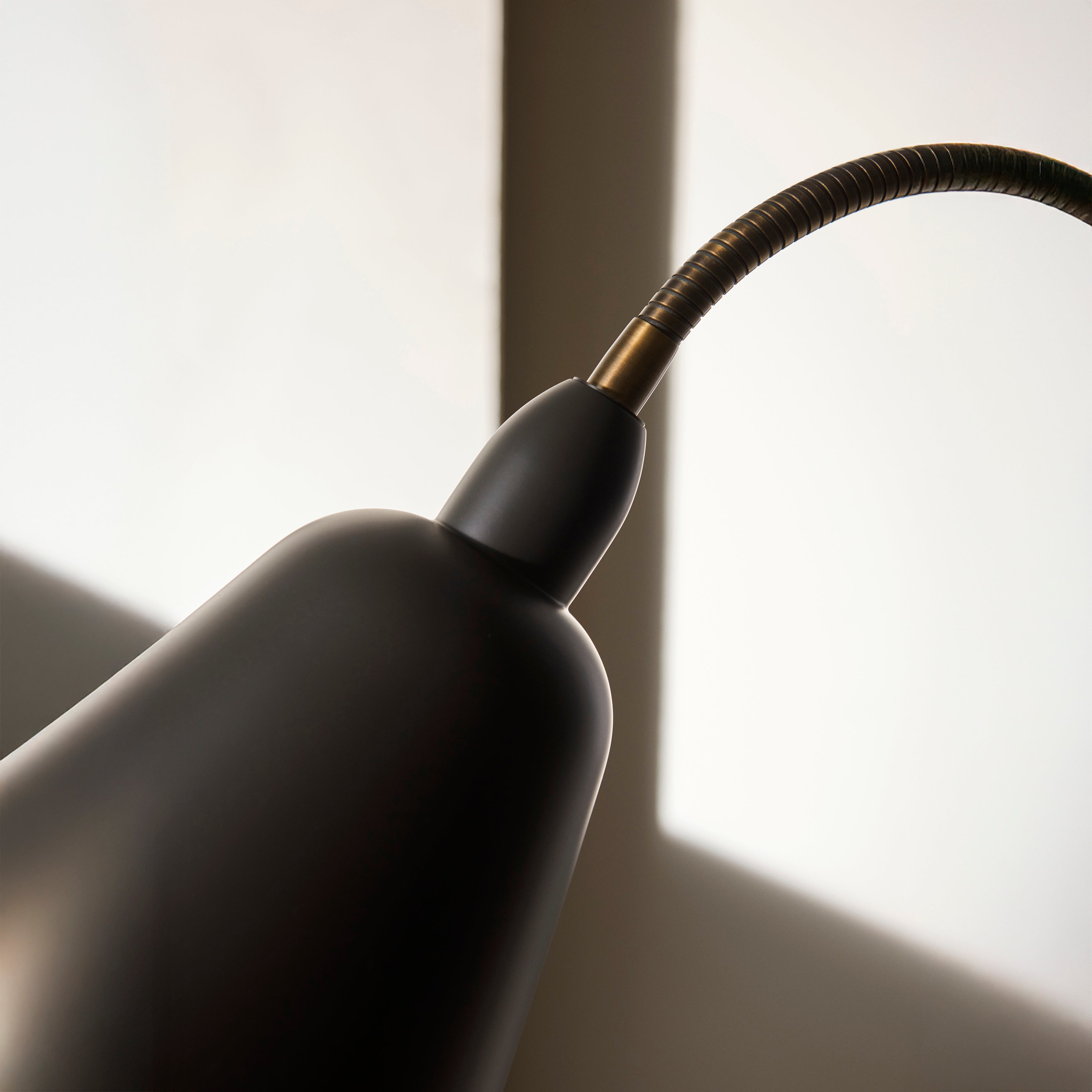 This floor lamp features a gently arched frame and a sharply angled shade, combining precise detailing with a minimalist profile. First created in 1929, the design is reissued as a special edition to mark a design milestone. The shade, crafted from a single piece of spun metal, directs light effectively while maintaining clean, uninterrupted lines.