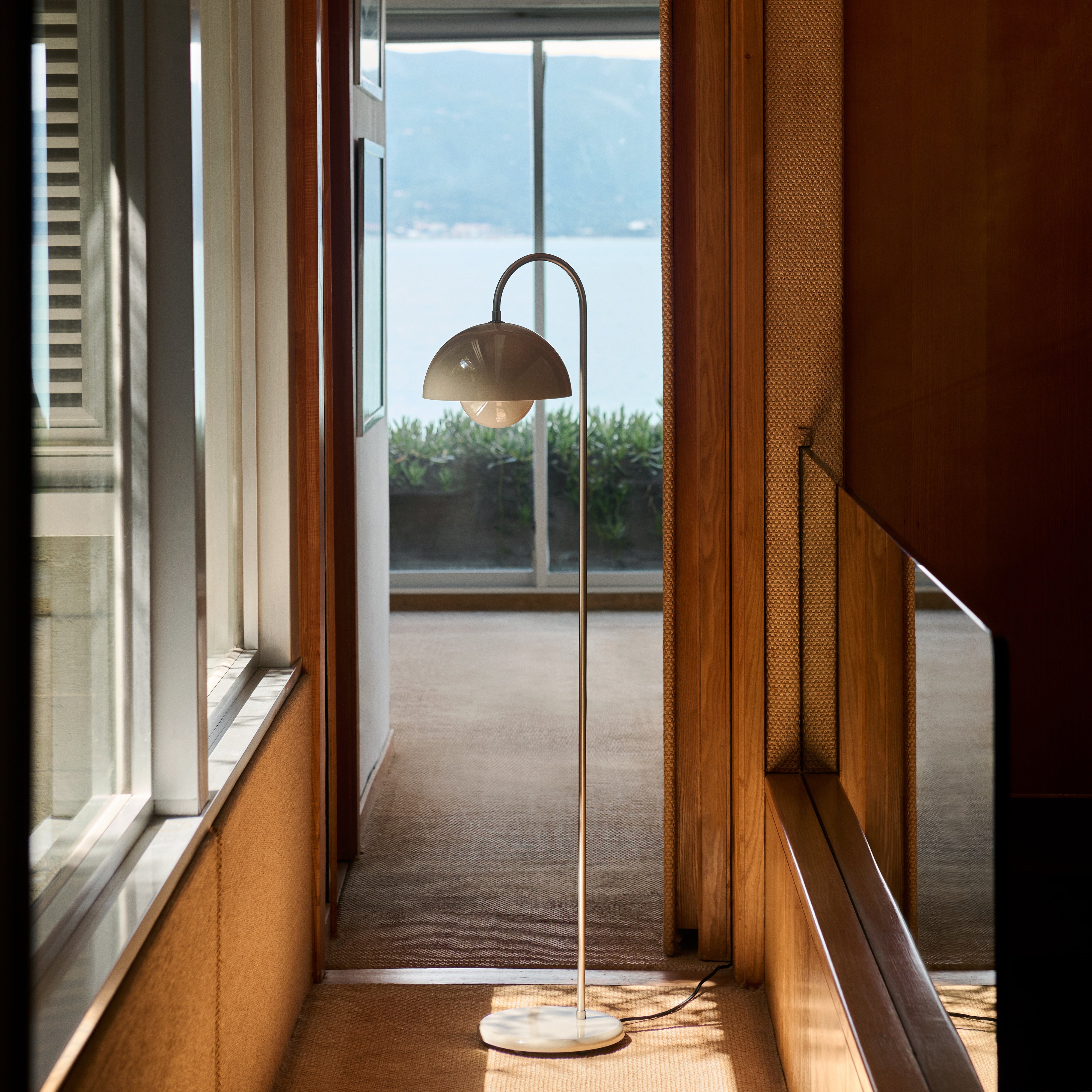 The Flowerpot VP12 Floor Lamp by &Tradition continues Verner Panton’s iconic Flowerpot series, first introduced in the late 1960s. It showcases a unique design featuring two hemispheres facing each other, casting a soft, downward light. The base reflects the spherical shape of the shade, creating a unified and sculptural look. With its sleek and compact form, the lamp is ideal for placement beside armchairs, sofas, or desks. It is made from lacquered steel and includes a fabric-covered cord and is available in matte black, chrome, cobalt blue, and beige. The E27 bulb base supports LED lighting and features a dimmable function for adjustable ambiance.
