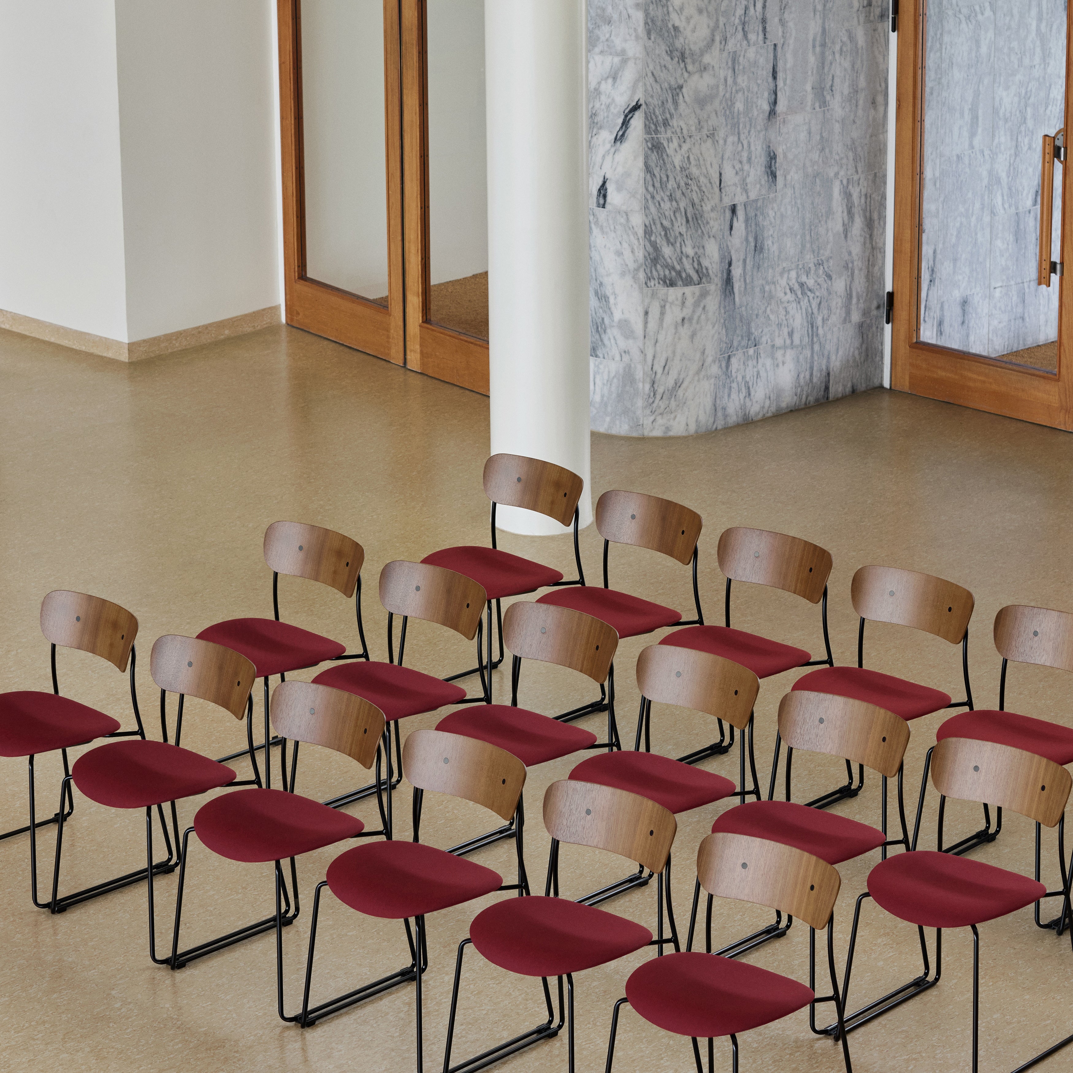 A gently curved seat and slender steel legs give the Pavilion AV52 side chair a light, open profile that works well in both small and large spaces. Built from form-pressed veneer and bent steel tubes, it sits on a sled base that enhances stability and visual simplicity. The chair is offered in several wood finishes and can be stacked up to ten high with a trolley, making it well-suited for events and spaces where flexible seating is needed.