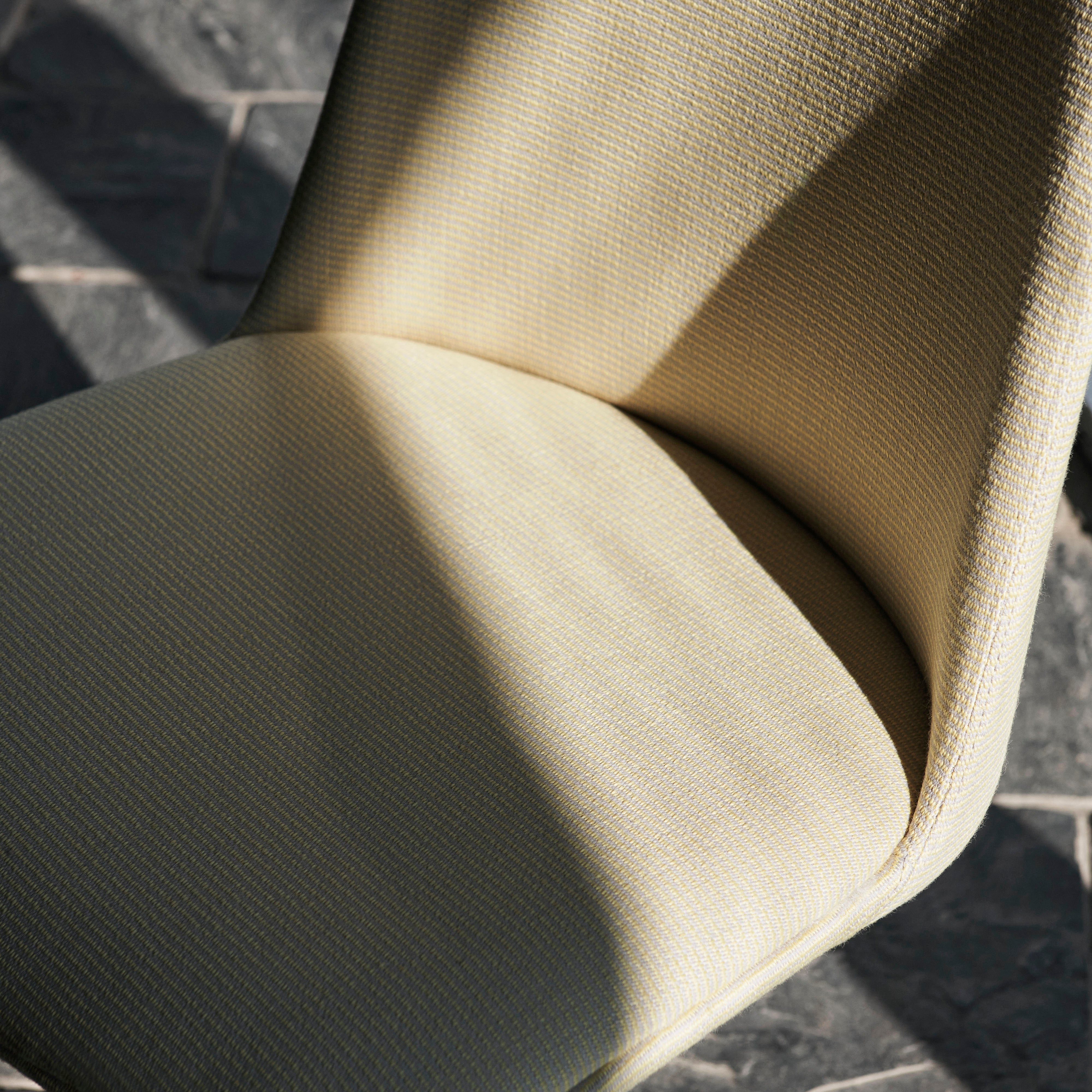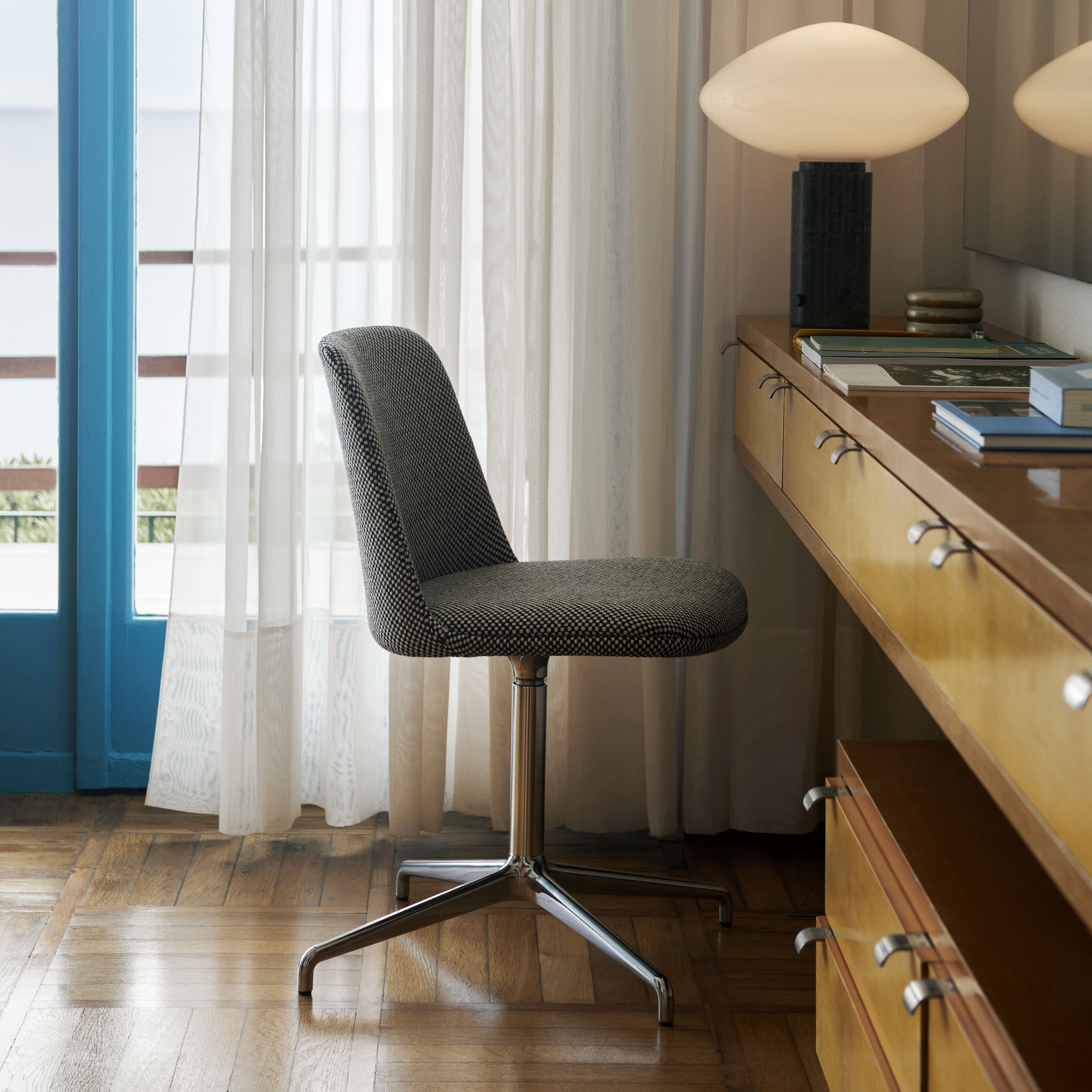 Custom-upholstered with a cushioned seat, &Tradition offers this version of its eco-friendly shell chair paired with a swivel base with convenient return. Designer Hee Welling’s molded Rely is fashioned from 100 percent recycled plastic and then clad in premium fabric or leather over a layer of HR foam to offer ergonomic comfort and made-to-order personalization. The chair’s base is engineered in extruded aluminum and comes in a chrome, bronzed or powder-coated black finish.