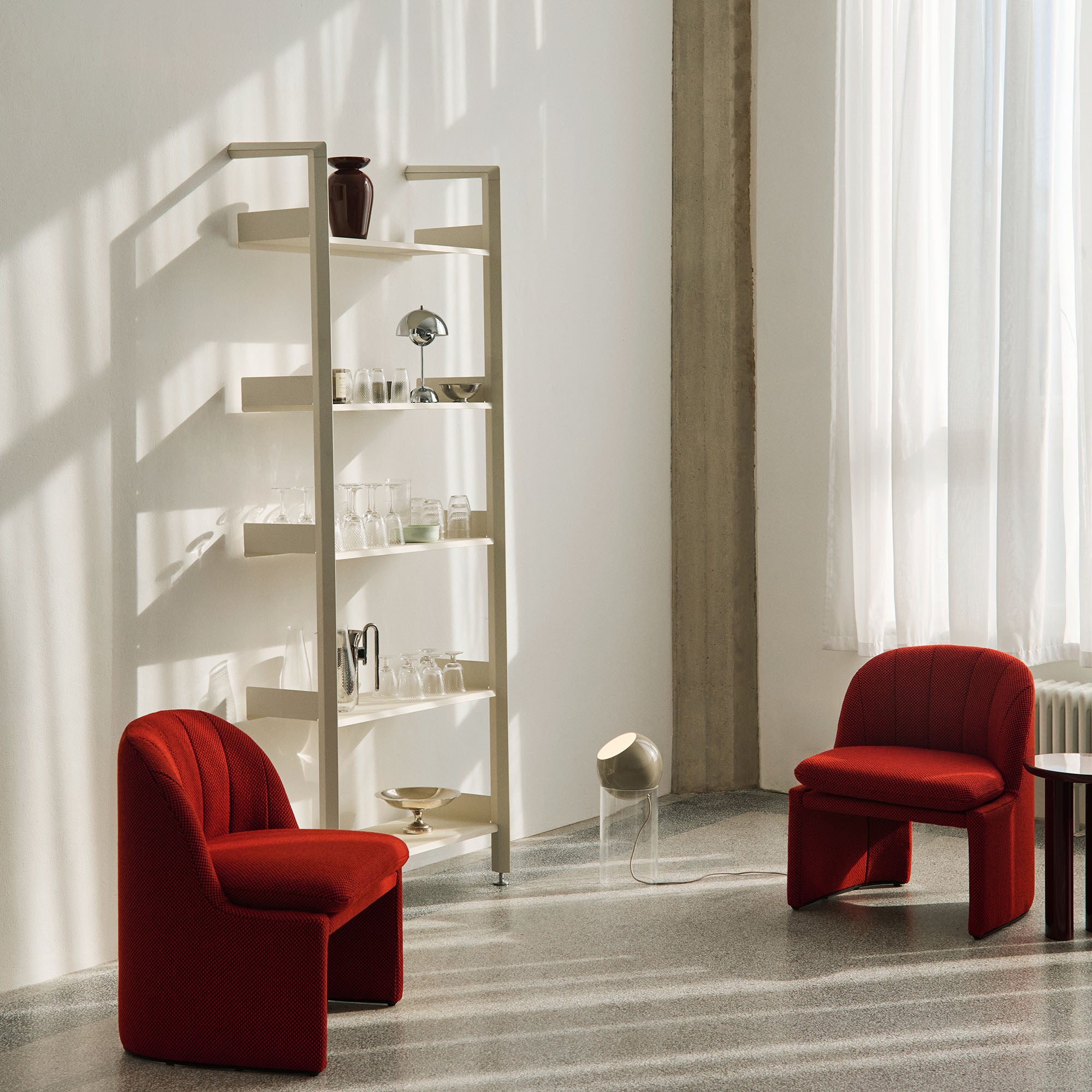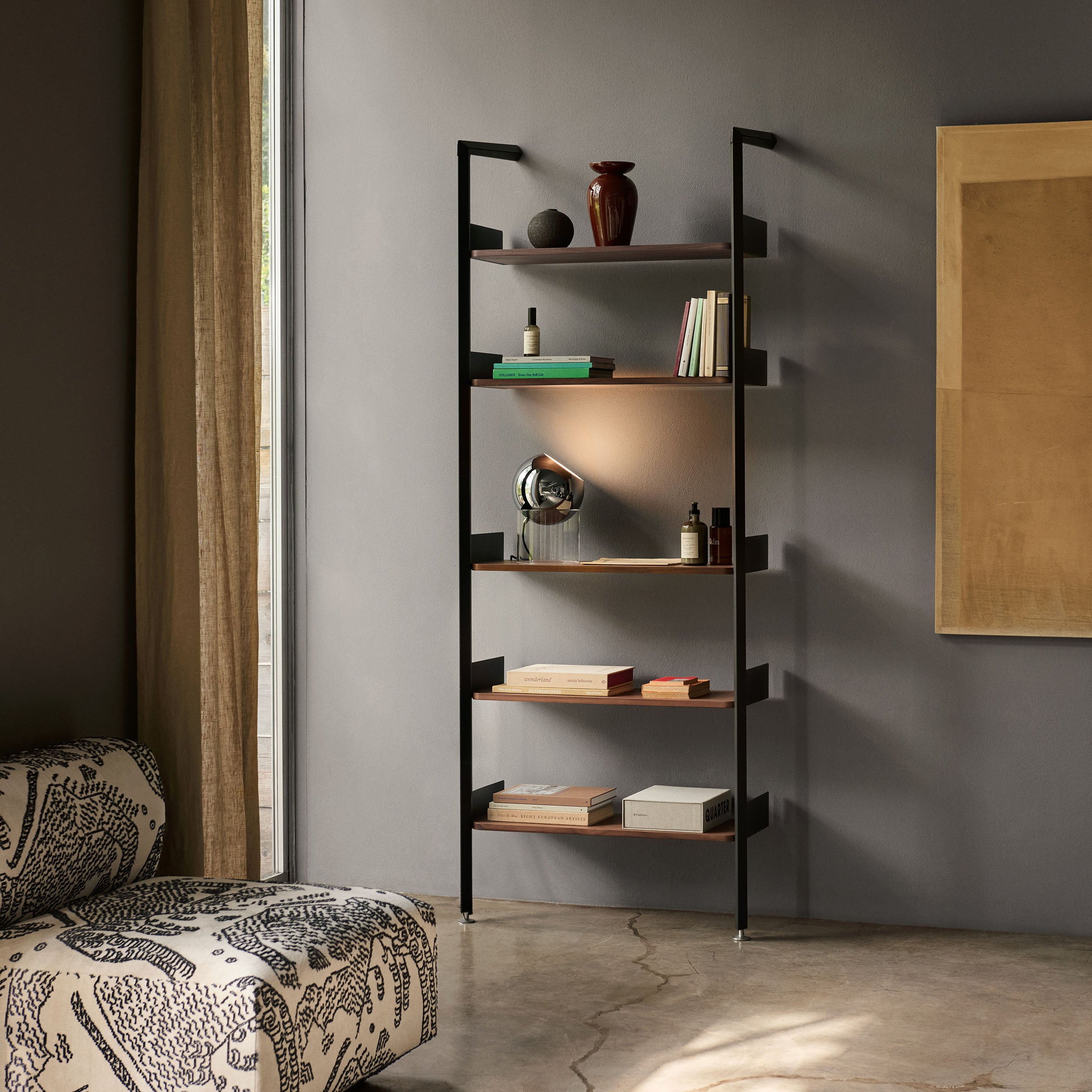 Built to adapt as needs change, the Rombe Modular Shelving System provides a lightweight yet durable framework for storage and display. Slim aluminium uprights anchor securely to the wall at just four points, supporting shelves, cabinets, and work surfaces that can be added or rearranged over time. The rhomboid profile of the uprights not only reinforces stability but also gives the system its name. Adjustable shelf heights and discreet cable management enhance its utility, ensuring neat installations across a wide range of configurations. Available in oak or walnut veneer, alongside powder-coated aluminium finishes such as alabaster and anthracite, all sourced from FSC-certified materials.