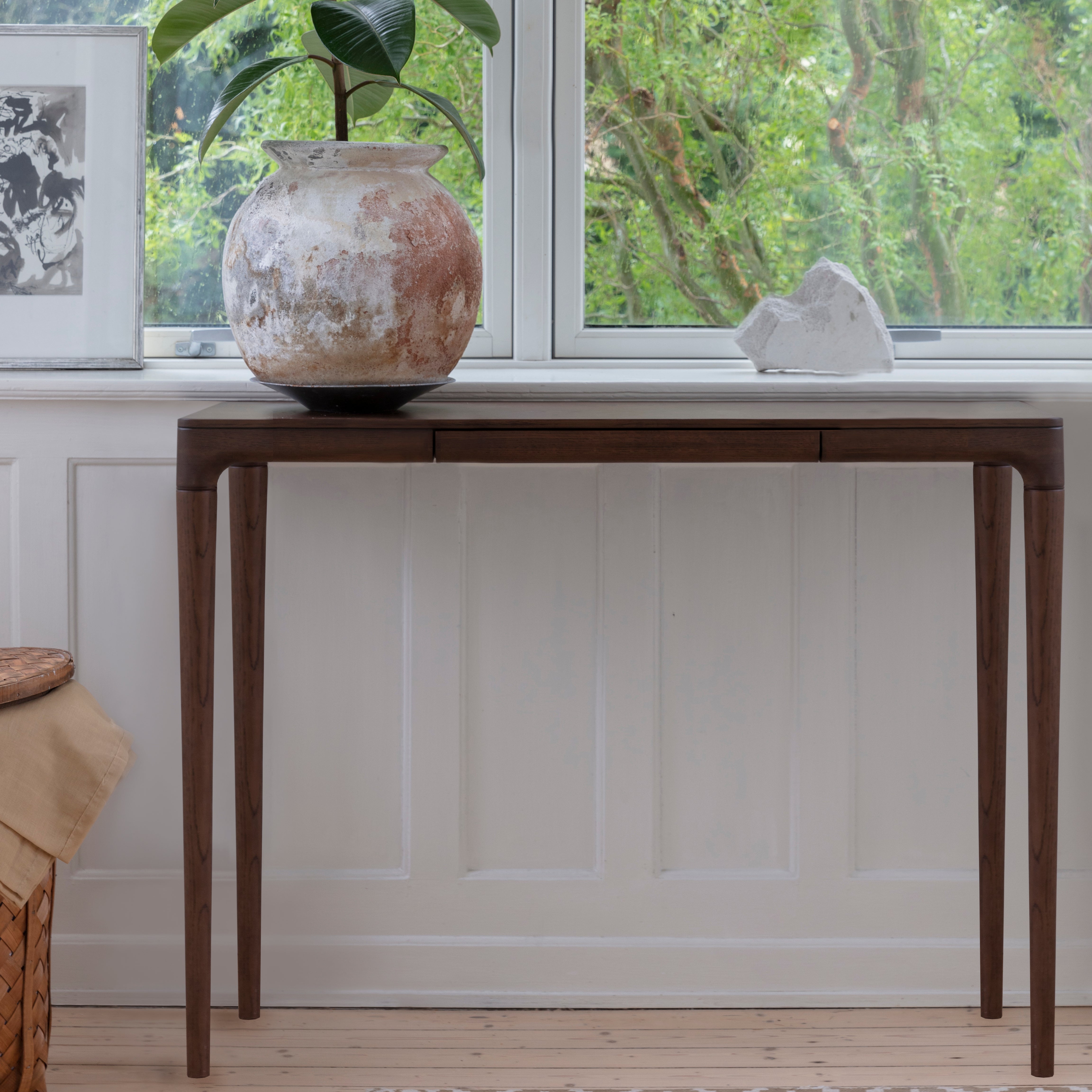 The Heart 'n' Soul Console Table features a fabric-inlaid drawer, providing a discreet storage solution for essentials like keys and wallets. Designed by Søren Ravn Christensen, co-founder of Umage, this piece reflects his commitment to functional and thoughtful craftsmanship. Available in oak, dark oak, and black oak finishes, with options for FENIX® nanolaminate tops in cloud grey, moss green, and obsidian black, the table offers exceptional resistance to scratches, stains, and impact.