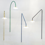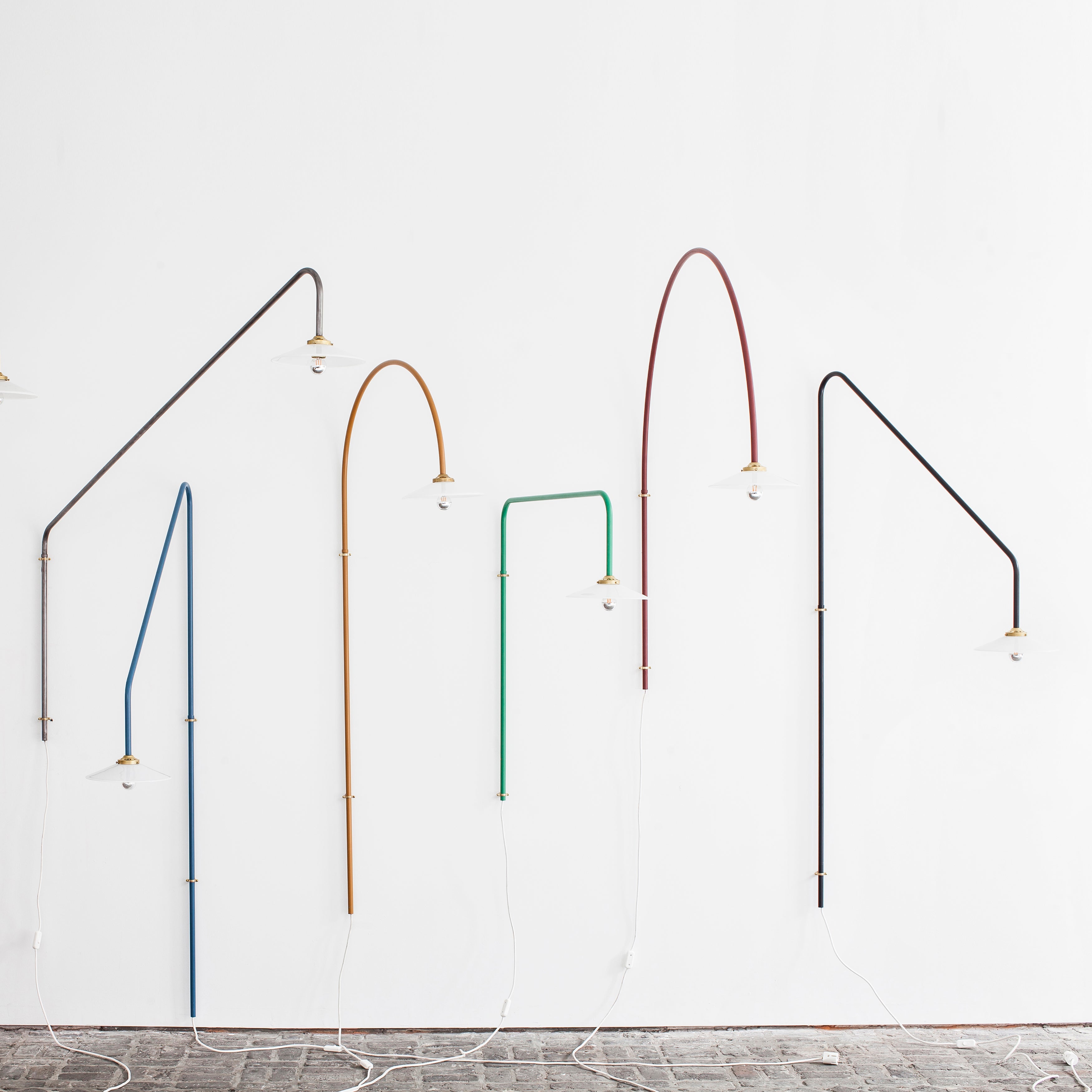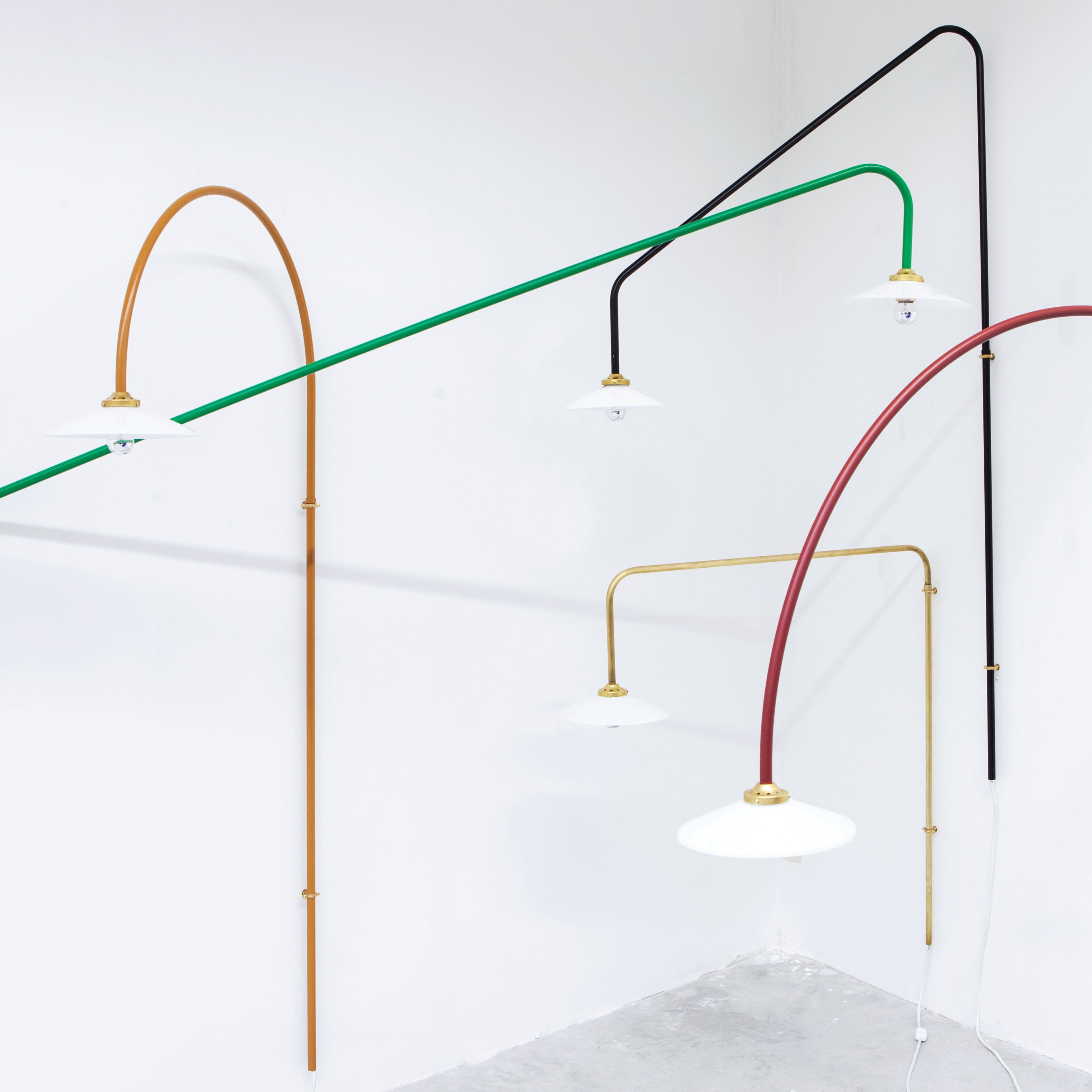Muller Van Severen’s initial version of their wall-mounted pendant makes a dramatic upward slant. The series was conceived the duo needed a dining table light in a room without a ceiling outlet. The linear fixture makes a statement without dominating a space and is crafted in steel tubing in brass, black or several curated colors.