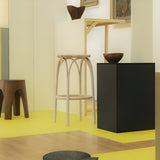 This wooden stool is defined by bent-wood arcs that rise from its round legs, recalling the way a tree splits into branches. The curves support a smooth seat, while the underside reveals a hand-carved pattern that seems to flow outward from the wood itself. Crafted in ash or oak with a choice of finishes, the stool is available in both bar and counter heights, with an option for removable cushioning. Each piece reflects skilled woodworking traditions and the natural character of solid wood.