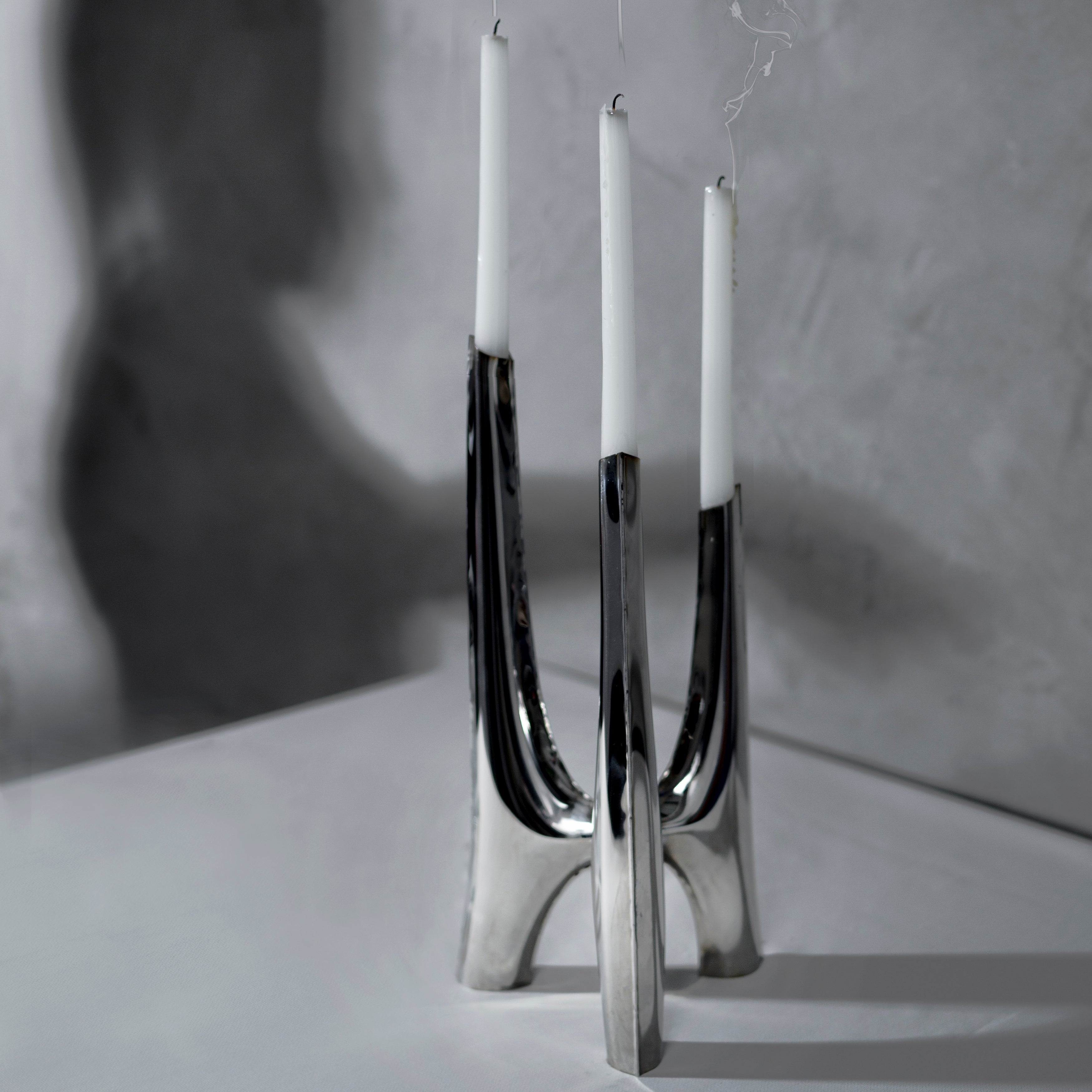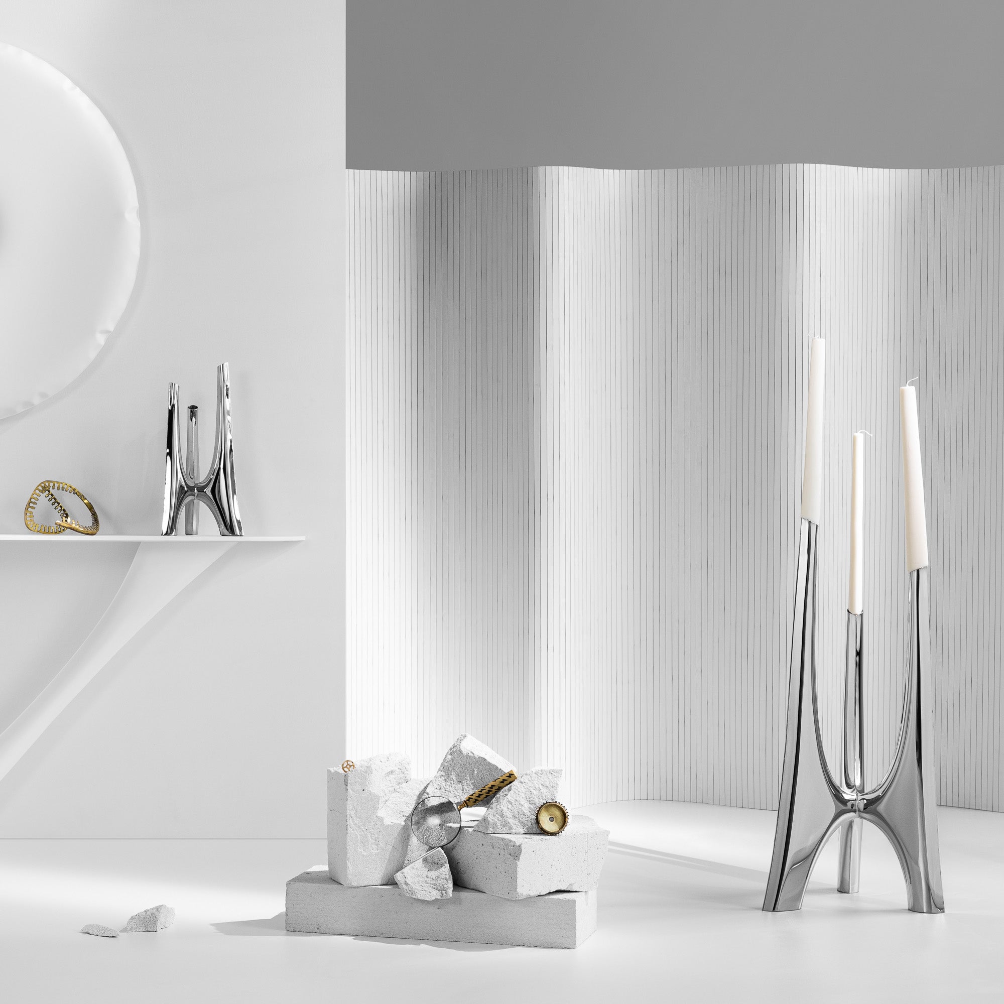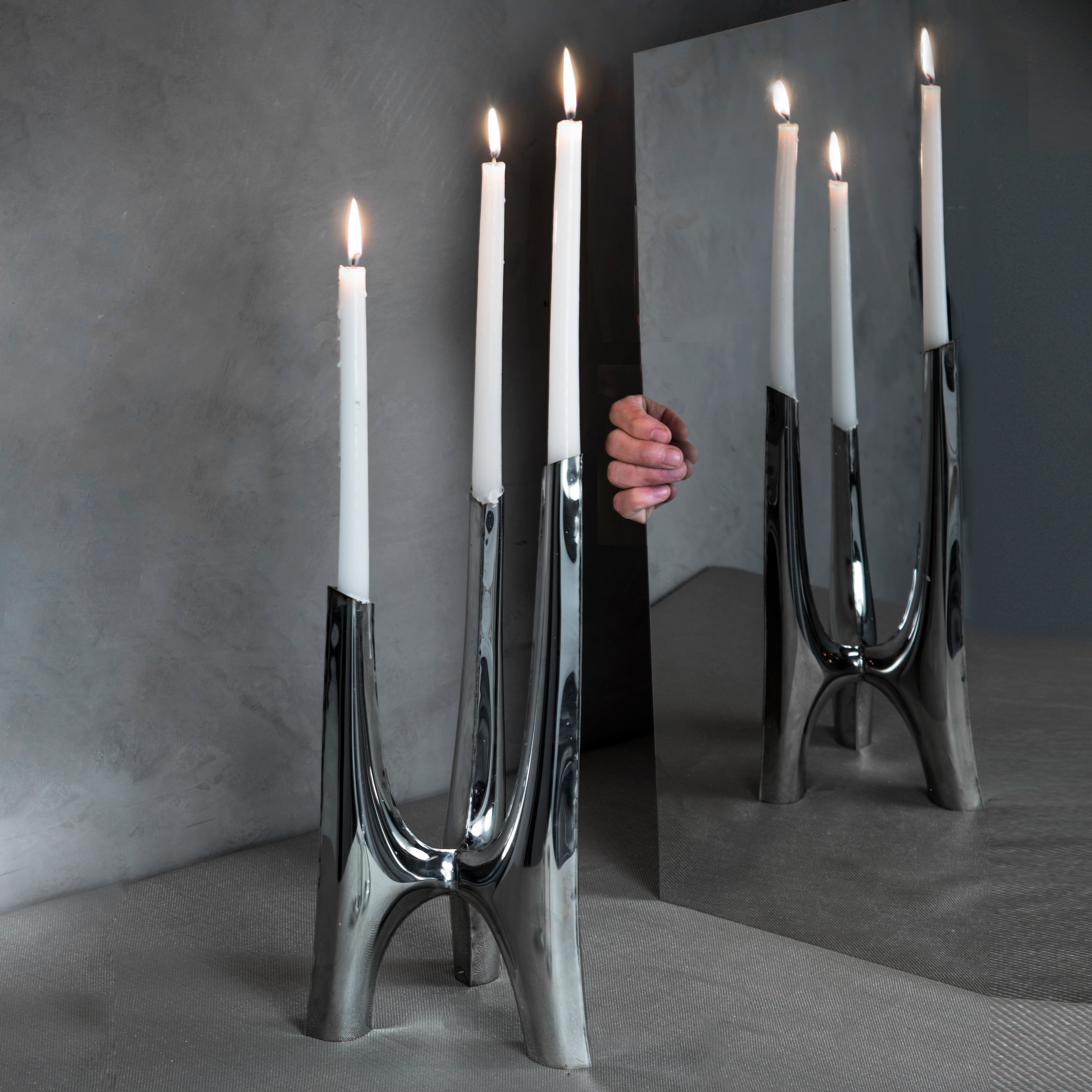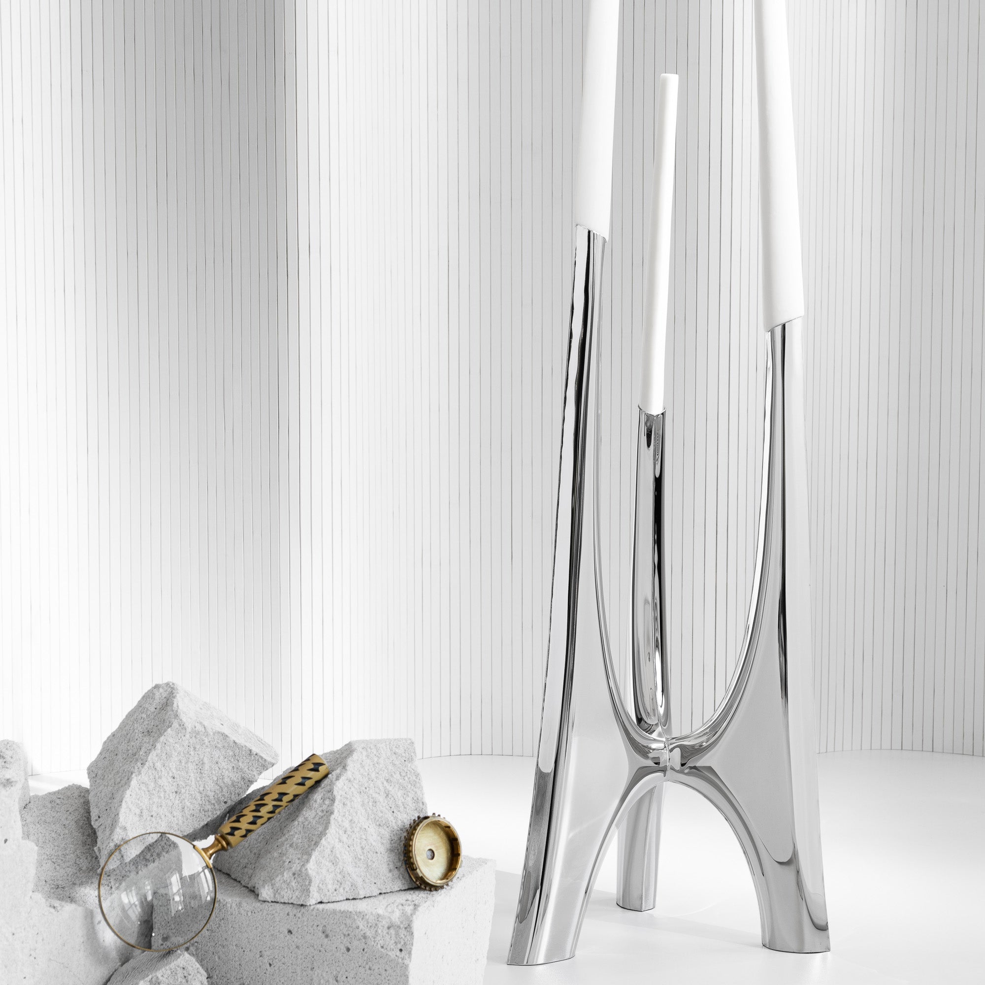 Reminiscent of Gothic cathedral towers, Zieta interprets the soaring lines in a gleaming polished-steel candleholder with 3 tree-like arms. Triglav is crafted via the brand's proprietary FiDU technology, which creates tridimensional metal forms out of flat metal sheets. With its asymmetrical configuration, the candelabrum presents a different appearance from each viewpoint—and the geometric form makes a fine sculptural addition to a table or sideboard, with or without tapering candles.