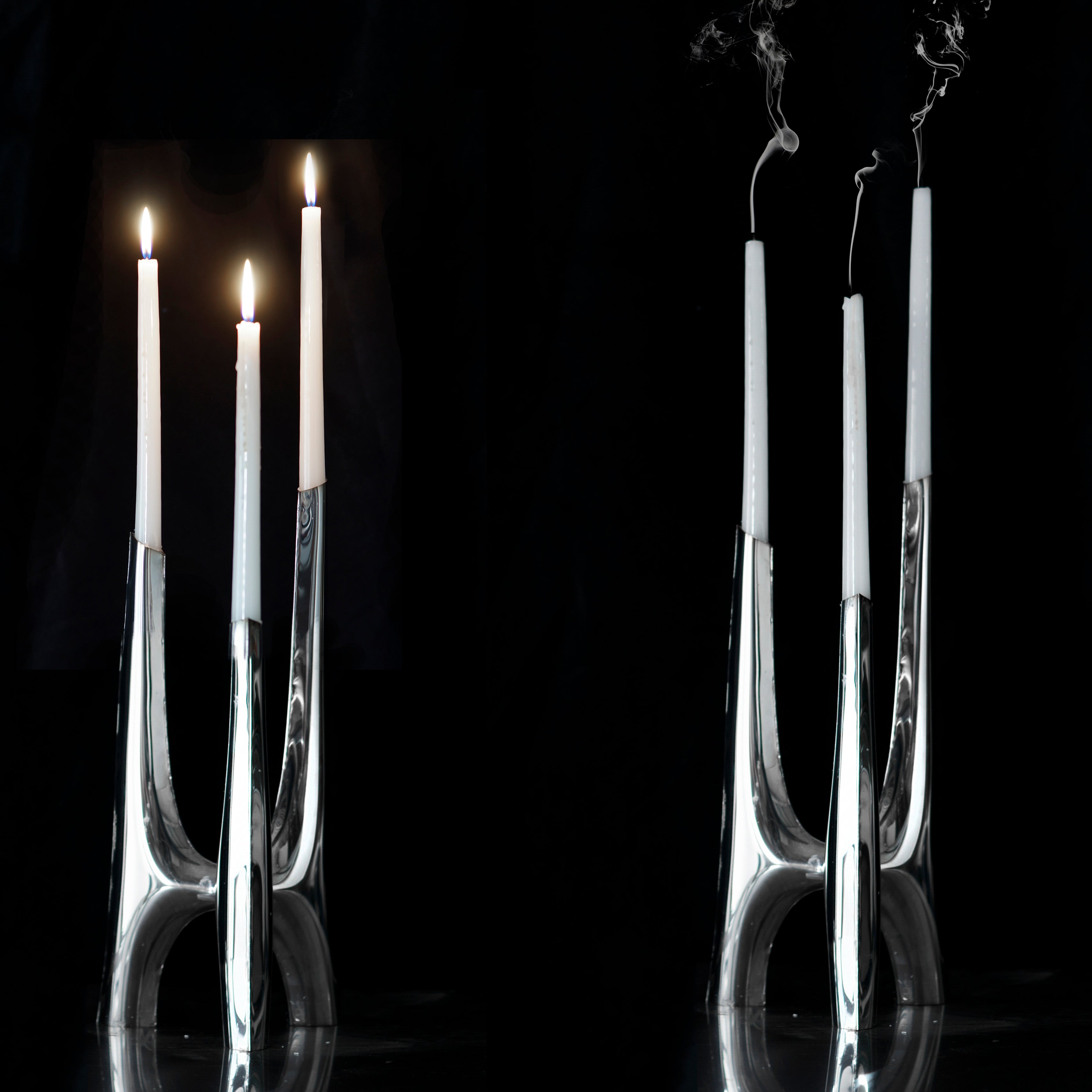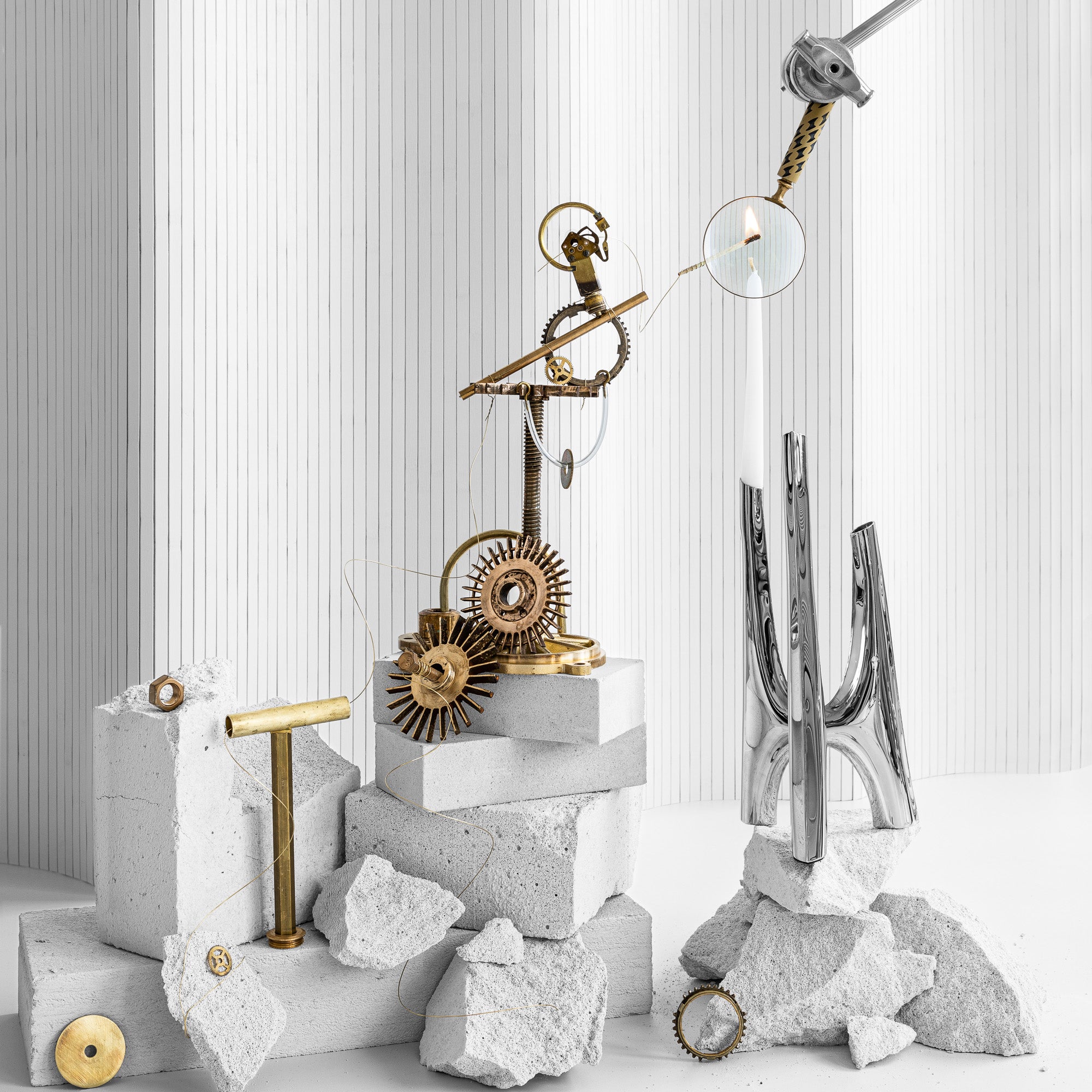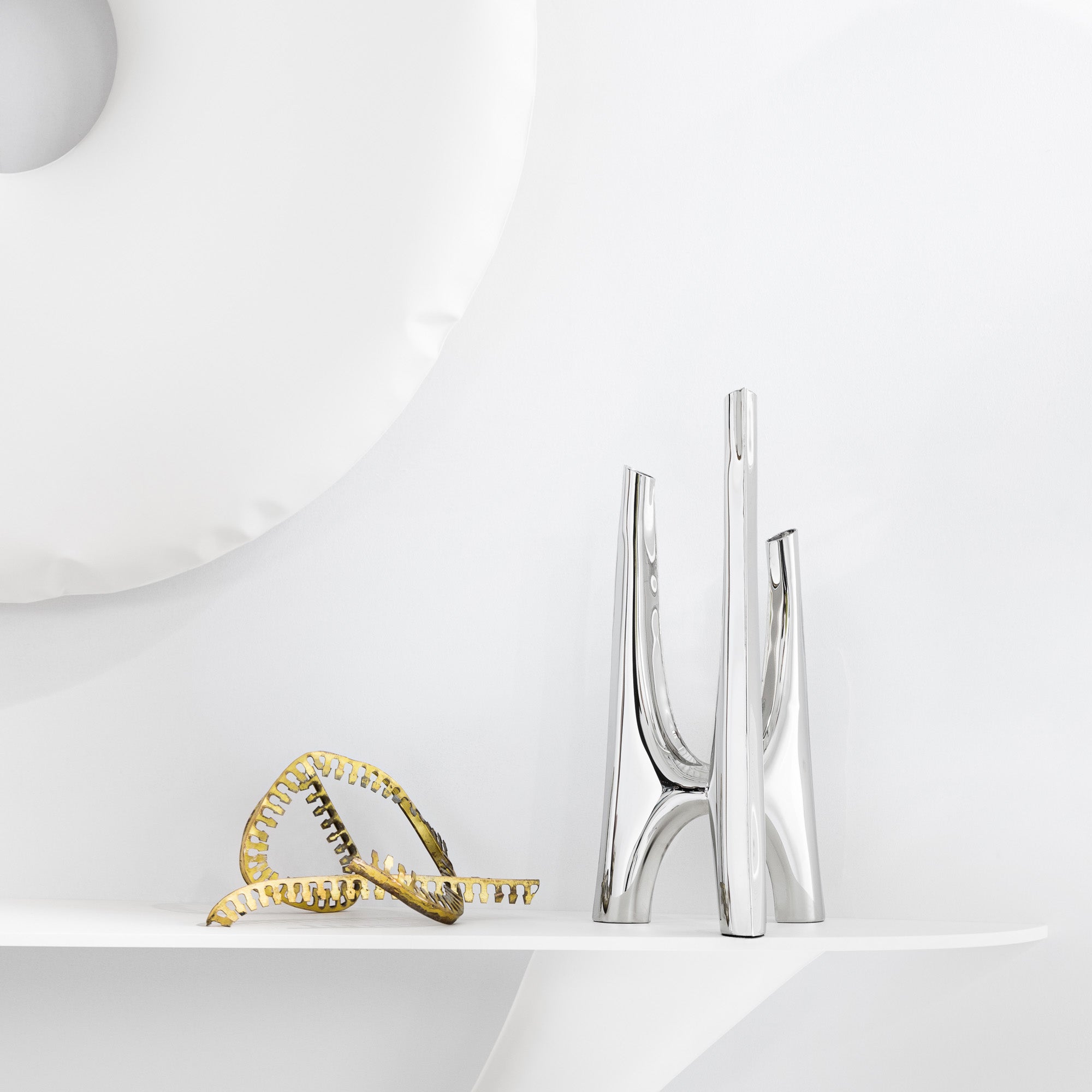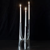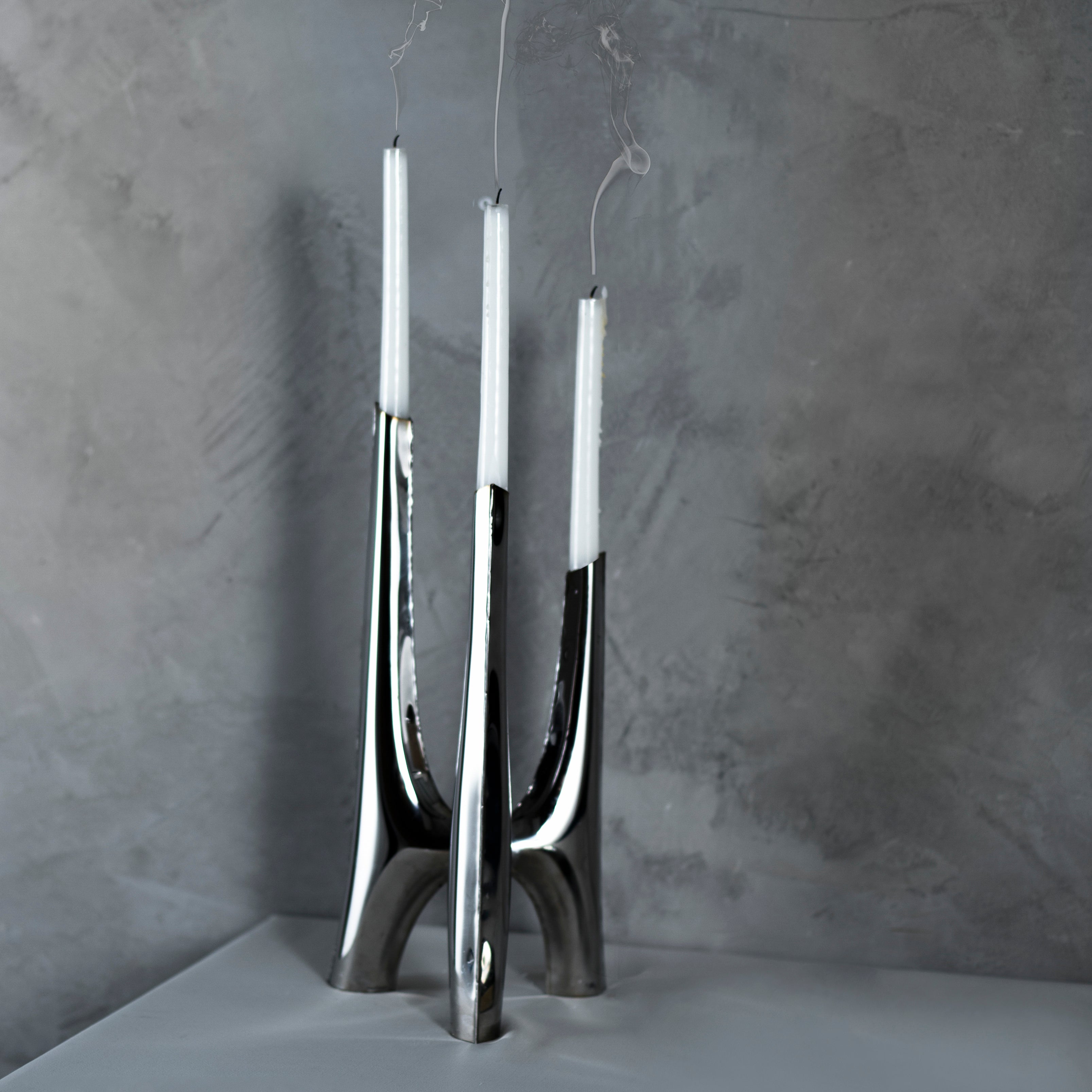 Reminiscent of Gothic cathedral towers, Zieta interprets the soaring lines in a gleaming polished-steel candleholder with 3 tree-like arms. Triglav is crafted via the brand's proprietary FiDU technology, which creates tridimensional metal forms out of flat metal sheets. With its asymmetrical configuration, the candelabrum presents a different appearance from each viewpoint—and the geometric form makes a fine sculptural addition to a table or sideboard, with or without tapering candles.