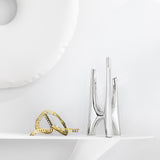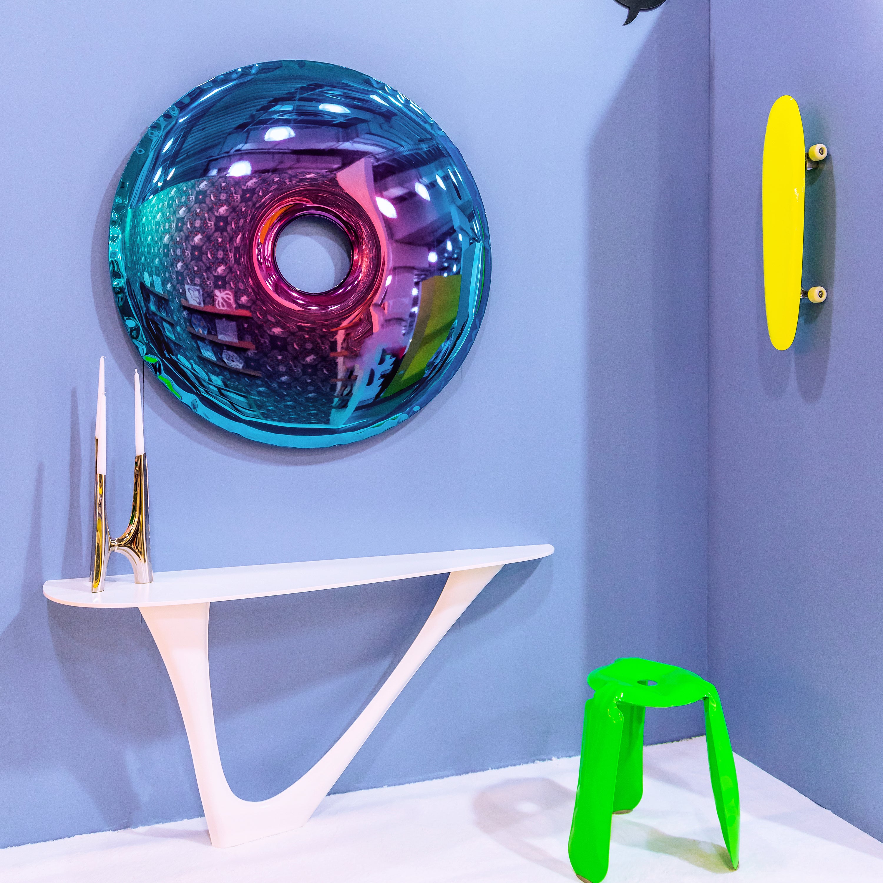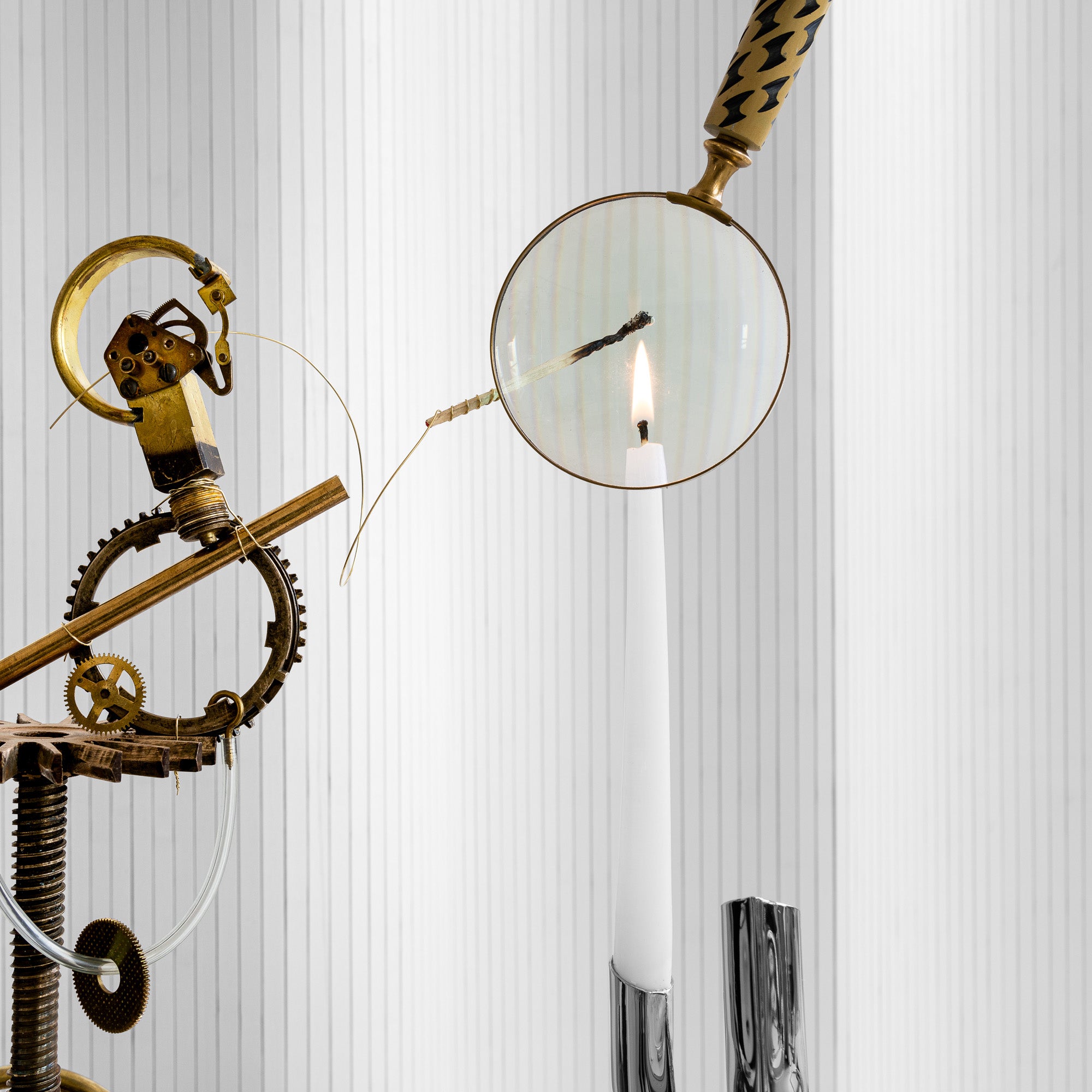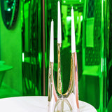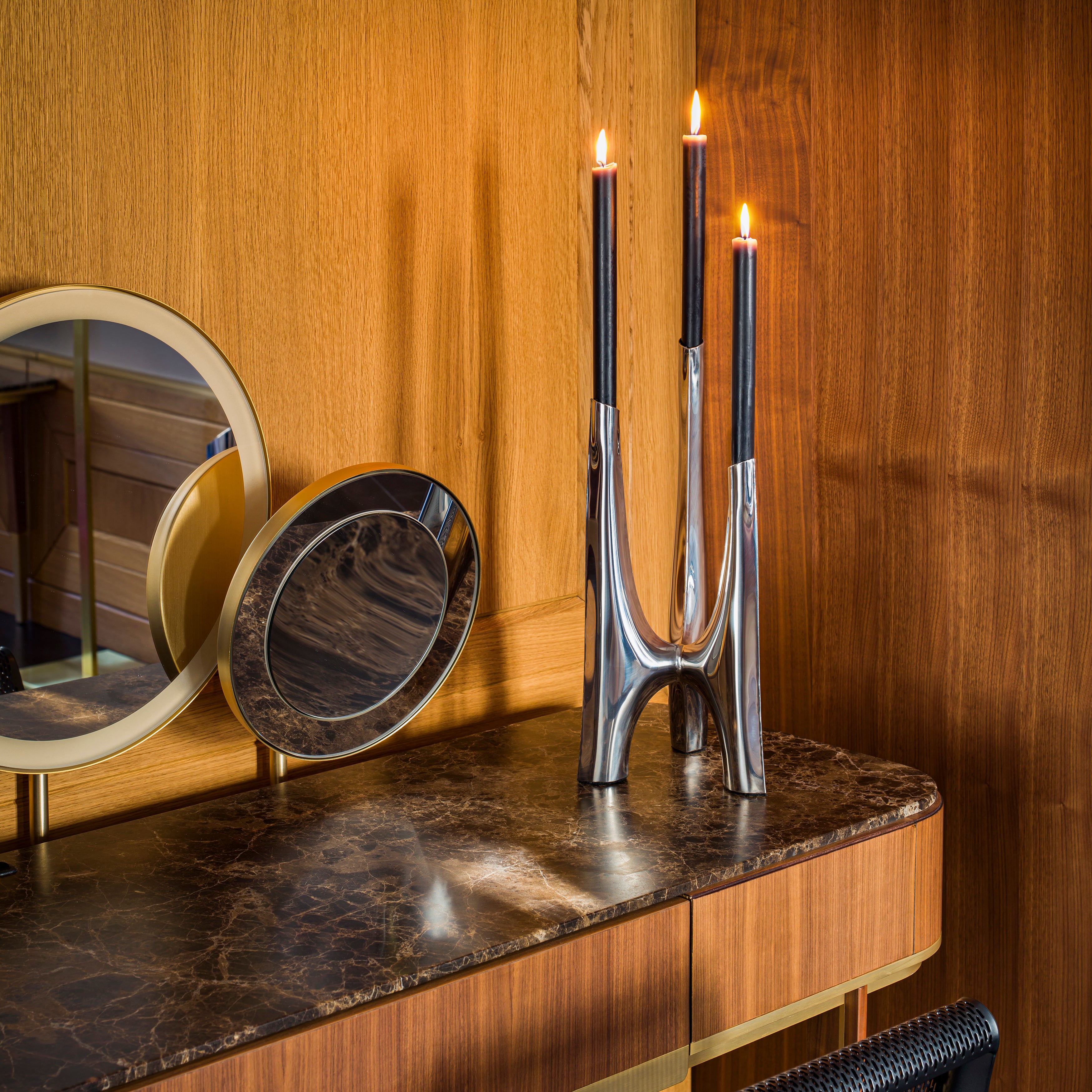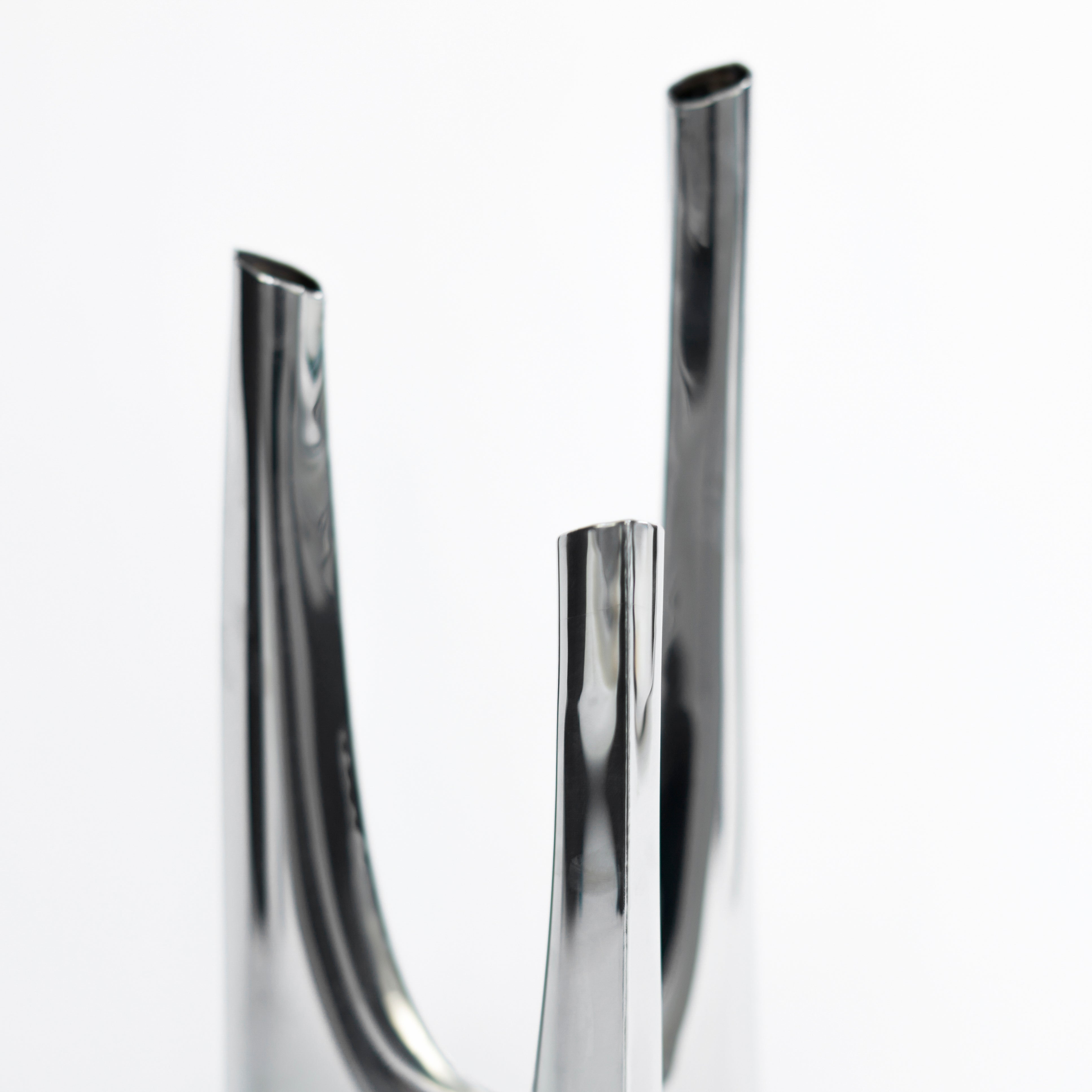 Reminiscent of Gothic cathedral towers, Zieta interprets the soaring lines in a gleaming polished-steel candleholder with 3 tree-like arms. Triglav is crafted via the brand's proprietary FiDU technology, which creates tridimensional metal forms out of flat metal sheets. With its asymmetrical configuration, the candelabrum presents a different appearance from each viewpoint—and the geometric form makes a fine sculptural addition to a table or sideboard, with or without tapering candles.