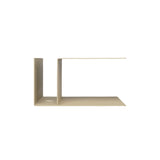 The Lager Bedside Table is a wall-mounted shelf made from brushed aluminum or powder-coated iron. It includes a cable cutout for cord management and comes with mounting hardware. The design keeps surfaces clear while providing storage space for lighting, electronics, or other bedside items.