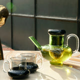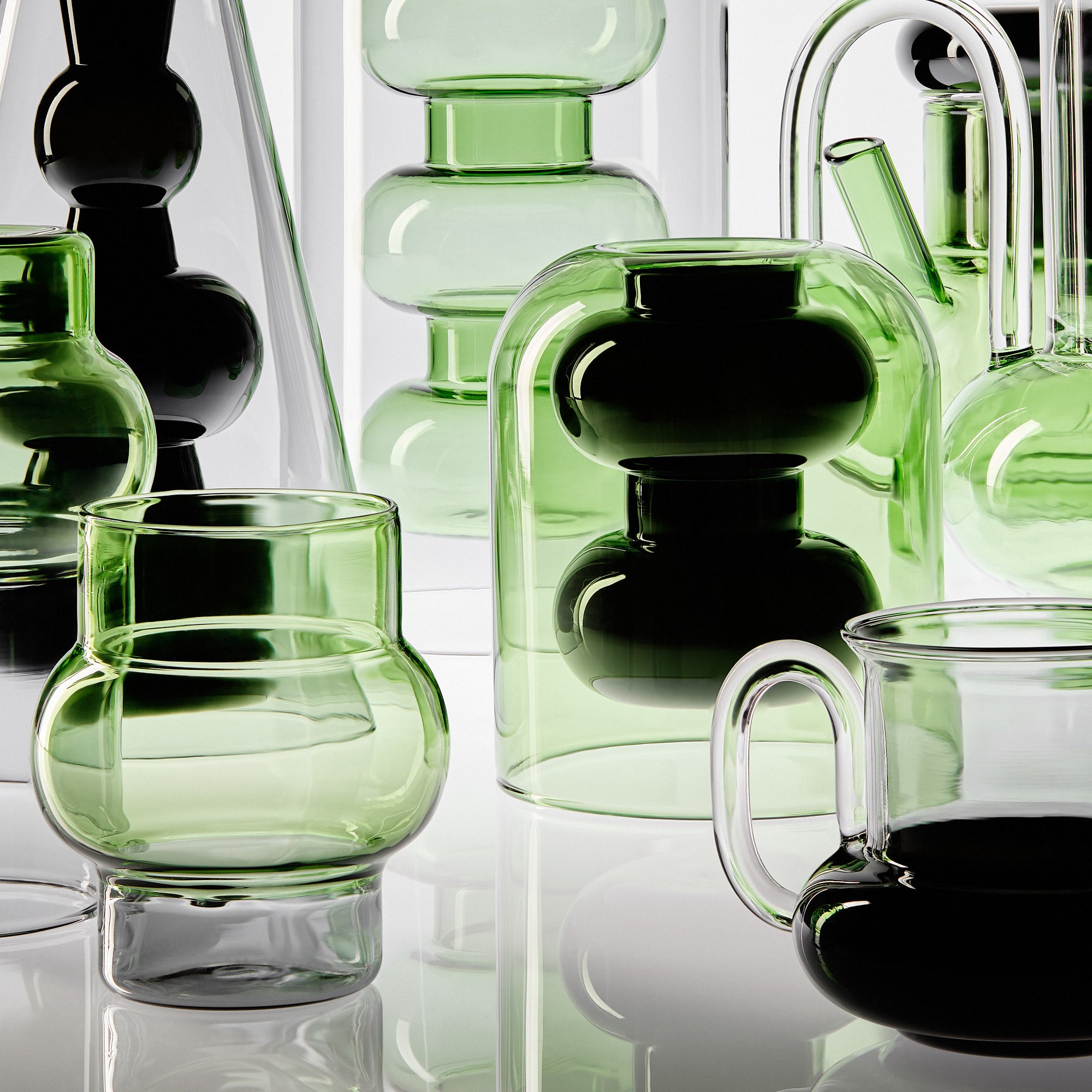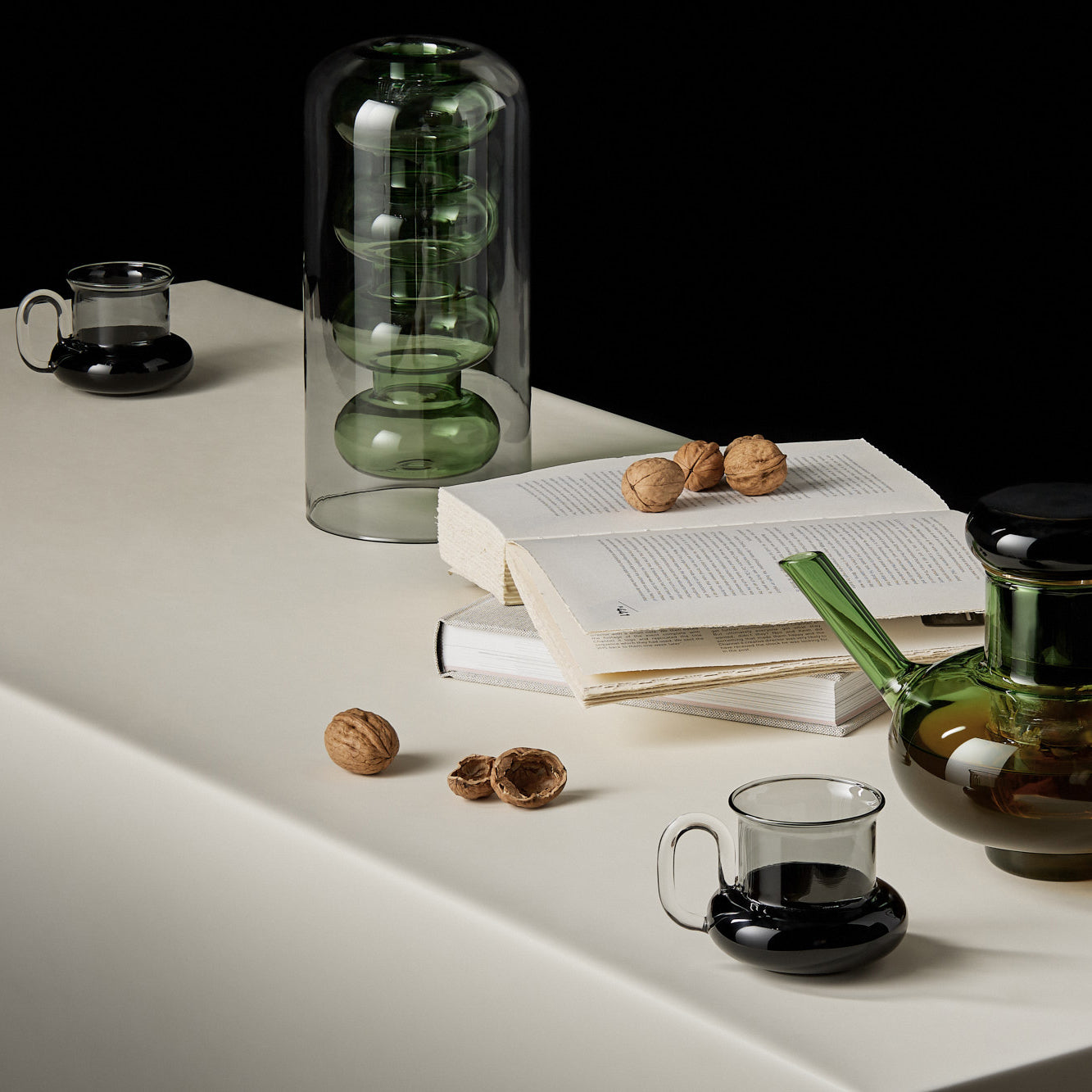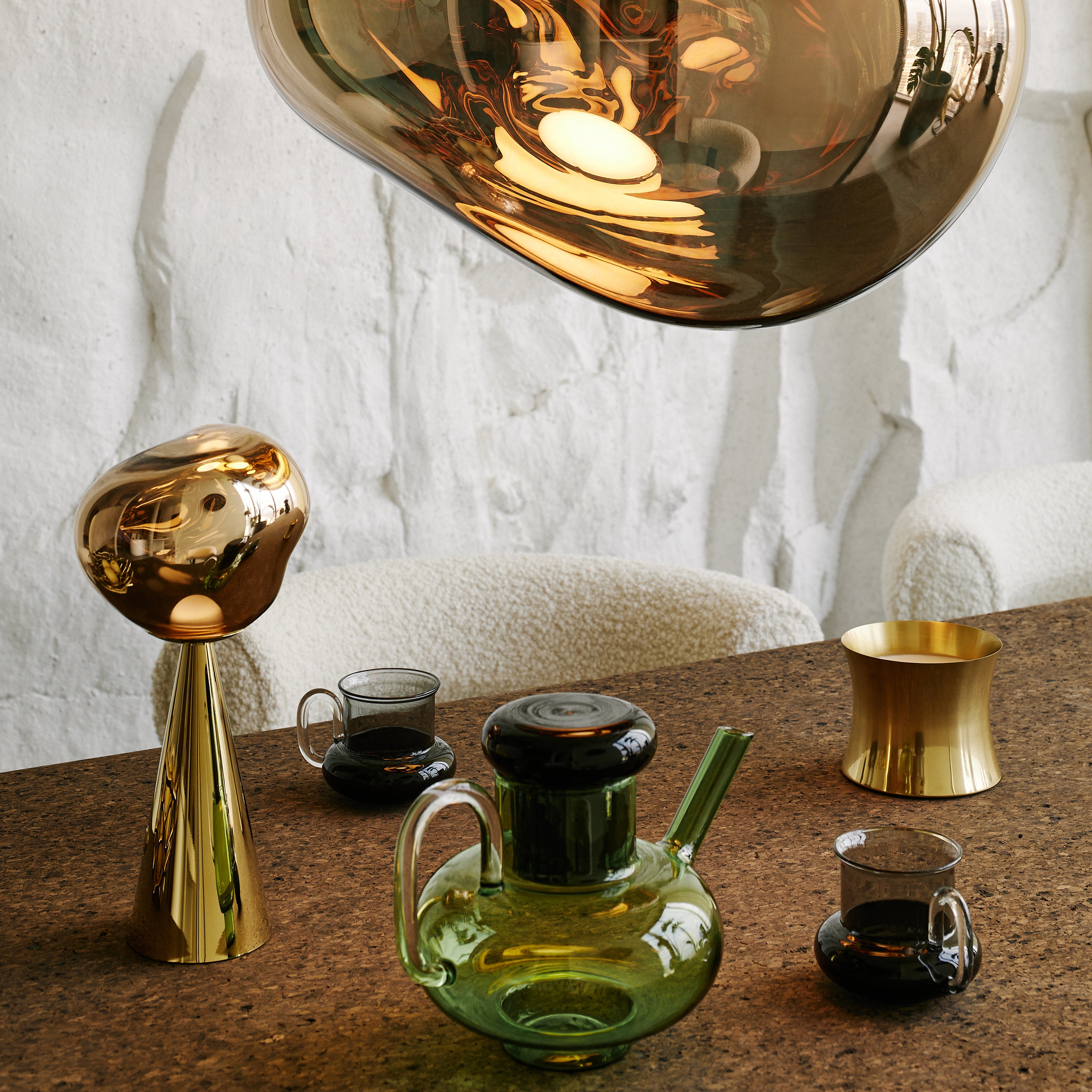 The transparent rose-colored sphere coupled with a more bulbous, inky opaque base lends these squat tea cups a quality to charm more than the visual senses. That notion of transformation via a brew and sip of tea is among the practices Tom Dixon explores with the Bump Collection. Made of hand-blown and heat-sensitive borosilicate glass, the same as laboratory beakers, Bump considers the alchemic powers of tea making, mixology and even flower arranging with this series, some double-walled, and based on conical, spherical and tubular shapes. Pair this duo with the Bump Tea Pot for an enchanting tea-time tête-à-tête.