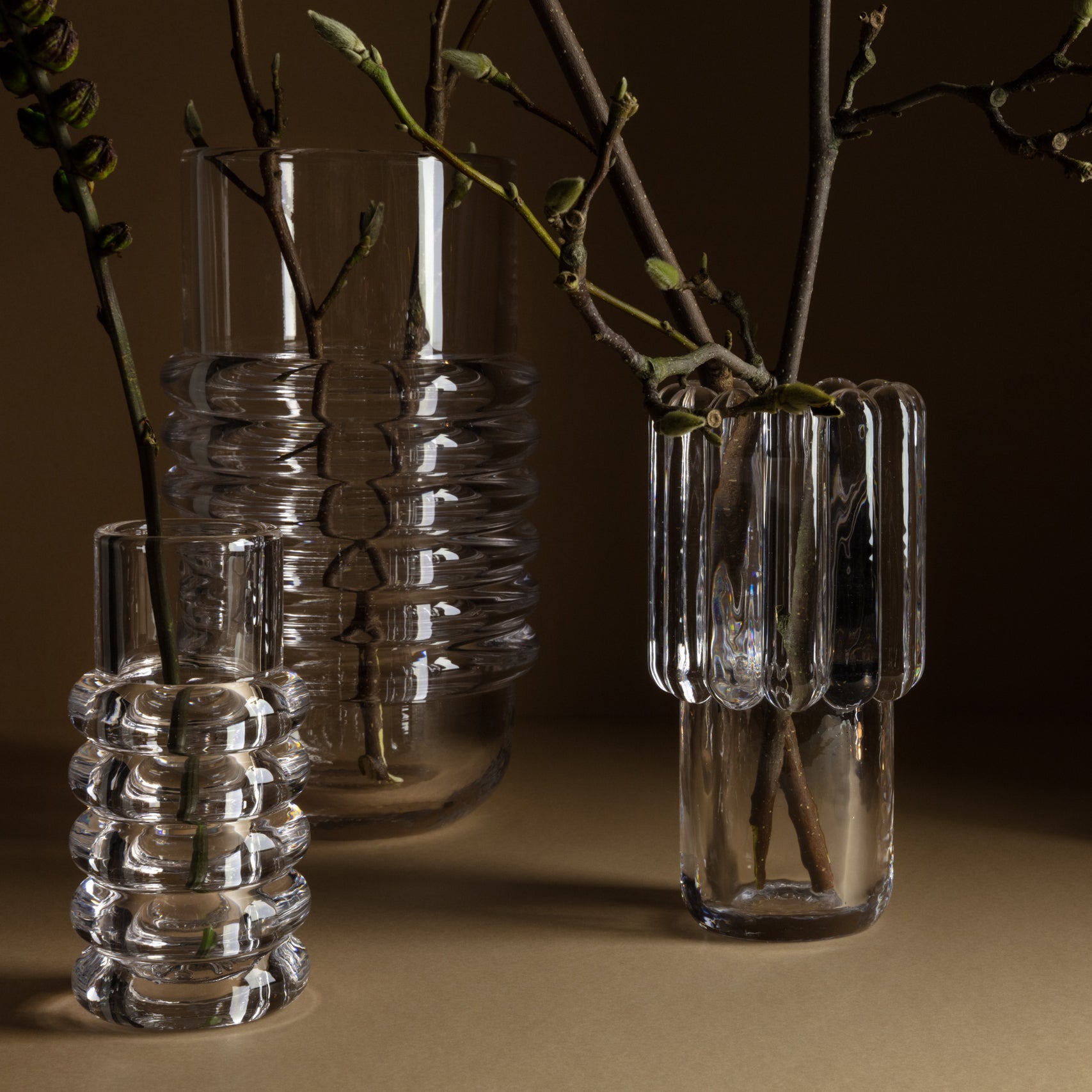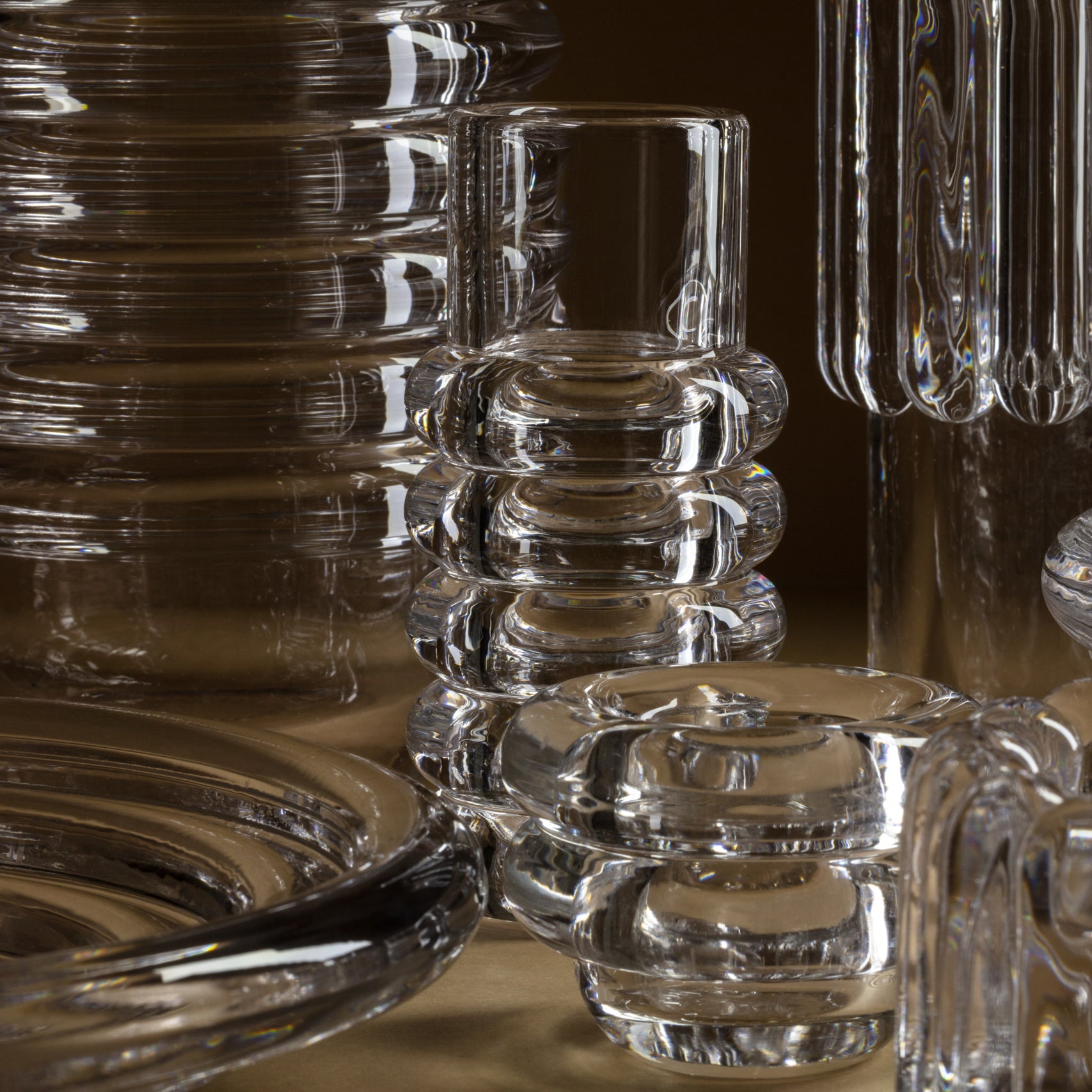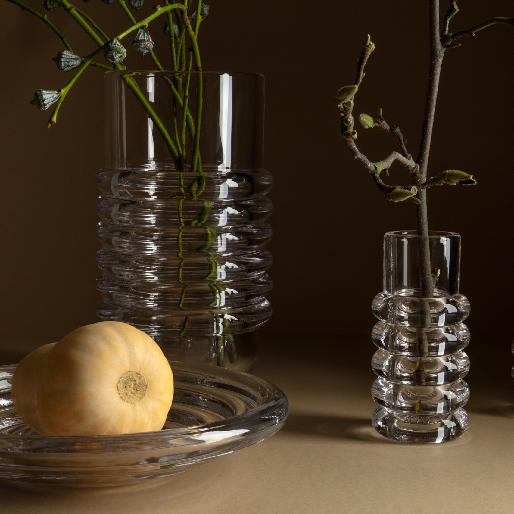 With stacked coils of clearest glass, Press is a vase for long-stemmed blooms that is expressly engineered to catch and refract the light. Tom Dixon's bold design is fashioned by dropping globs of molten glass (1,200 degrees centigrade) into iron-molds to create the rippling silhouette. A lovely and useful host present, it comes in in gift-worthy packaging.