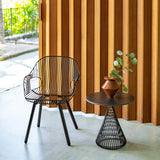 This side table features a sturdy wire cone base made from powder-coated steel, offering durability and support. The compact size allows it to fit well in smaller spaces, making it a practical choice for placement between seating areas. Its ceramic stone top resists scratches, stains, and UV exposure, making it suitable for both indoor and outdoor use. Plastic glides on the feet help protect floor surfaces from damage.