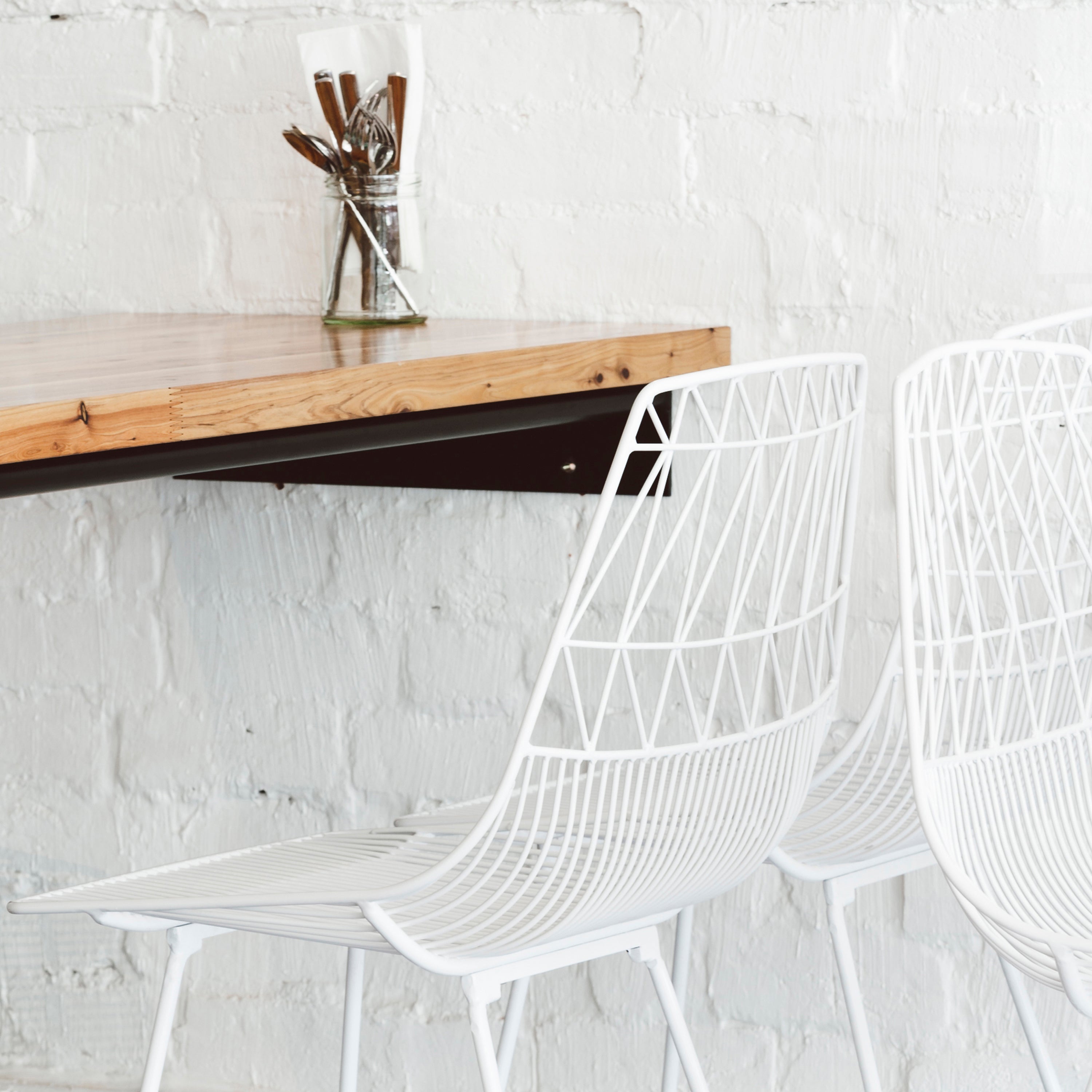 Unlike most wire chairs on the market, Bend chairs are a pleasure to sit on. Gaurav spaces the wires less than a quarter-inch apart and each piece is machine-molded and undergoes upwards of 400 handmade spot-welds—a process he refers to as "bending." Each bend is carefully arranged to ensure structural strength, while the angles of the back, the curves of the seat, and the closeness of the wires are designed to encourage relaxation, comfort and utility. Gaurav, who grew up in the Detroit suburbs and even spent part of his design career at General Motors, draws pattern inspiration from his childhood: the intricate macramé his mother made; string art Spirograph drawing sets. (He was also a part of the design and conception of Clocky with his sister Gauri).