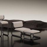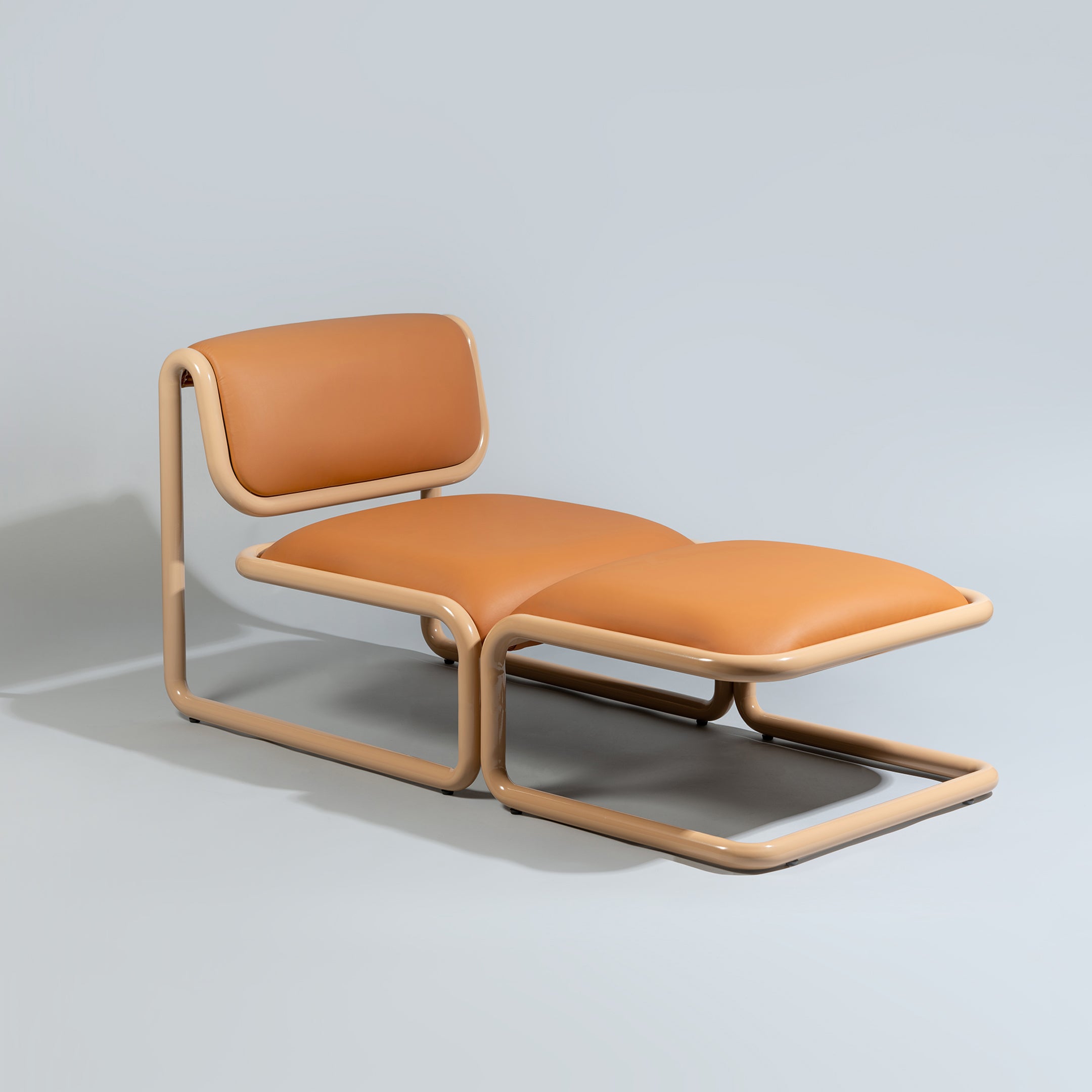 Paired with the companion lounge chair or as an impromptu seat on its own, Tube Ottoman follows Bend Goods collection’s bold cantilever styling. An attention-getter in any space, the footrest offers both luxurious bouclé and rich vegan leather upholstery choices, complemented by the sleek powder-coated aluminum frame.