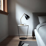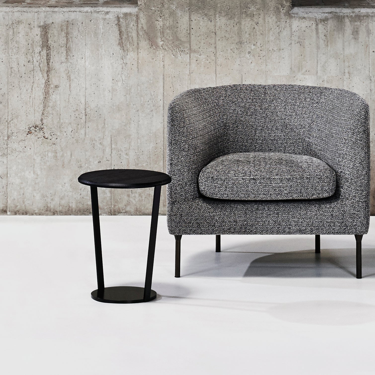 This minimalist side table tapers from a wider tabletop to the narrower base to allow for close placement next to upholstered chairs and sofas. That way, the surface is thoughtfully right at hand to place a drink or book. Around is structured from solid steel with a textured black finish that highlights the characteristic beauty of the wood tabletop on a choice of black or white ash or walnut.