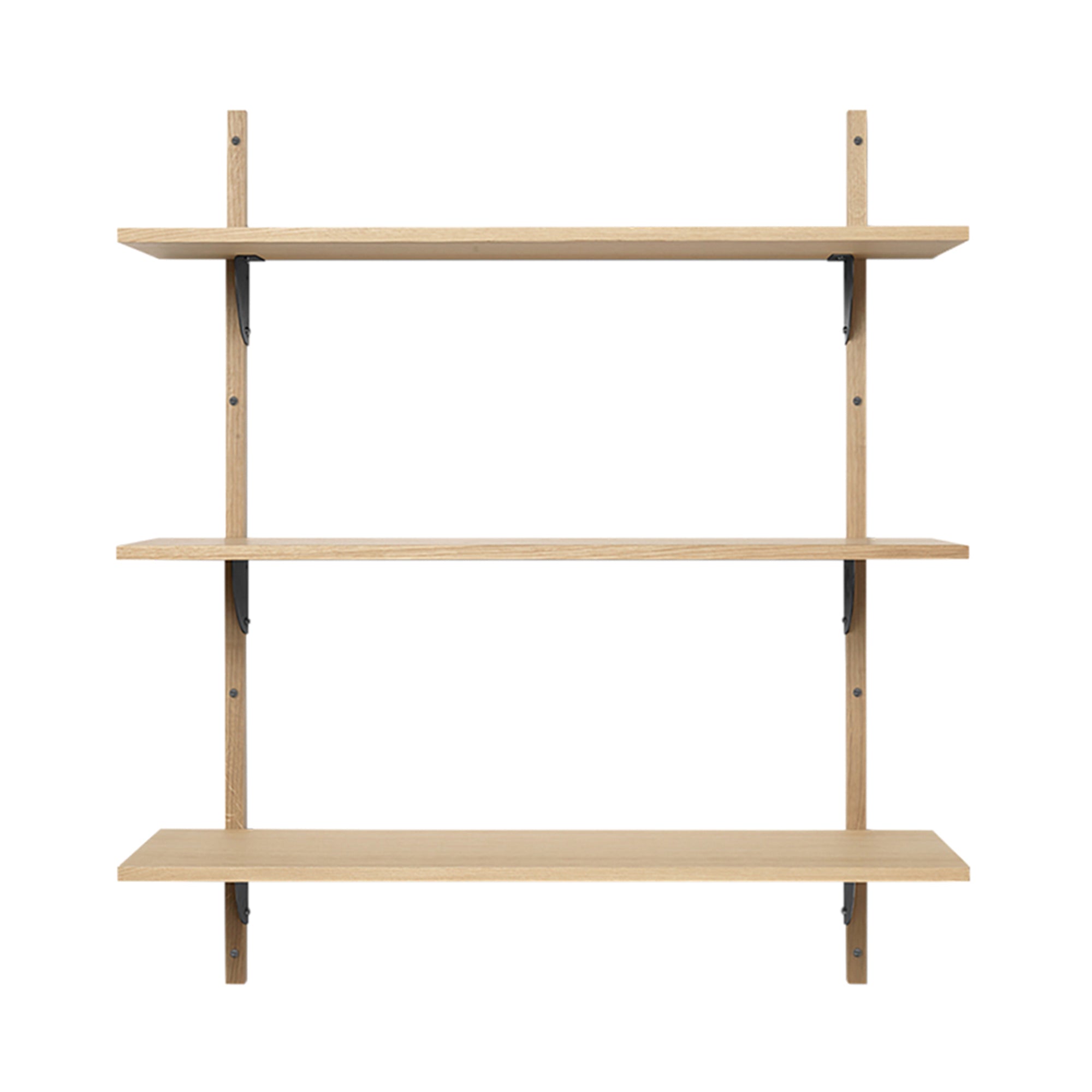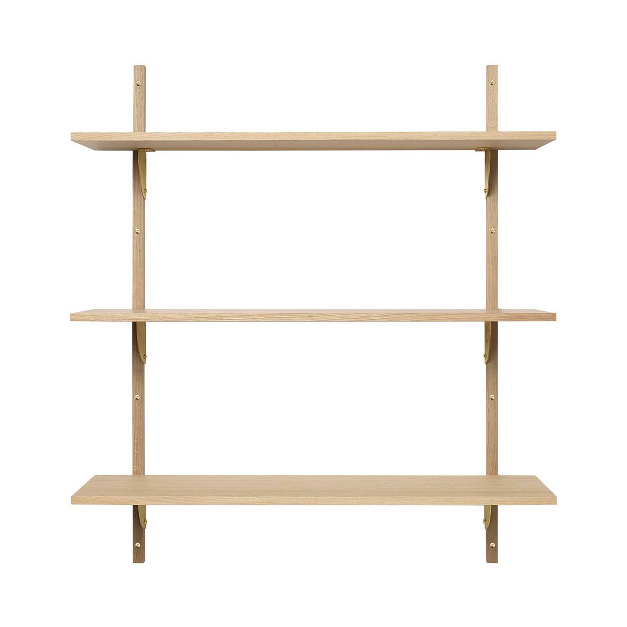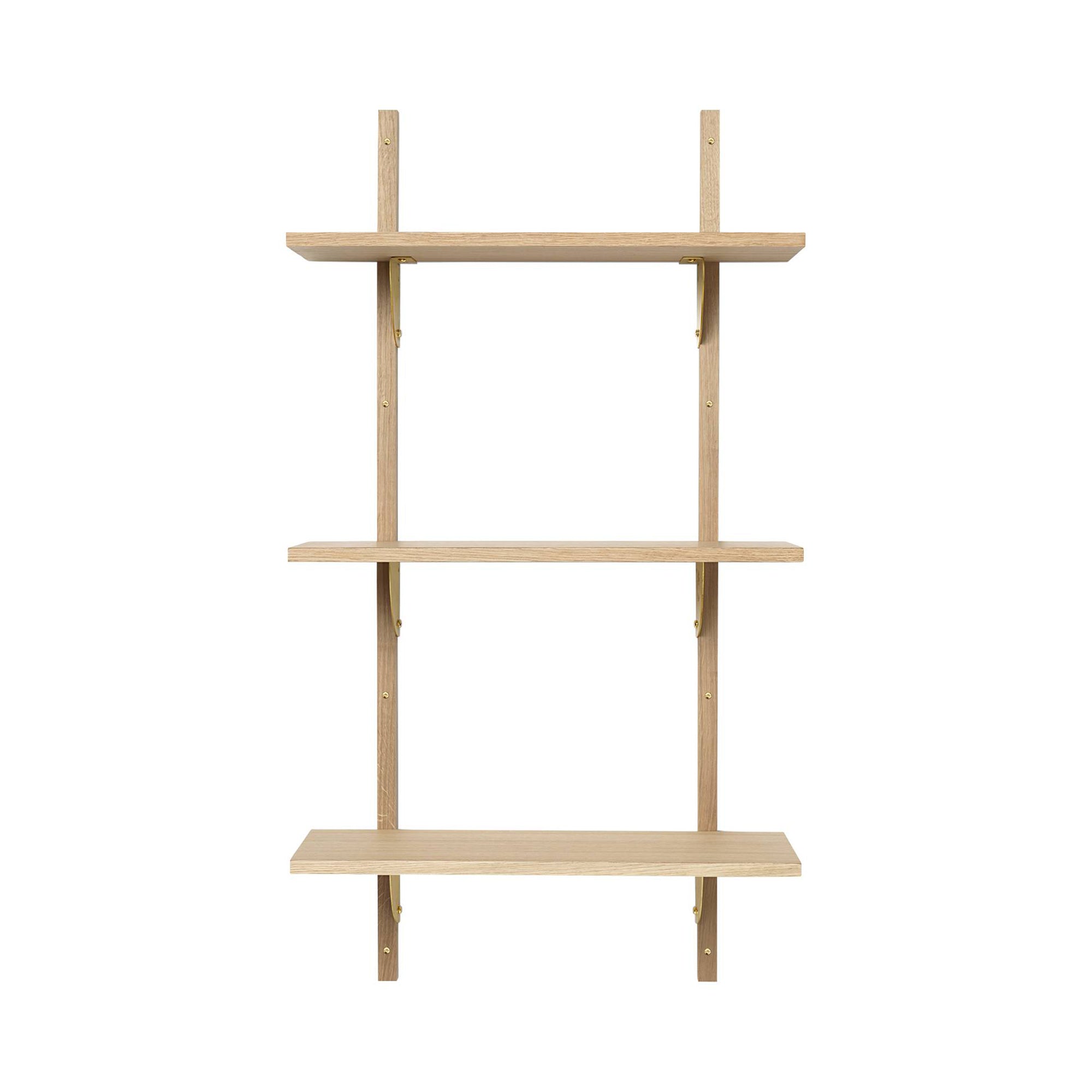 Sector calls to mind midcentury wall-hung shelves but Ferm Living's contemporary take on the storage concept adds a chic brass element. Defined by a sturdy but stylish simplicity, the shelves attach to a wall with the accompanying solid-wood uprights using visible screws. Available in 2 widths and either single- or triple-shelf units, choose from natural oak veneer or black-stained ash veneer shelves to pair with either polished or blackened brass brackets.