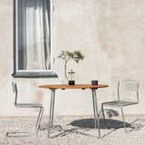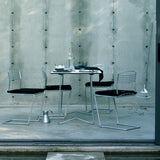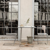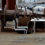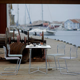 The High Tech Chair by Grythyttan, designed by Nisse Strinning, is built for both indoor and outdoor use. Made from hot-dip galvanized steel, it offers a steel wire seat and a slender bent steel tube frame, ensuring durability and comfort. This stackable chair, introduced in 1984, features a gently rocking seating experience. Its robust construction makes it a reliable and practical addition to various settings, reflecting the quality craftsmanship of Grythyttan.