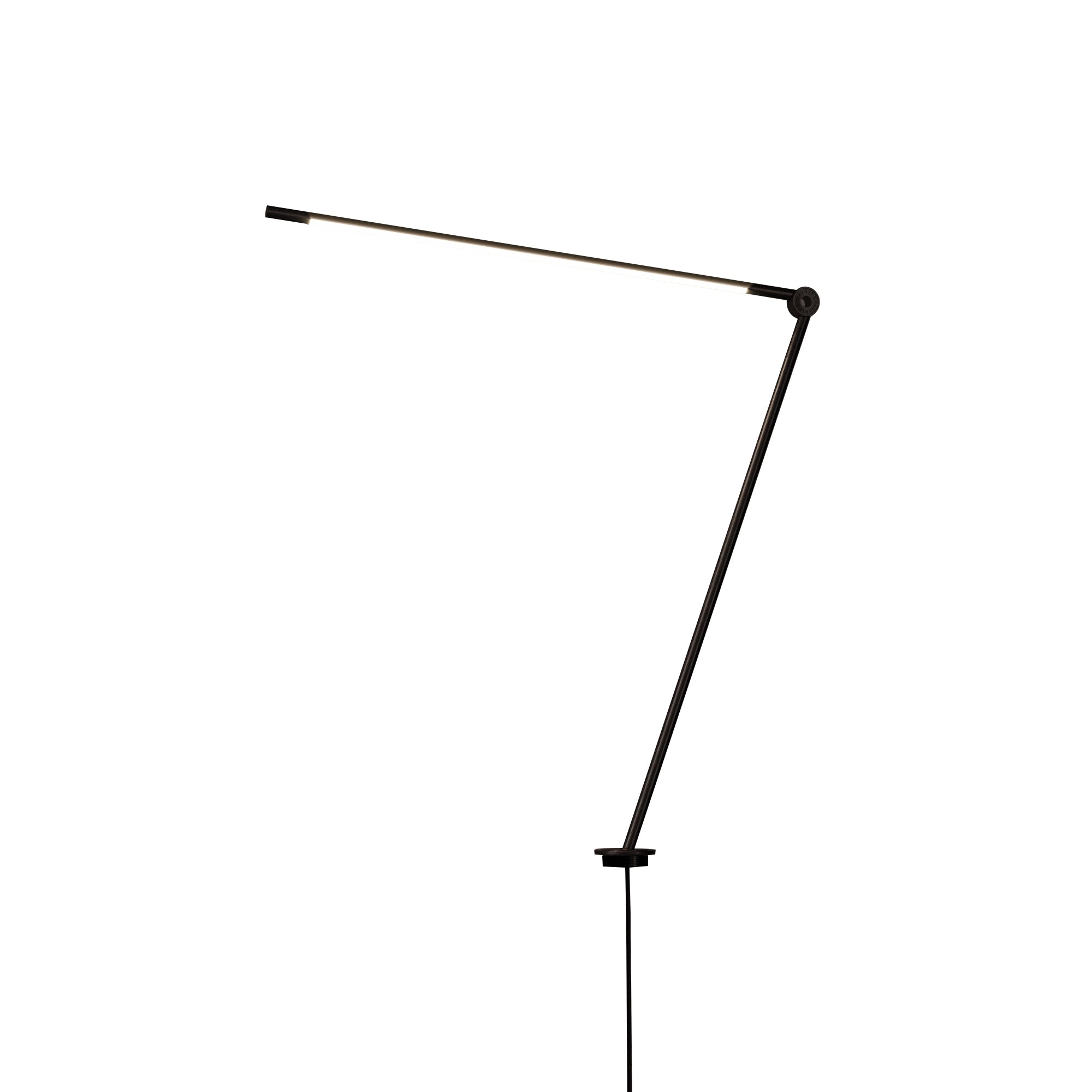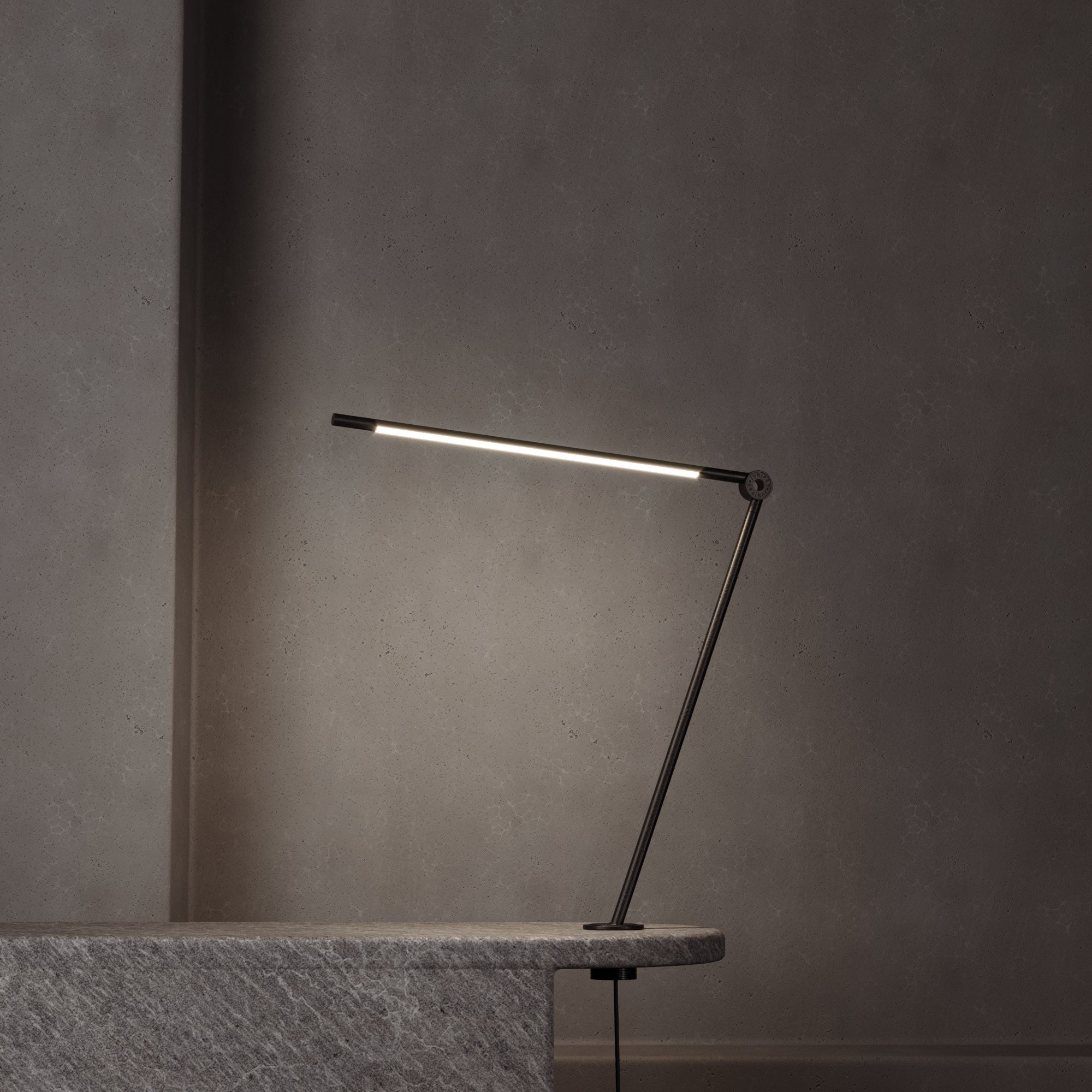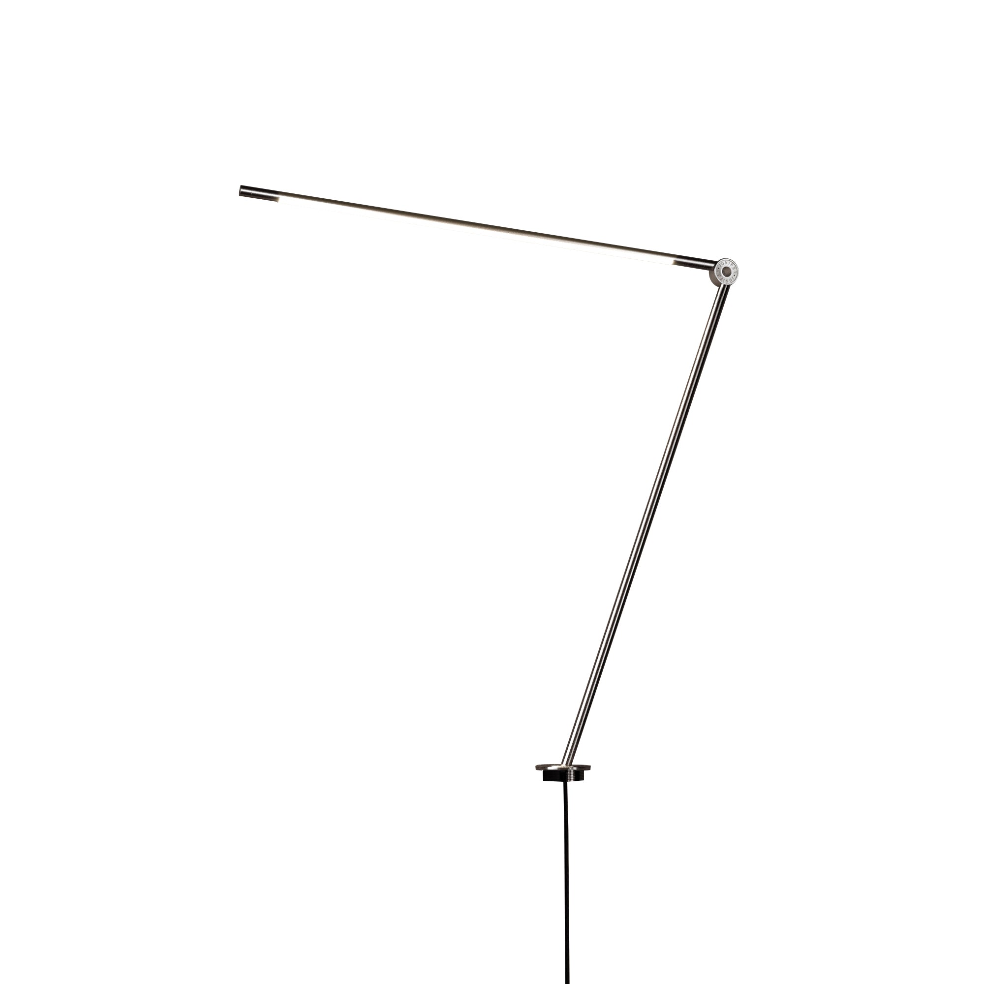 In this case, Thin really is in! By narrowing down form to the nth degree, LED technology triumphs in Thin, an innovative task light. This lithe light stylishly hews to their dicta of efficiency in both space and energy consumption. A folding ultra-thin wand of light—only 1/2 inch!—is mounted on a ball joint that allows for multi-directional movement. Angle and extend arm to 3 feet to stretch over any work surface. This sleek wonder produces an awesome 500 lumens of warm white light, powered by 33 high-powered dimmable LEDs. Turn knob at the end of the light tube to elegantly dim.