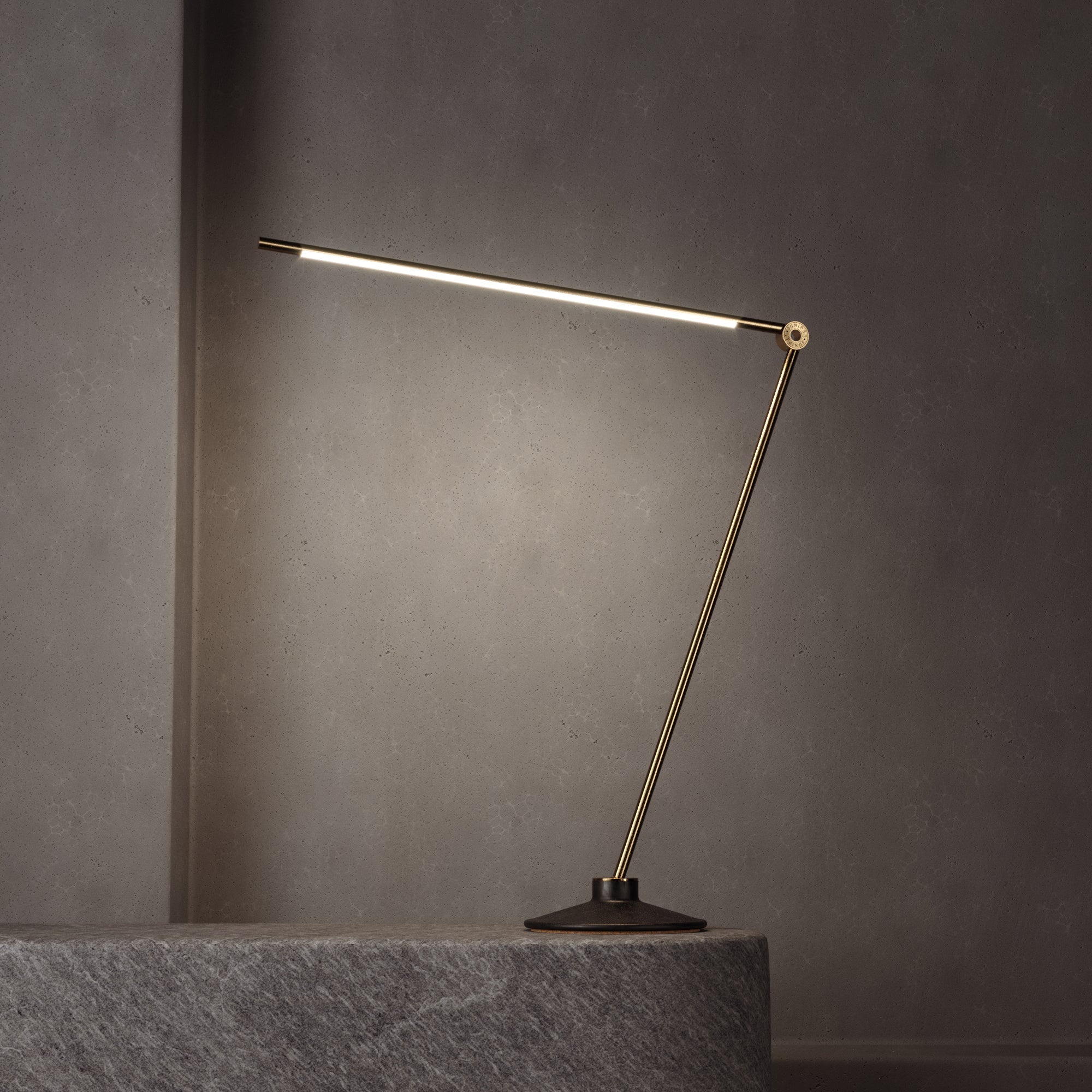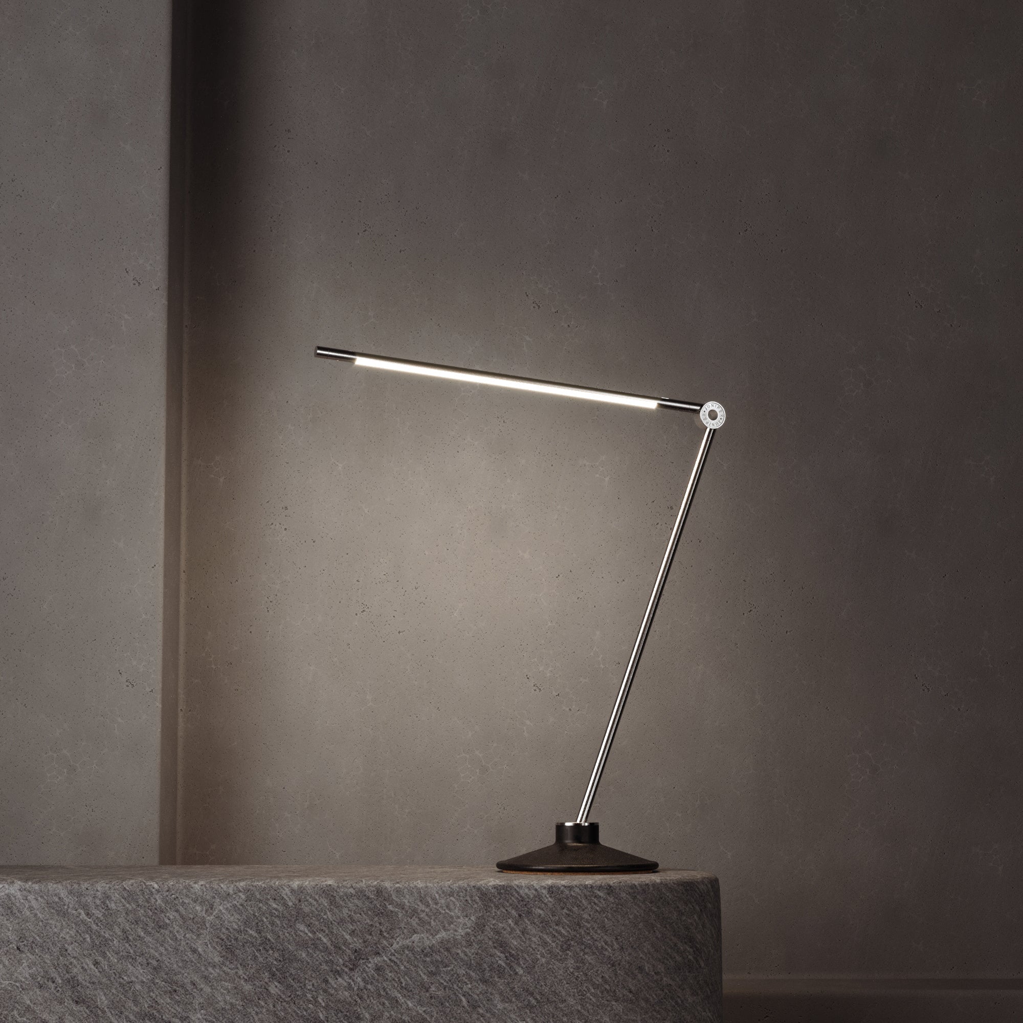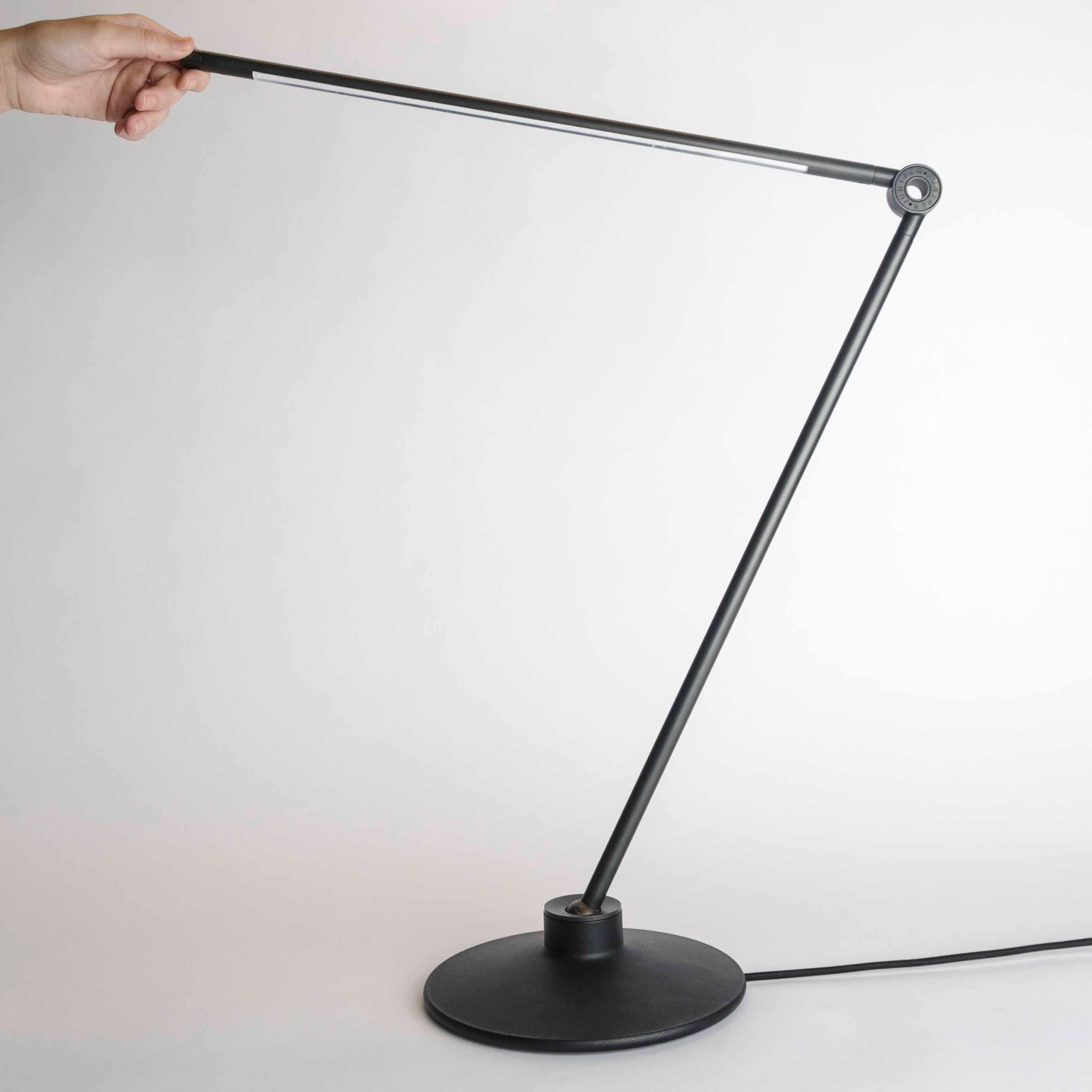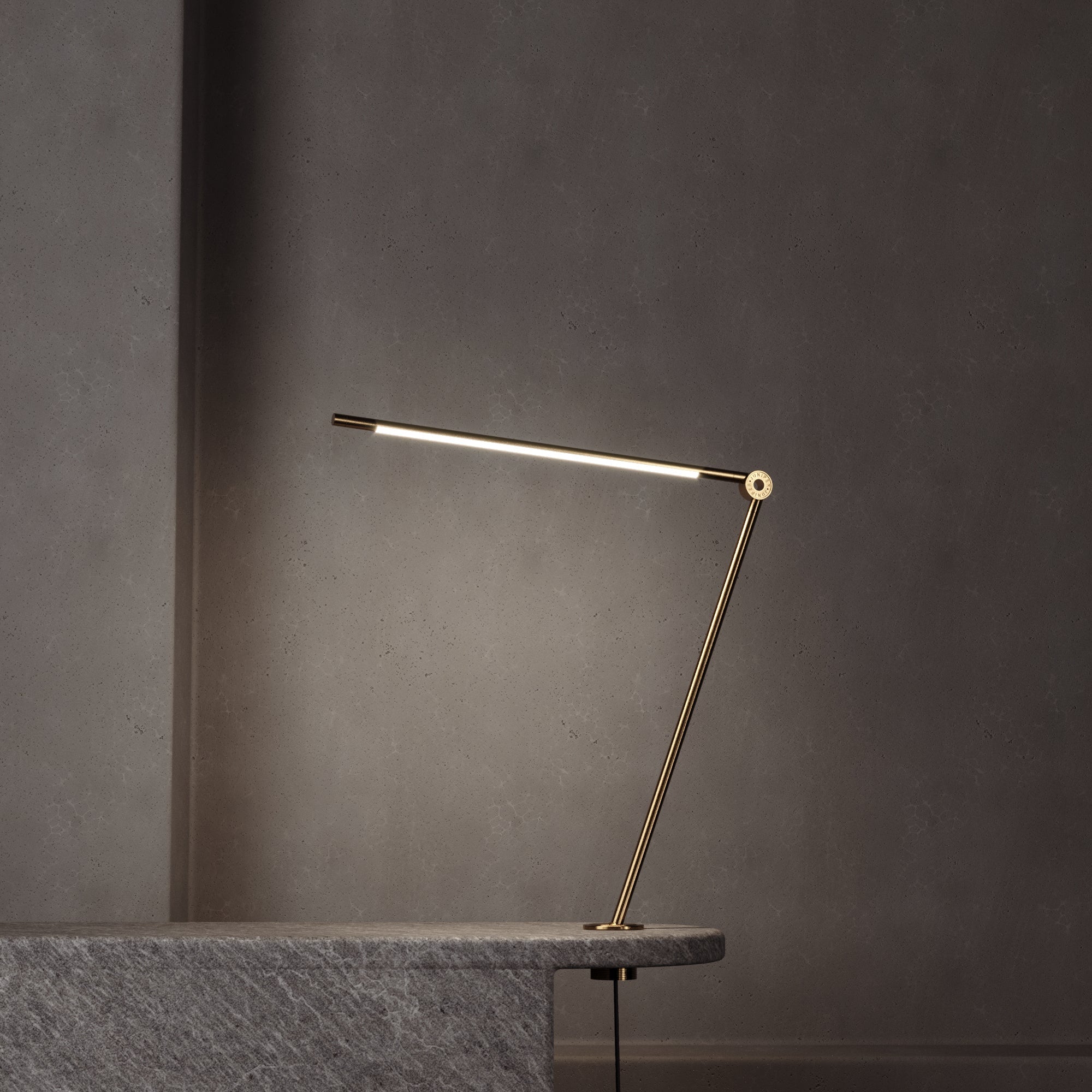 In this case, Thin really is in! By narrowing down form to the nth degree, LED technology triumphs in Thin, an innovative task light. This lithe light stylishly hews to their dicta of efficiency in both space and energy consumption. A folding ultra-thin wand of light—only 1/2 inch!—is mounted on a ball joint that allows for multi-directional movement. Angle and extend arm to 3 feet to stretch over any work surface. This sleek wonder produces an awesome 500 lumens of warm white light, powered by 33 high-powered dimmable LEDs. Turn knob at the end of the light tube to elegantly dim.