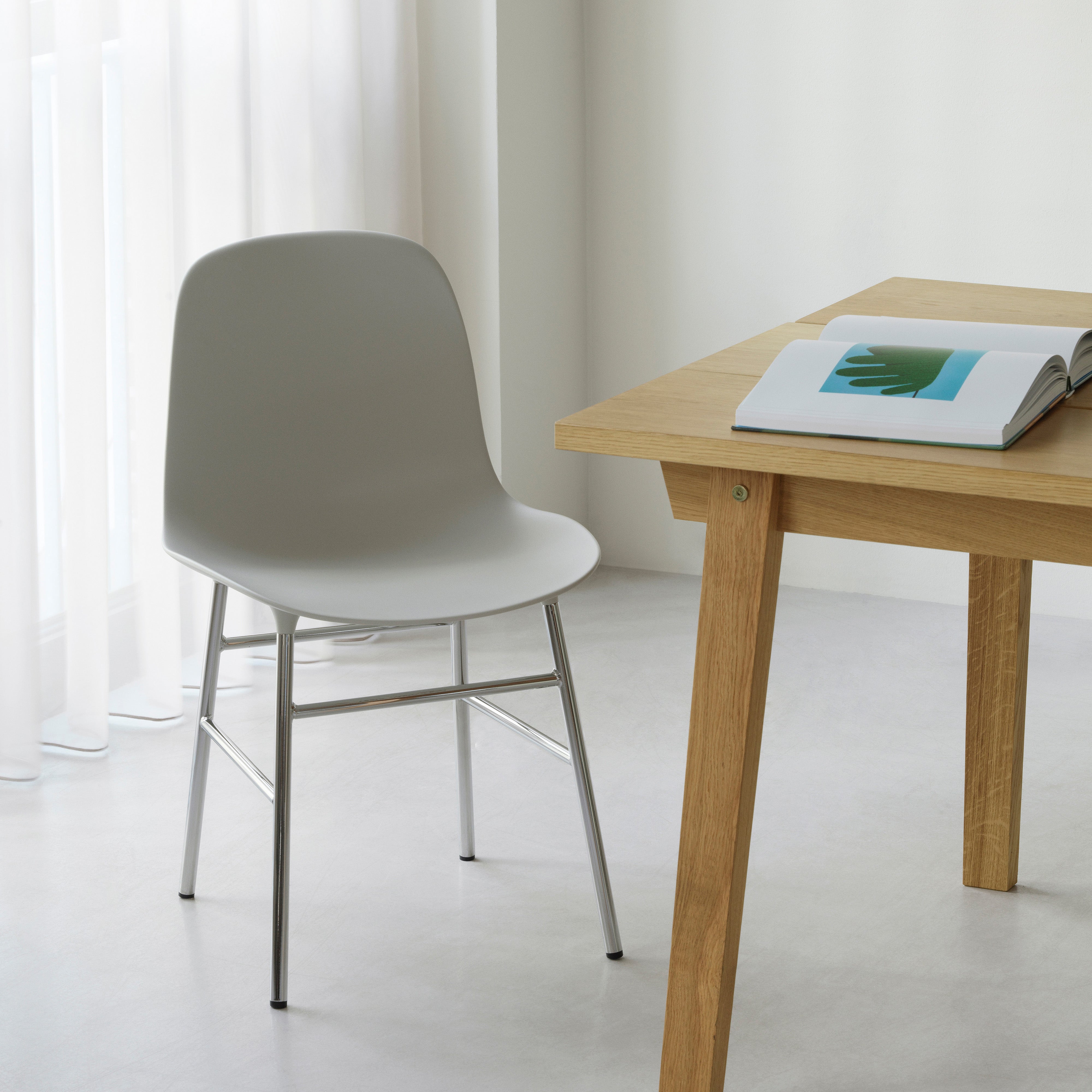 Bright chrome framework punctuates this incarnation of Danish designer Simon Legald's signature Form Chair for Normann Copenhagen. Simon's seamless polypropylene shell chair underwent 20 prototypes over 3 years, before it debuted in 2015. Only then did he find a way to gracefully integrate the molded plastic seat with the steel chair frame for a clean silhouette. The resilient material and contoured shape ensure hours of comfortable seating.
