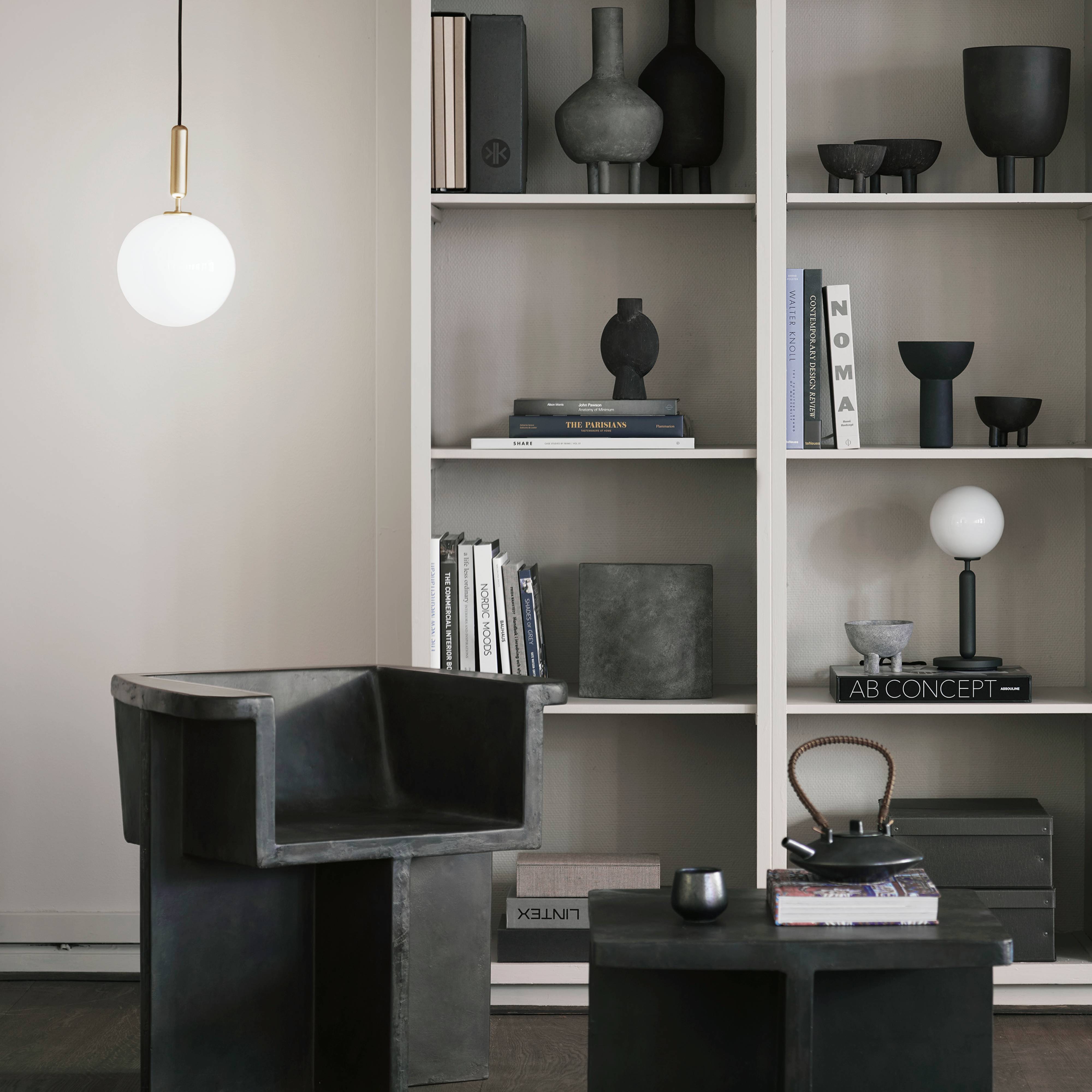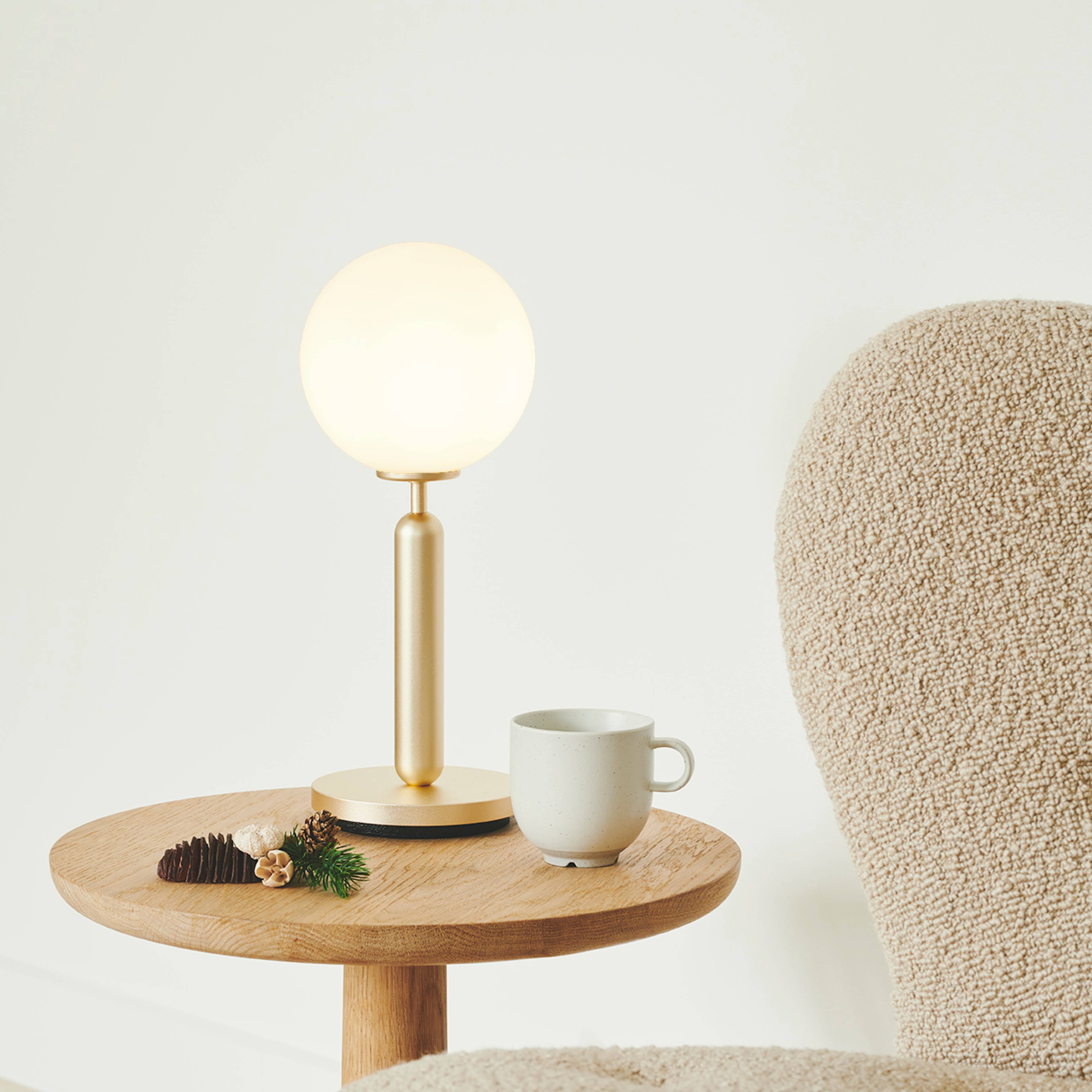 Miira's design motif–a mouth-blown globe in either milky opal glass or clear glass with a unique embossed pattern–gives essential form to this table lamp. The timeless shape embodies the Nordic sense of elegance and devotion to function adopted by award-winning Danish designer Sofie Refer of Nuura. Mounted on a a dark-grey minimal metal stand, the glowing orb's soft, even light reflects a warming vibe on its surroundings.