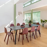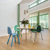 The Body Dining Chair features a backrest that mirrors the human silhouette, offering comfort and visual appeal. Constructed from ash wood with molded veneer layers, the chair showcases smooth, organic lines. It is available in various finishes, including natural and a spectrum of stains. Available with or without armrests.