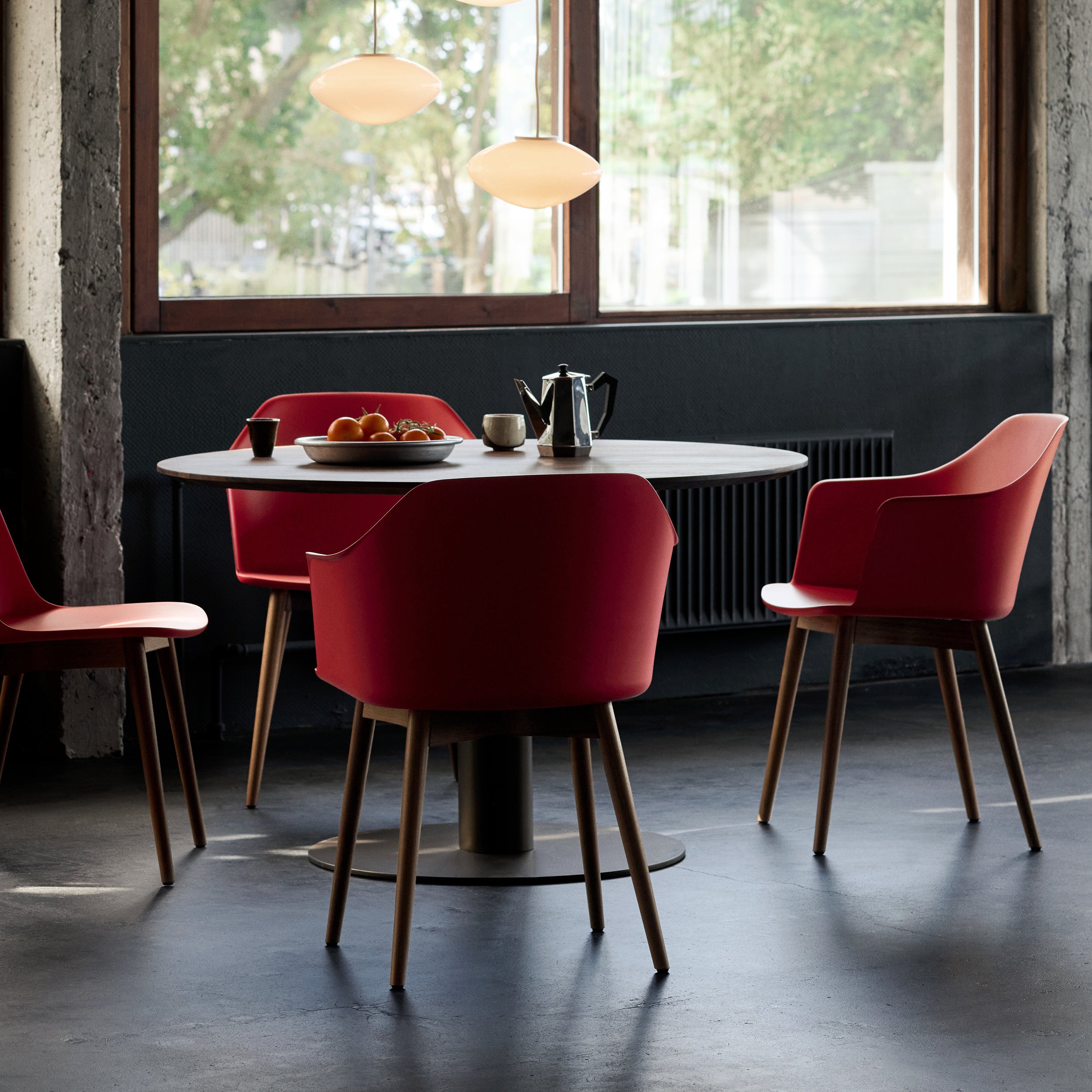 Designer Hee Welling’s original sustainably minded Rely seating has continued to evolve in a variation with solid wooden legs in lacquered oak or walnut. Paired with the 100% recycled plastic molded shell in a variety of Nordic-inspired shades, the result fits seamlessly into interiors with a more organic aesthetic, be they homes or contract spaces.