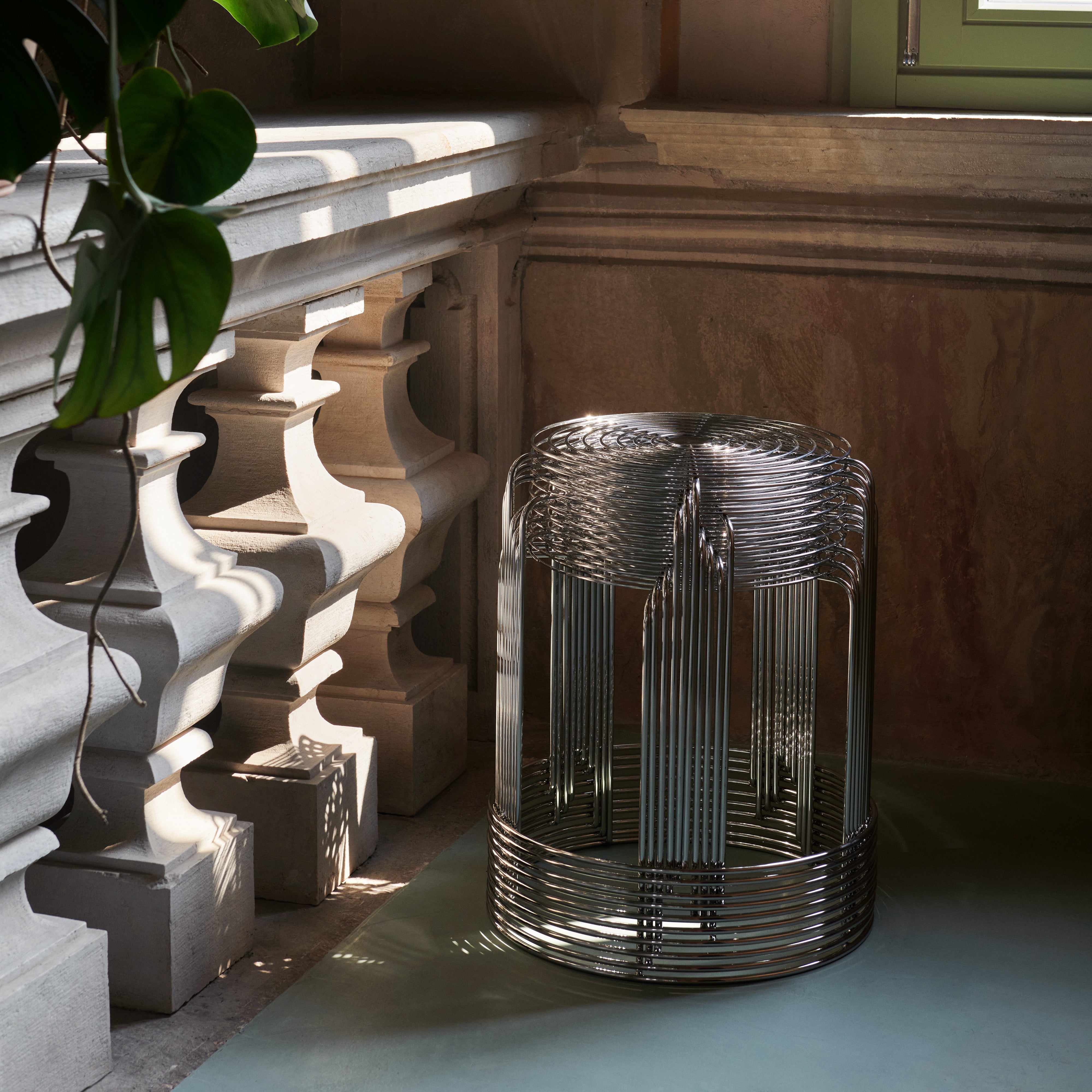 The Wire Stool is an iconic piece designed by Verner Panton, renowned for his innovative use of materials and geometric designs. This stool is crafted from stainless steel wire, forming a simple yet striking geometric pattern. Its stackable nature not only saves space but also creates a visually appealing graphic when multiple stools are stacked together. The airy, transparent design makes it a versatile addition to various settings, functioning equally well as a stool or a side table.