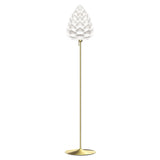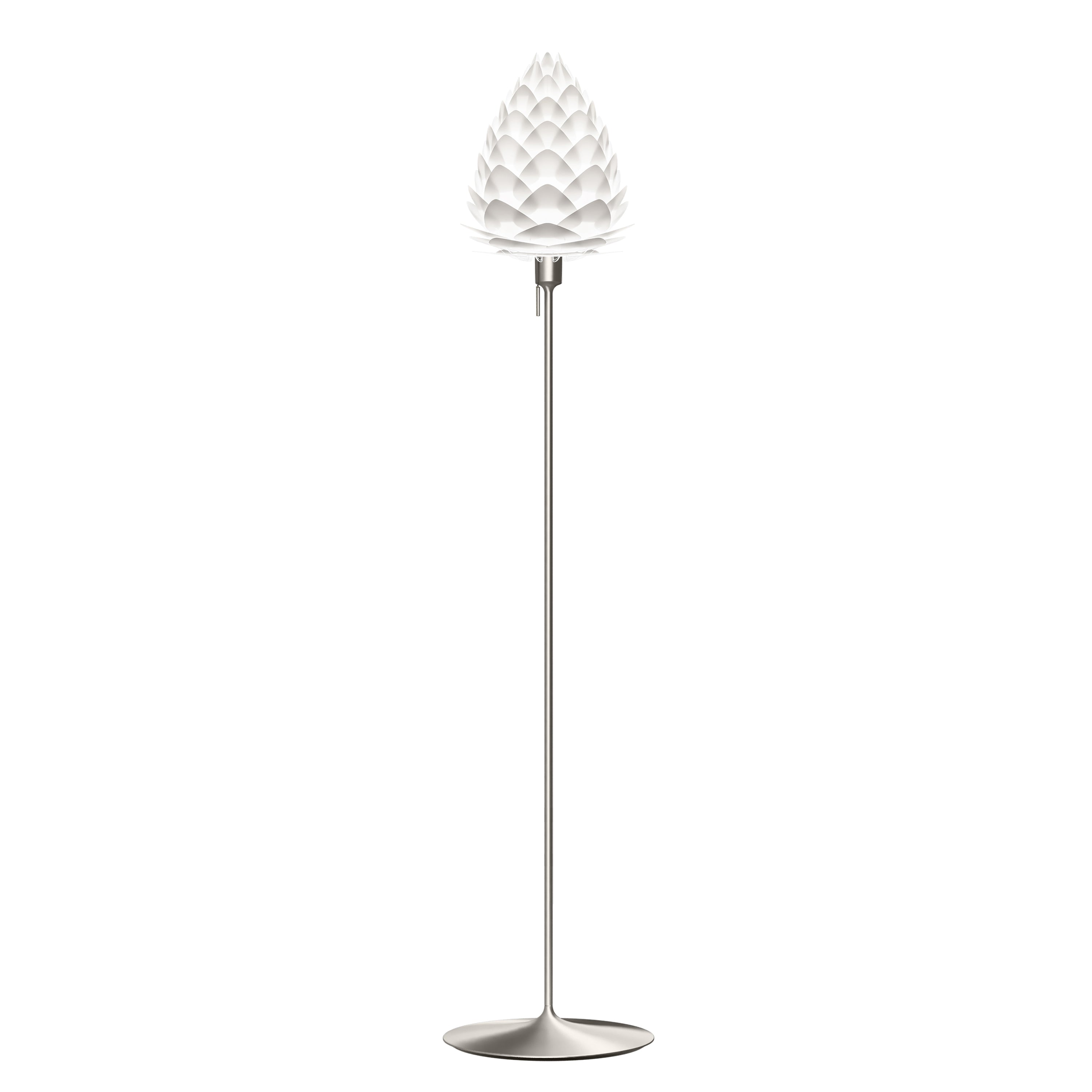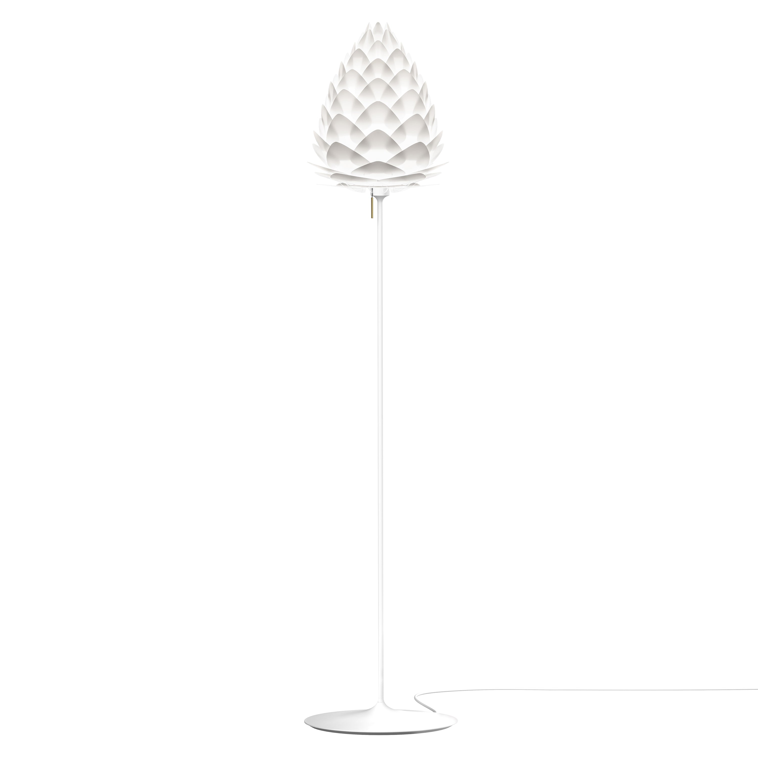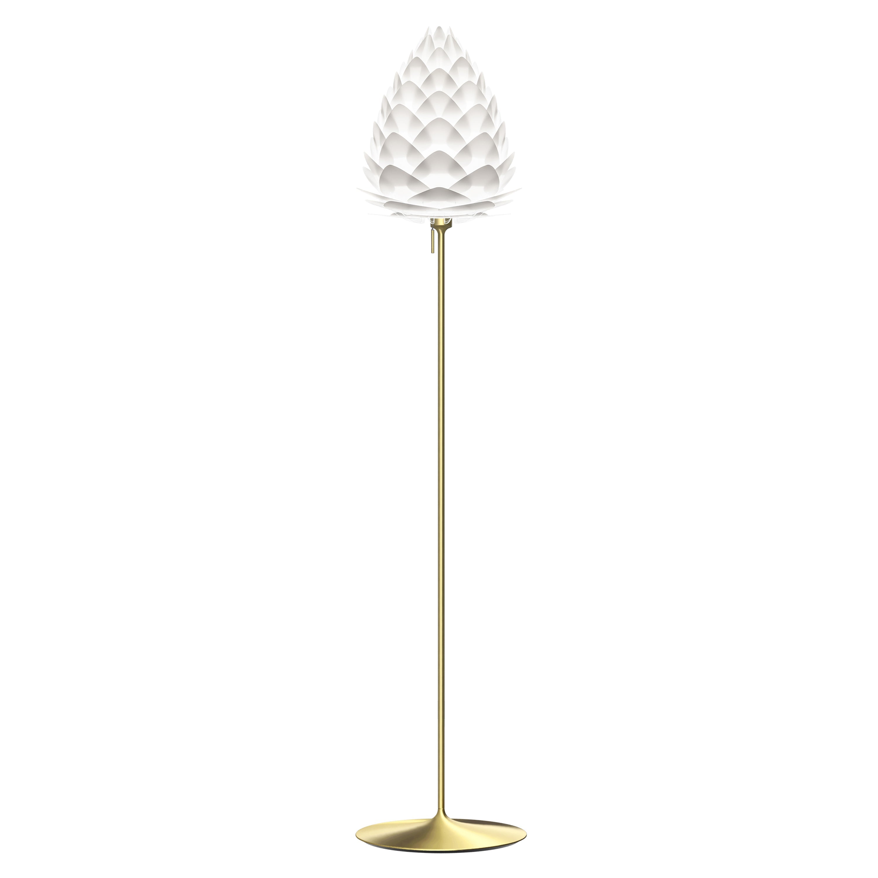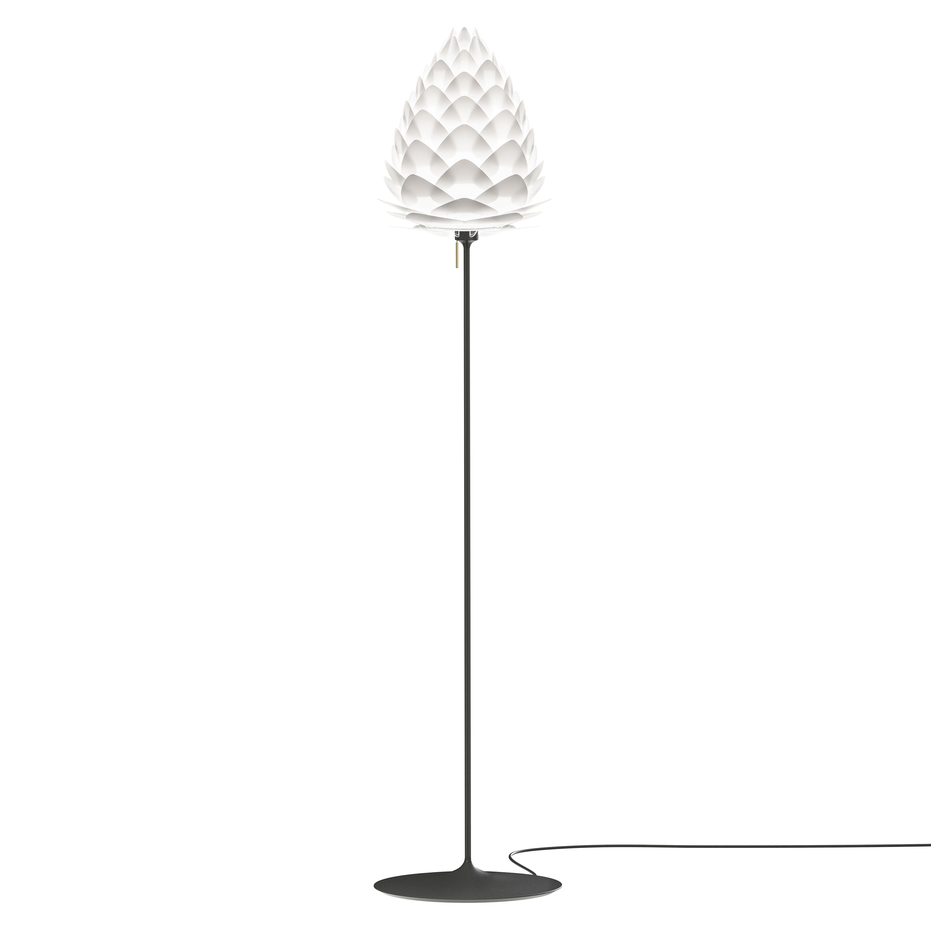 Inspired by the delicate stem of a champagne goblet, Umage offers its organically layered Conia in a floor version with a similarly fluted look. The lightweight yet sturdy stand has a classic pull-switch, adding a traditional detail to its streamlined shape. Available in brushed steel and brass or classic black and white, it pairs stylishly with the cone-shaped lampshade in either the standard medium or playful mini sizes that each diffuse a warm ambient LED illumination.
