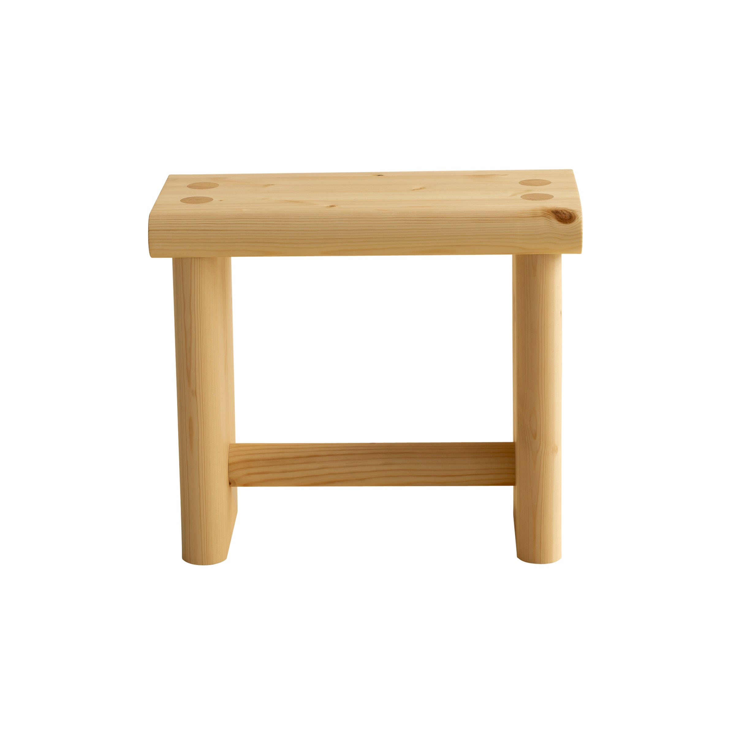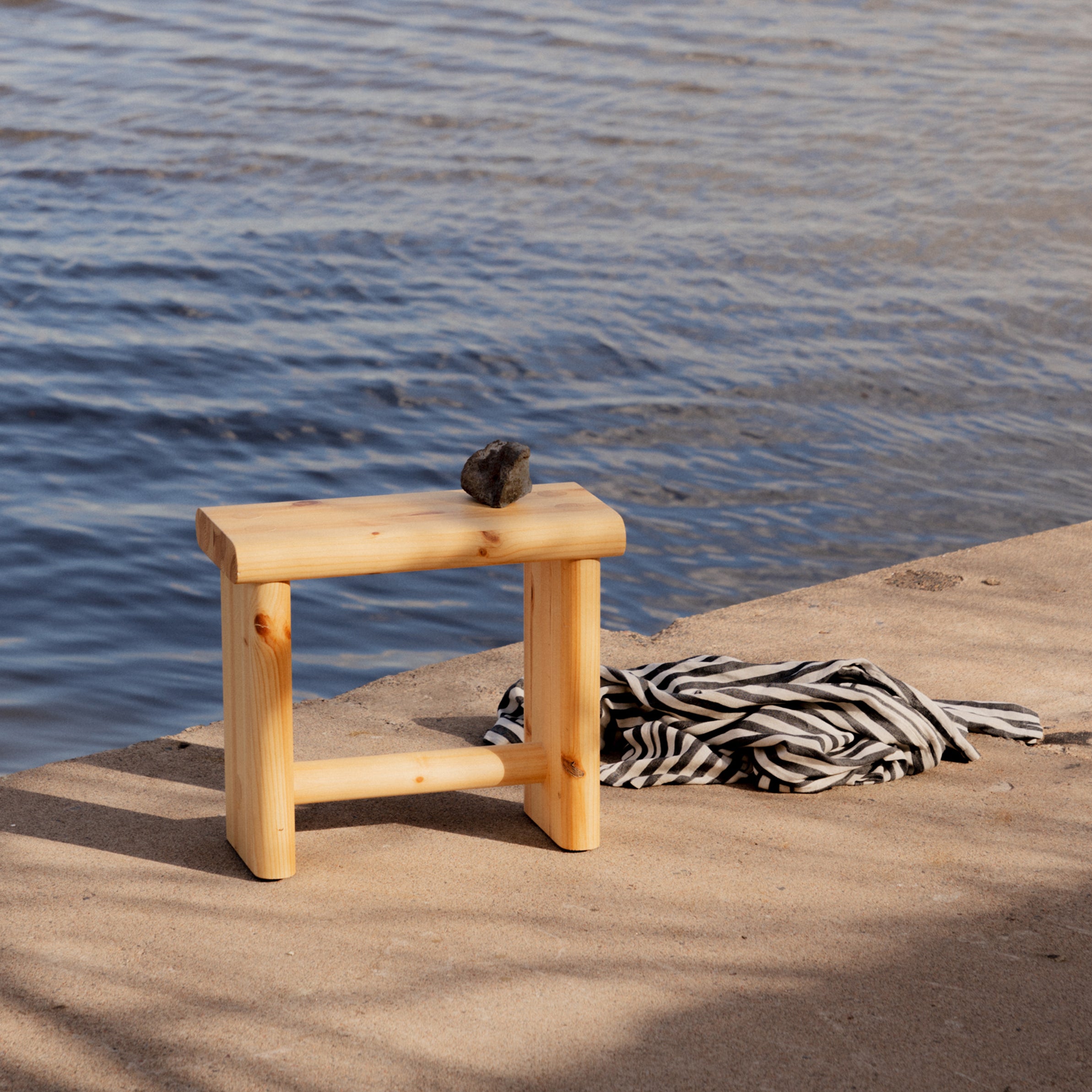 The Vaarnii 002 Ast Stool, designed by Dimitri Bähler, highlights the natural beauty of pine, with gently curved edges and prominent wood grain patterns. The stool is versatile, doubling as a side table, seat, or small bench. The name "Ast" refers to the German word for "branch," reflecting the visible knots in the wood. Over time, the pine will darken to a rich honey tone as it ages, giving it even more character.