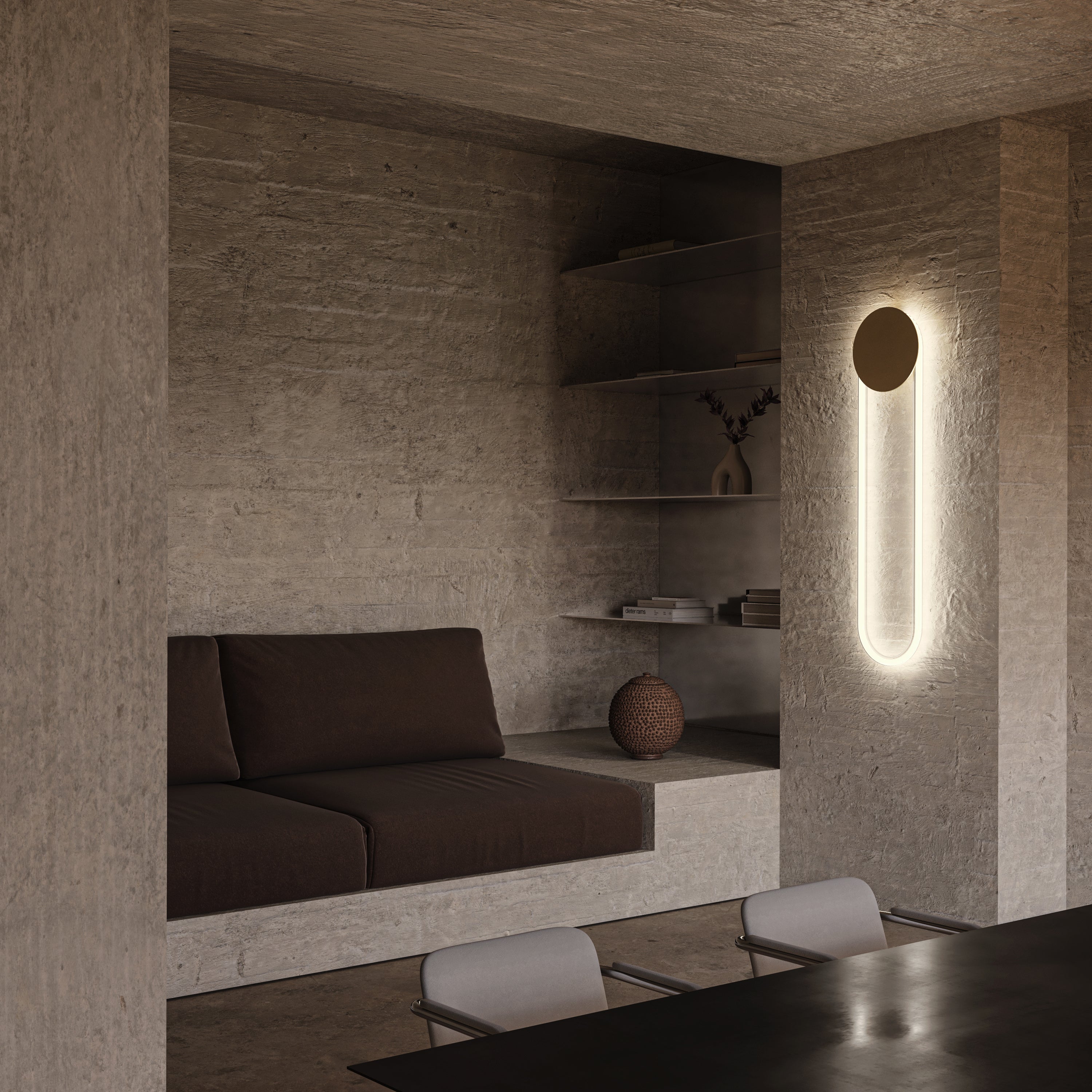 A sophisticated lighting fixture that combines the contrasting elements of heaviness and lightness. The lamp features a borosilicate glass tube and metal supports, creating a visual interplay between solidity and transparency. Originally inspired by neon lighting, the Ra Line reimagines this medium into a centerpiece of warm, luxurious illumination and also offers practical features like dim-to-warm lighting, which adjusts from bright to a more intimate, warmer glow.