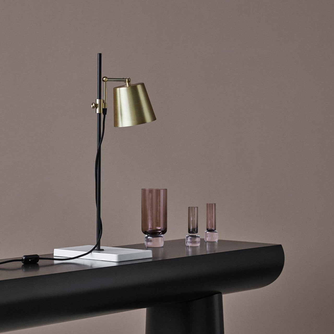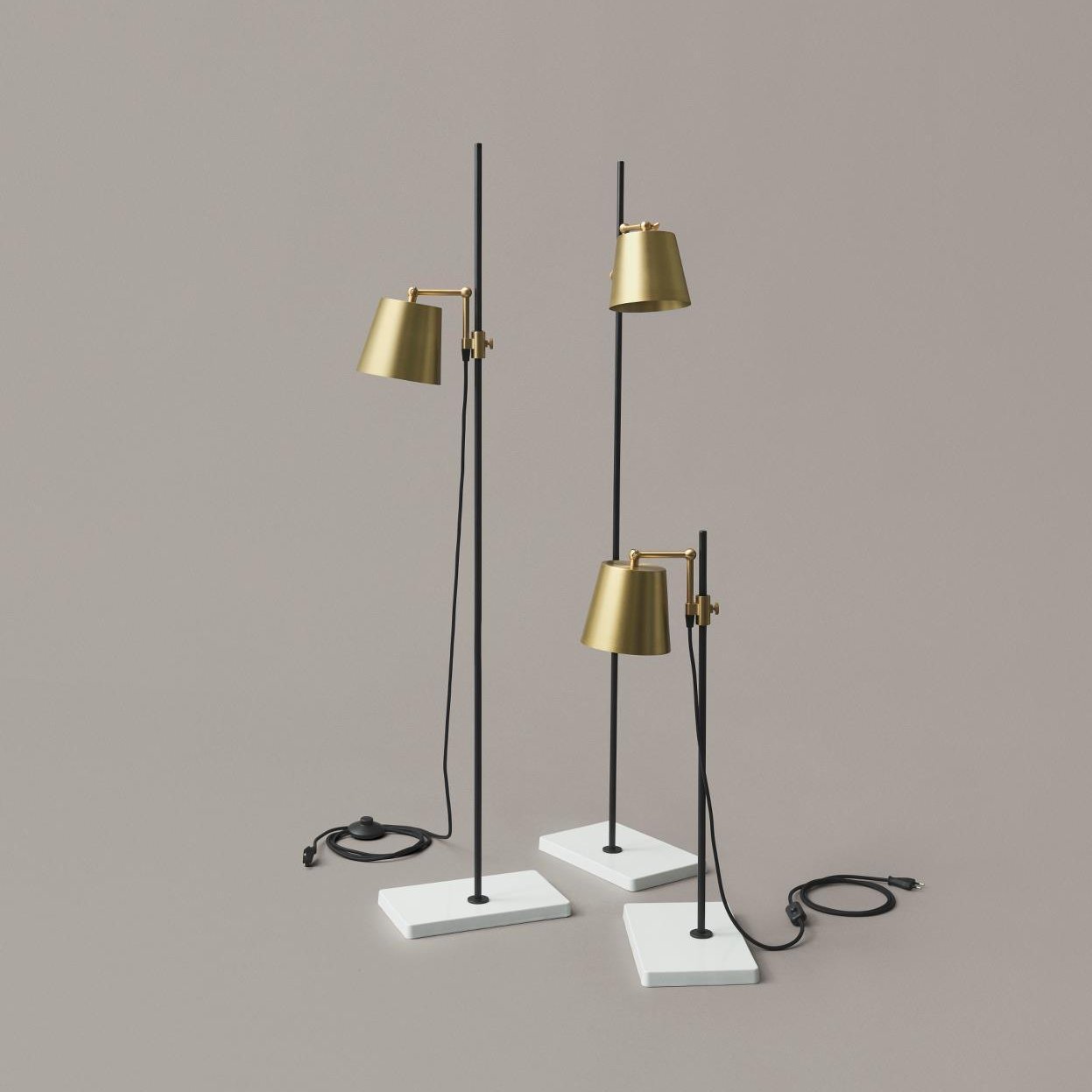 On a desk or table, it's easy to discern the design inspiration for Karakter's Lab Light coming from vintage laboratory equipment with its fantastic clamps and levers. Memories of her parents' pharmaceutical work were translated by Andrea Kleinloog from South Africa's Anatomy Design into a multi-functional LED lamp with a base in porcelain, stem in painted steel, and the lampshade and its rotating arm in brass. Shade can be moved upwards and downwards along the stem to put the light right where it's needed while the lamp's in-line on/off switch is seamlessly integrated into the black fabric cable.