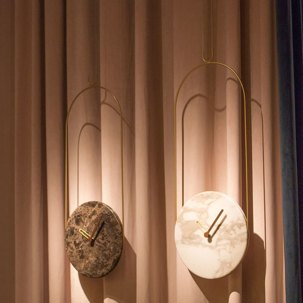 Suspended in a delicately proportioned balance, Colgante features a slim oval that frames the wall clock’s face fashioned in solid walnut wood or genuine marble in a choice of luxurious varieties. Handmade in Spain, Nomon’s timepieces offer the finish of a fine piece of furniture and are precision-powered by a German-origin quartz