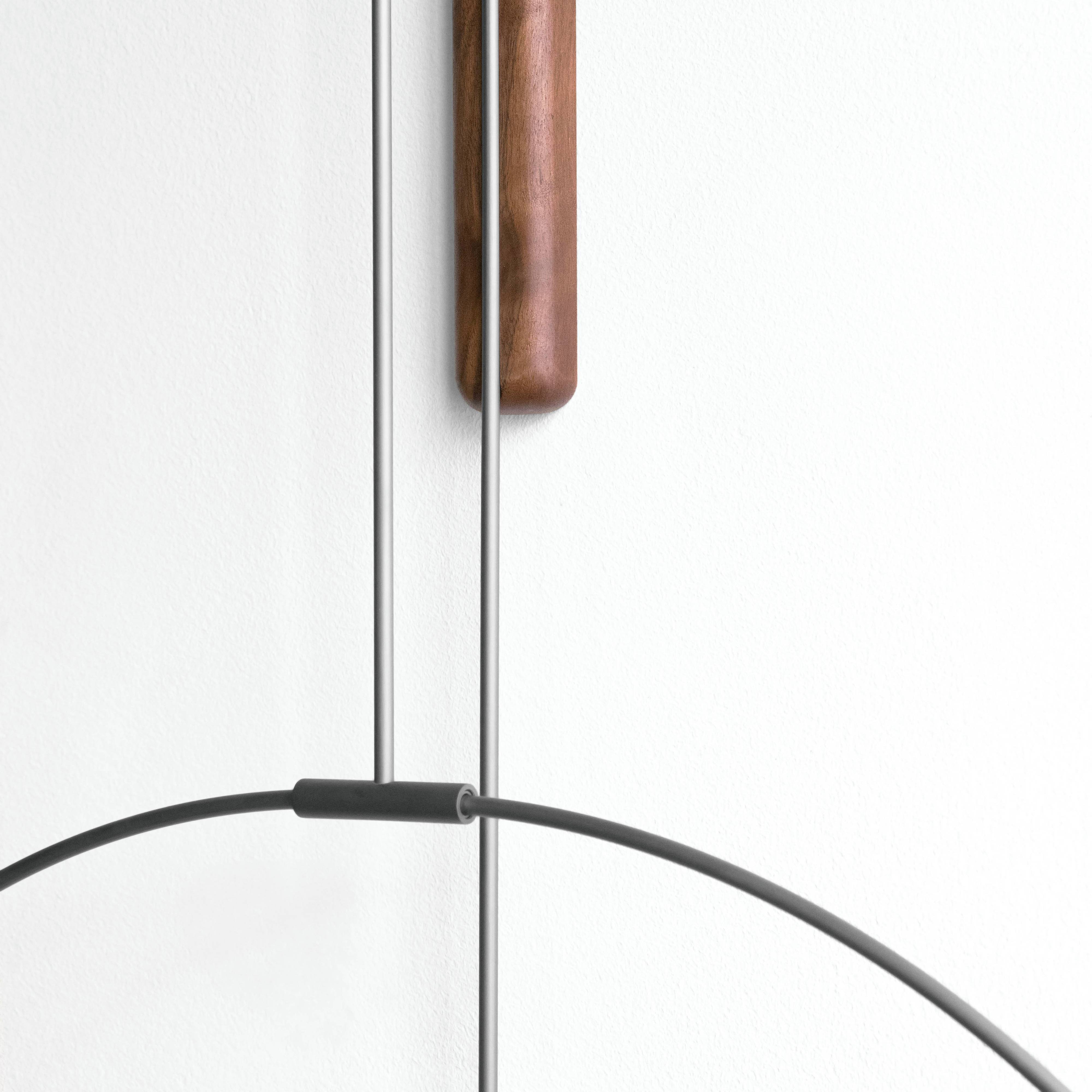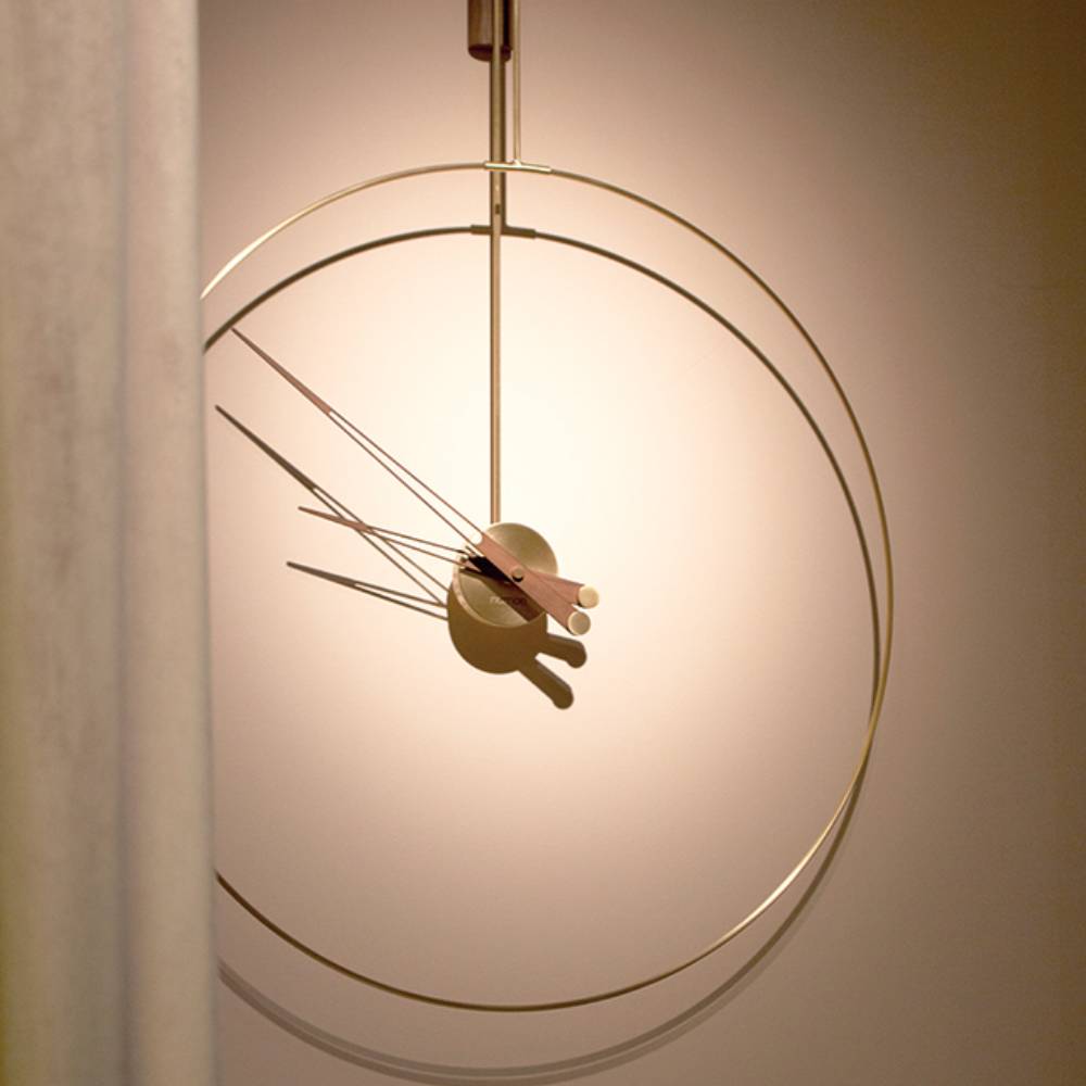 In Mini and Micro variations, Daro from Spanish brand Nomon takes form with its ring structure suspended from a vertical wall mount trimmed in solid walnut to match the clock's hands. Casting intriguing shadows on the wall behind, the construction offers a choice of polished brass or graphite-finished brass for the metal frame and center round box. Powered by German-origin precision quartz works, the piece is completely handmade, with attention paid to every detail.