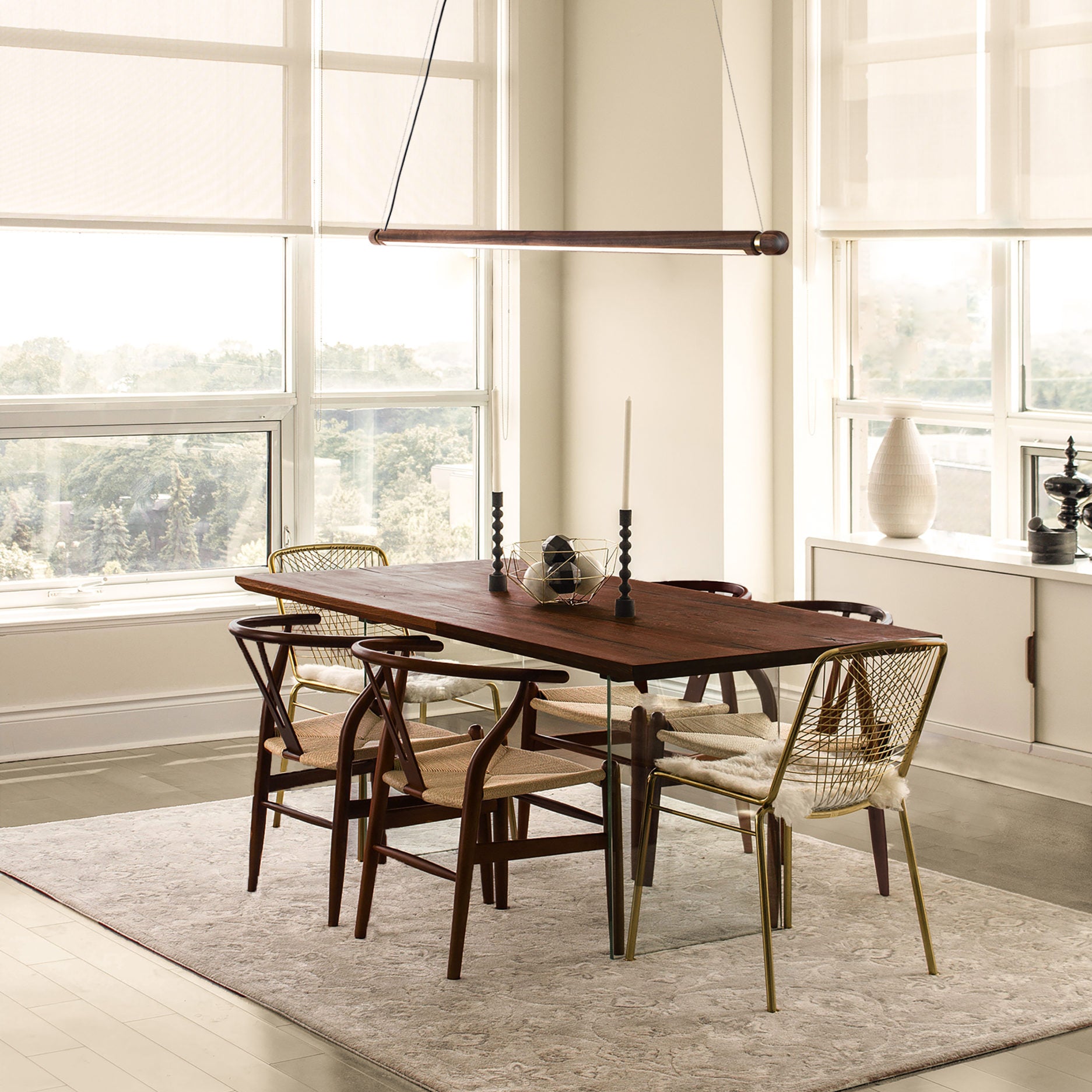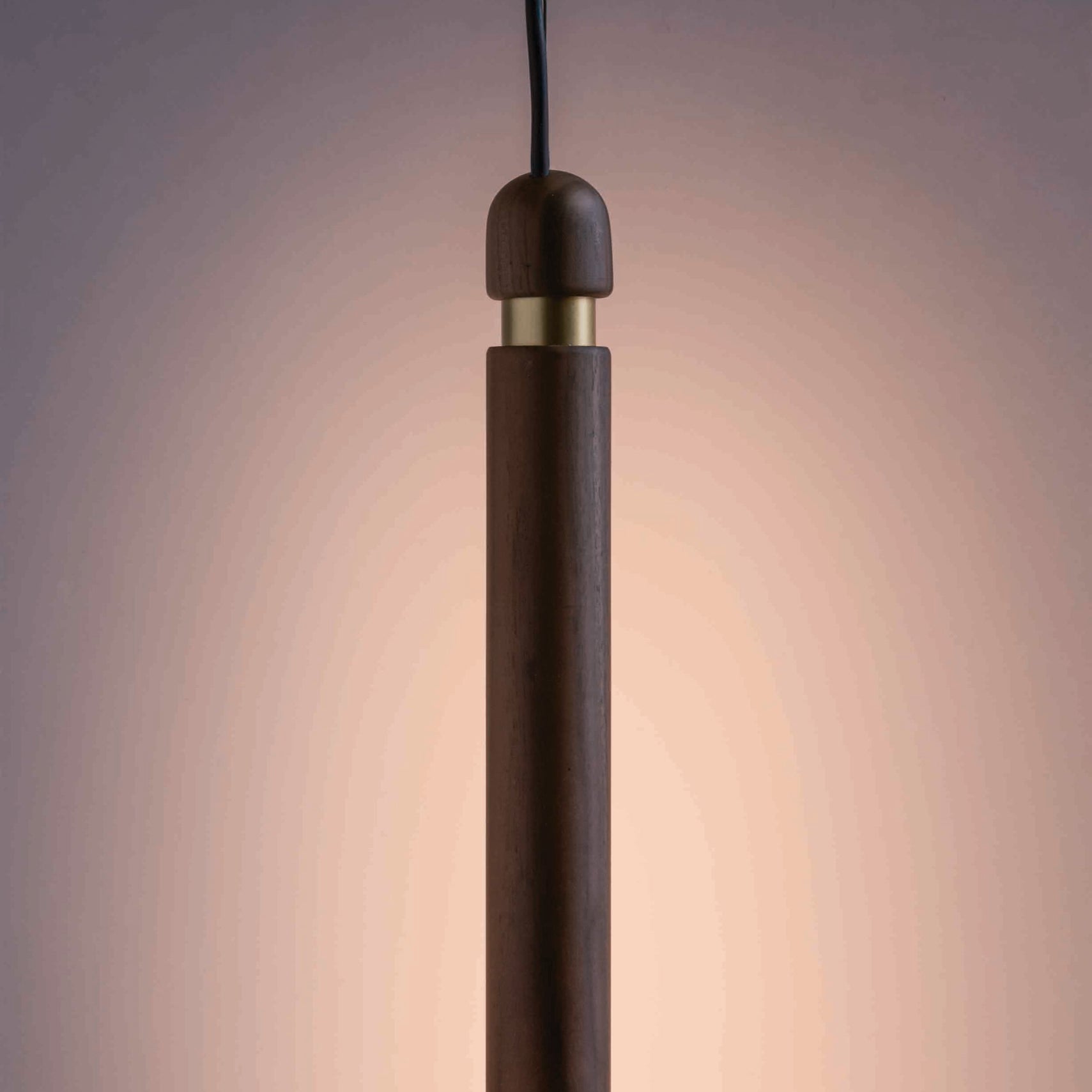 The Linea Suspension Lamp is designed with a natural walnut or oak wood body. Metallic accents complement the wood, adding subtle contrast. Suspended by steel cables, the lamp appears to float, bringing a sense of lightness to the space. It is available in multiple configurations, including horizontal and vertical orientations.