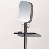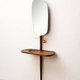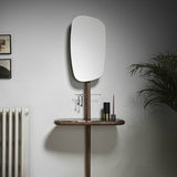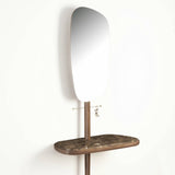 Recibidor casts an elegant gloss with its hallway mirror and catch-all table combo. Fashioned in richly toned solid walnut, the unit's mirror can be oriented either horizontally or vertically and also adjusted in height. Below, a rounded tabletop is available in either the woodgrain or refined Emperador marble. A delicate brass pole for keys or other small items makes for an additional thoughtful touch.