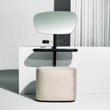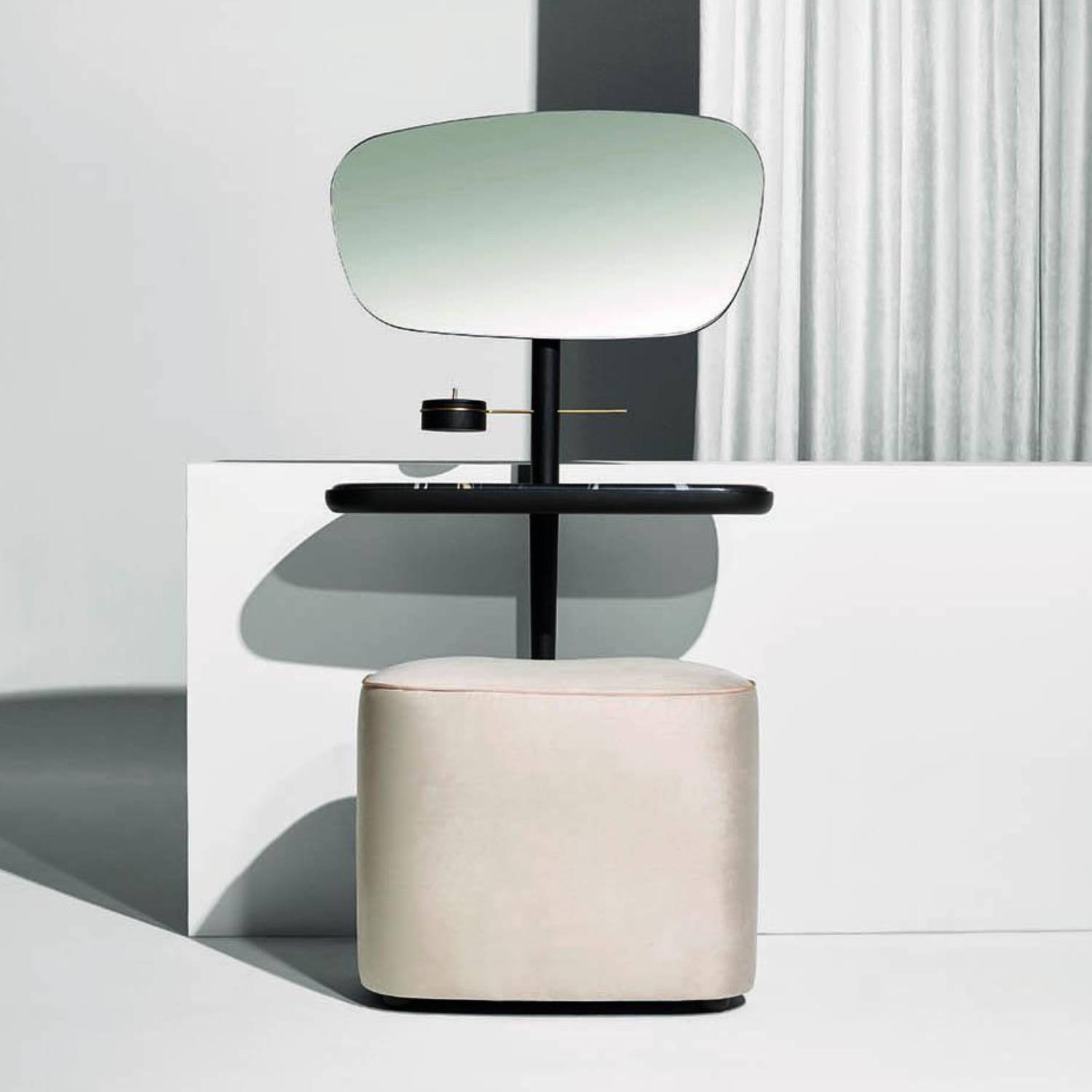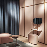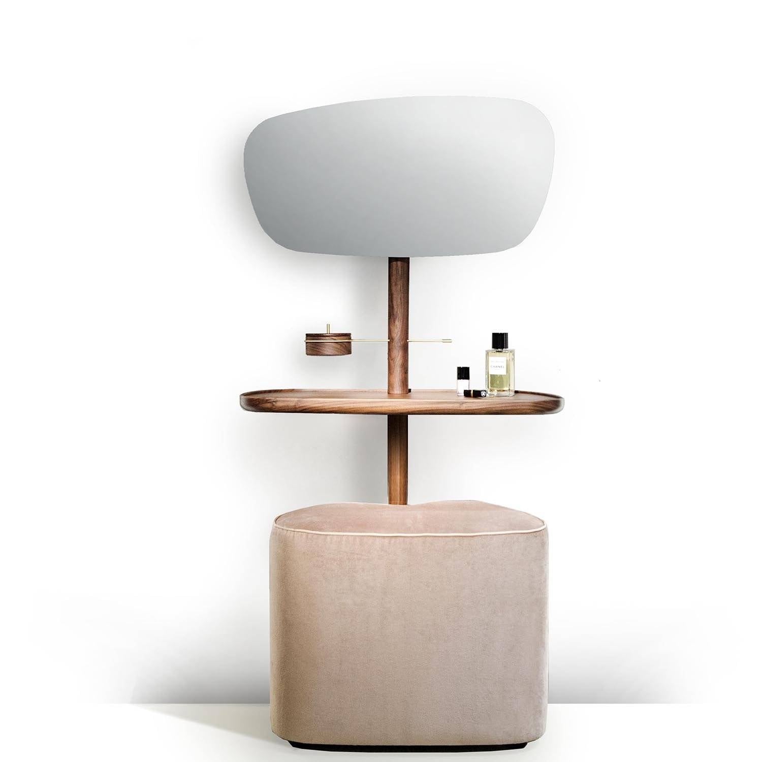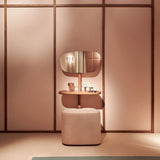 Alluring in its sensual organic shape, this velvet-clad seating adds comfort and functionality to Nomon Home's well-appointed Tocador dressing table. Vanity Pouf comes in a variety of delicate tints—pink, grey or beige, with coordinating silk trim. With a grooved front to accommodate the dressing table's upright, the stool fits snugly against the wall when not in use.