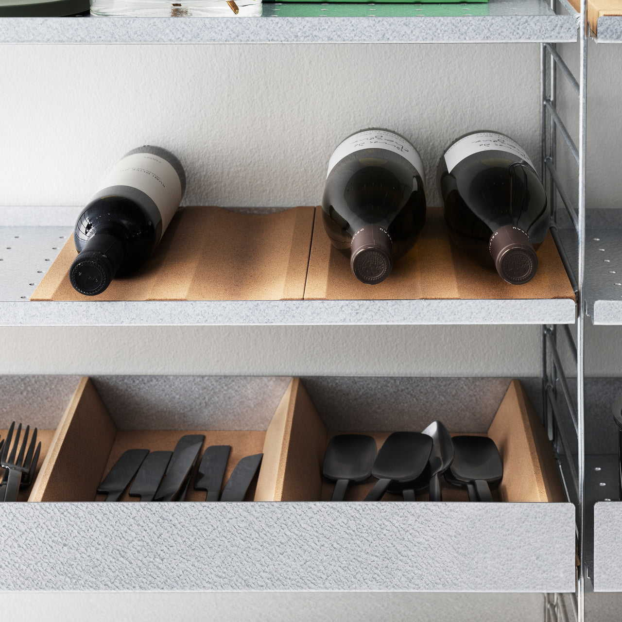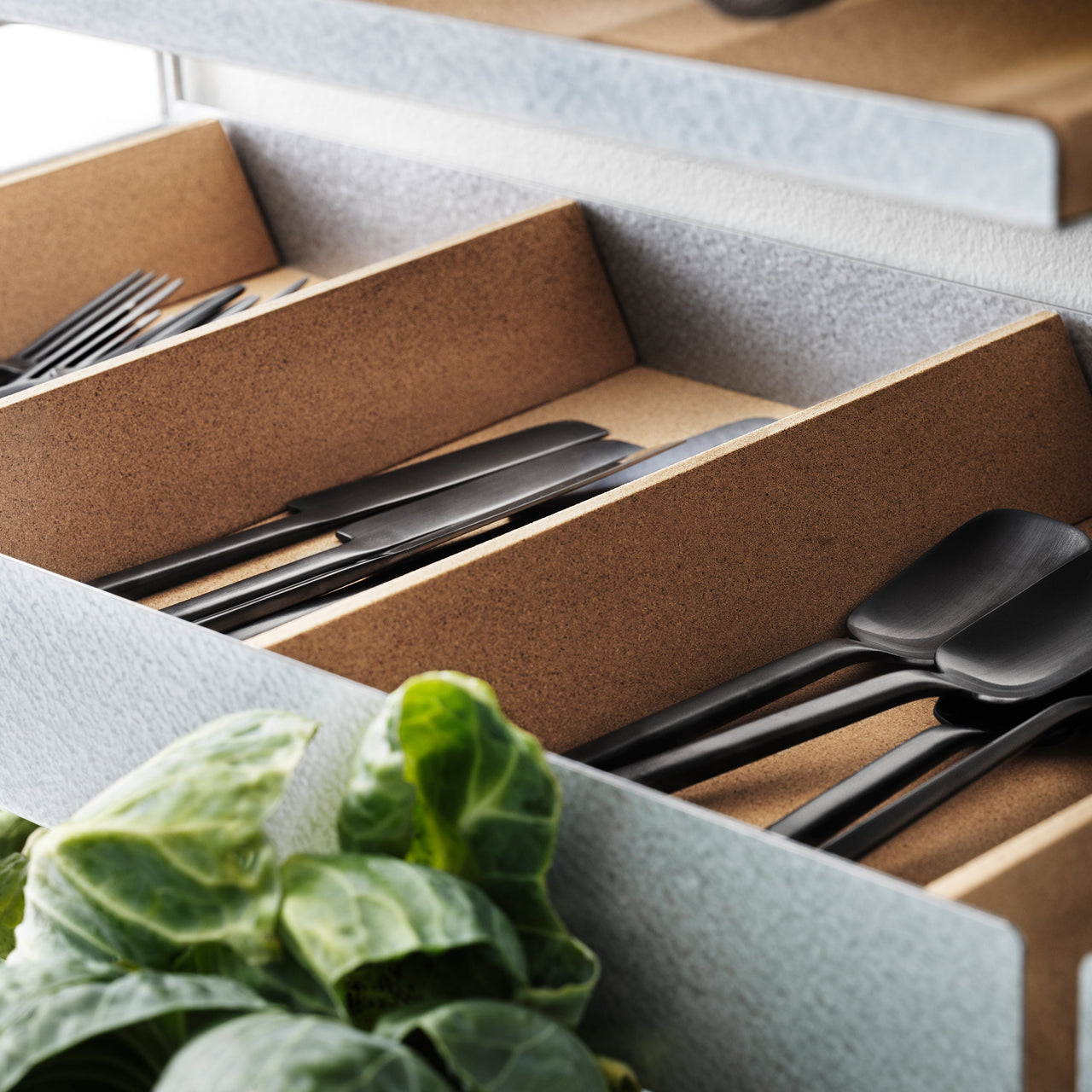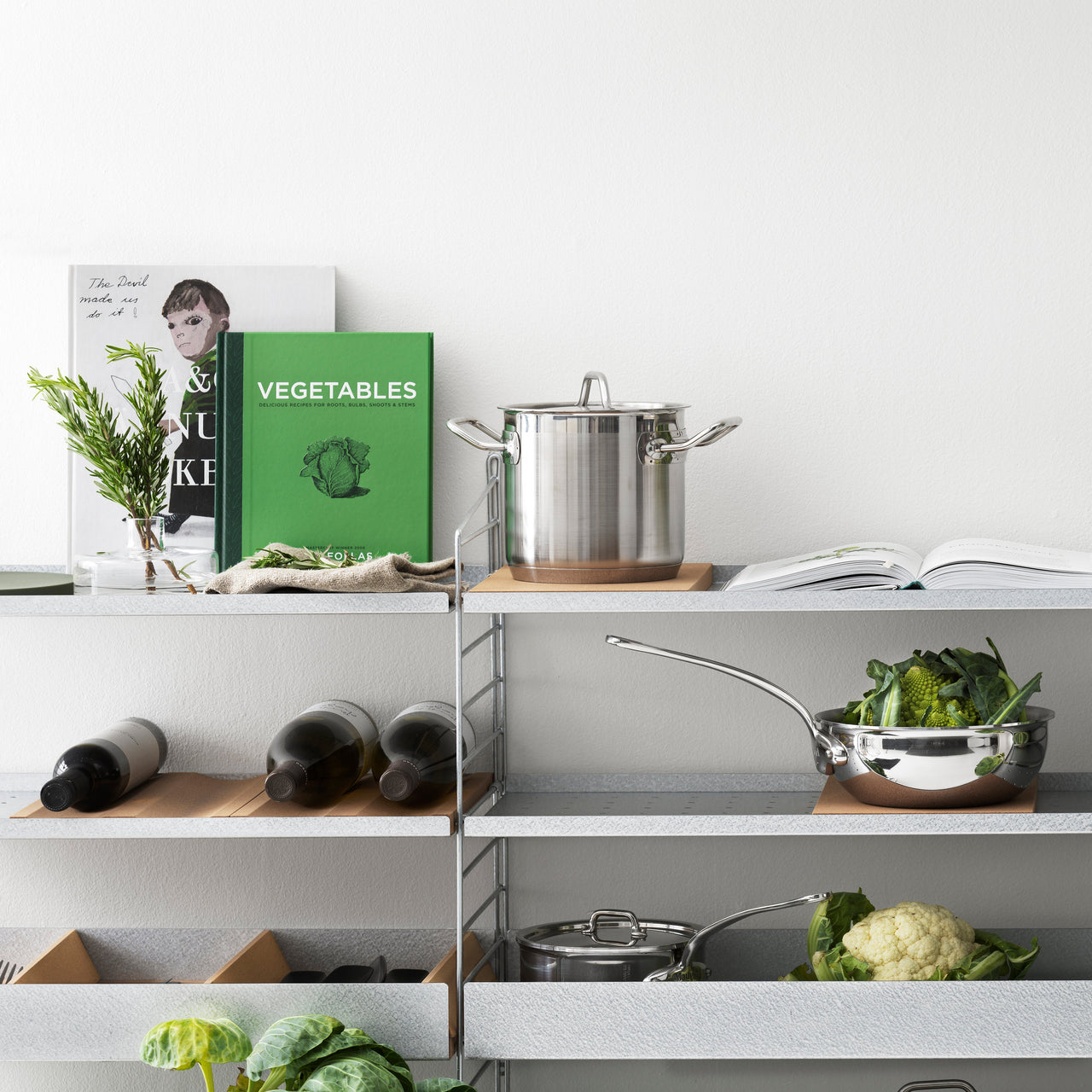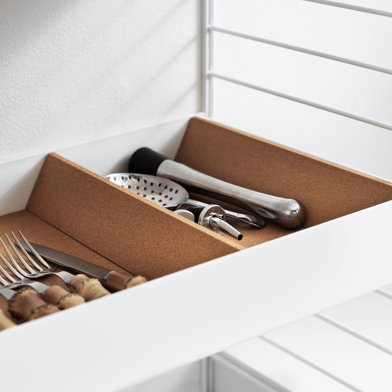 Versatile accessories for any String kitchen setup, the cork underlay and complemdivider offer a host of conveniences. From safely placing hot pots and pans on the cork surface without leaving any marks on the shelf to easily organizing cutlery and other kitchen utensils by adding the dividers—just to name a couple—the uses are endless. And String’s wider shelves can also accommodate multiple underlays side-by-side, holding 3 (58-cm width) or 4 (78-cm width) sections.