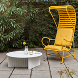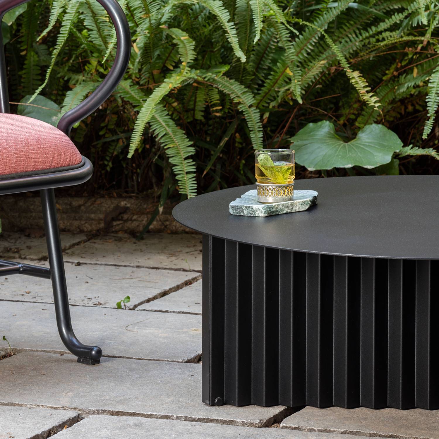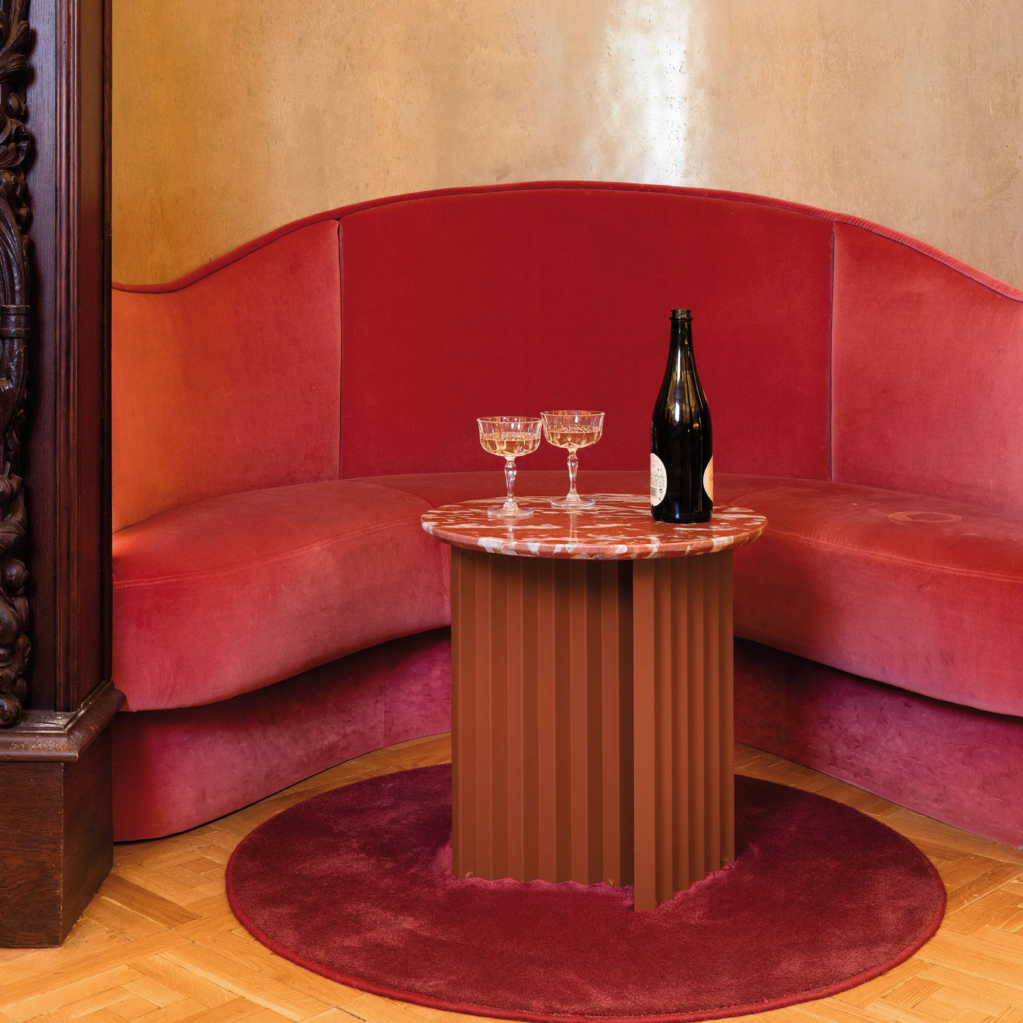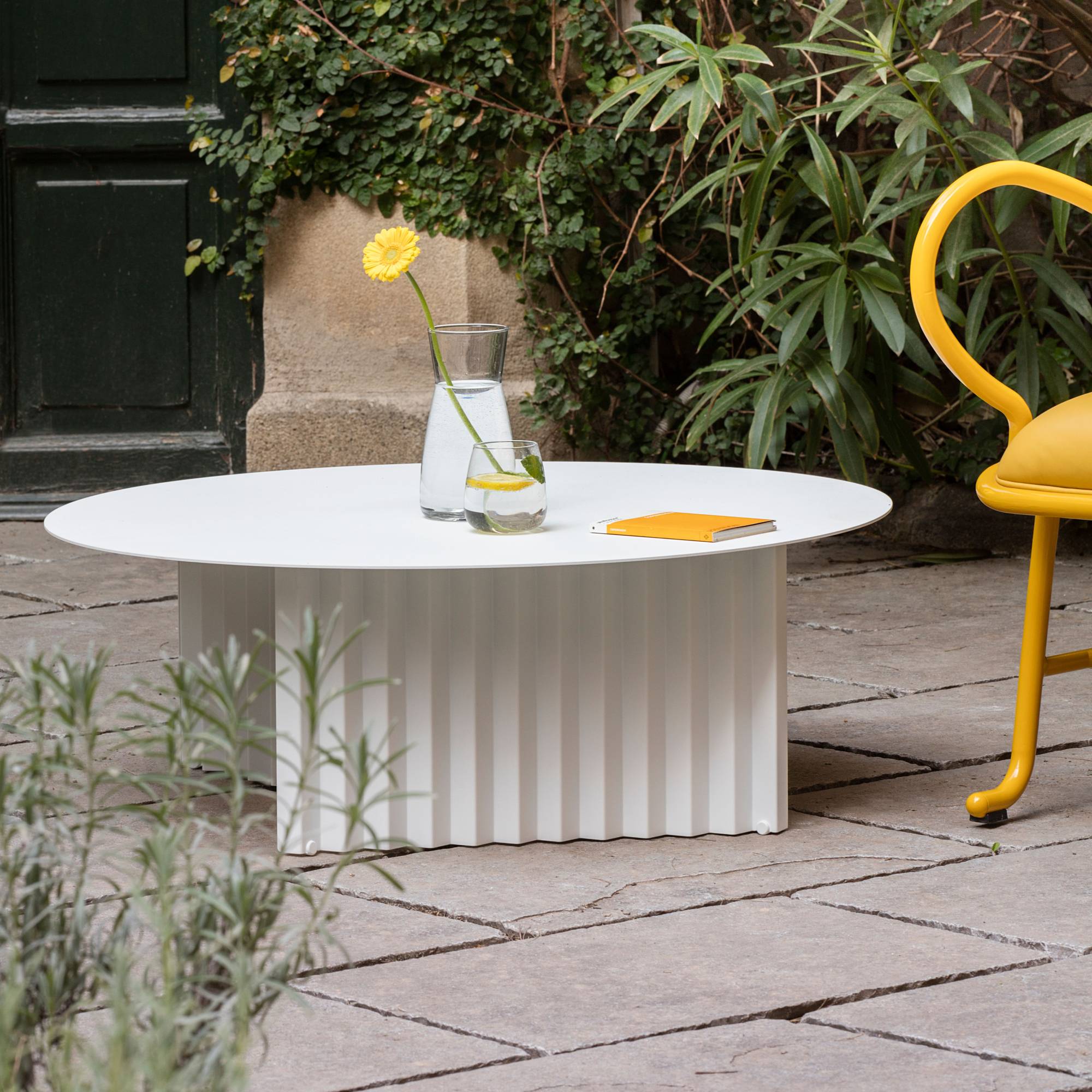 RS Barcelona offers its signature Plec table in a choice of 2 round versions with a squared-off base. With its easily identifiable accordion-pleated motif, the table is completely fabricated of steel with a cataphoretic polyester coating and can be situated indoors or out. The design by Antoni Pallejà Offices also offers a luxe variant in each of the 4 color-ways with a marble top to match